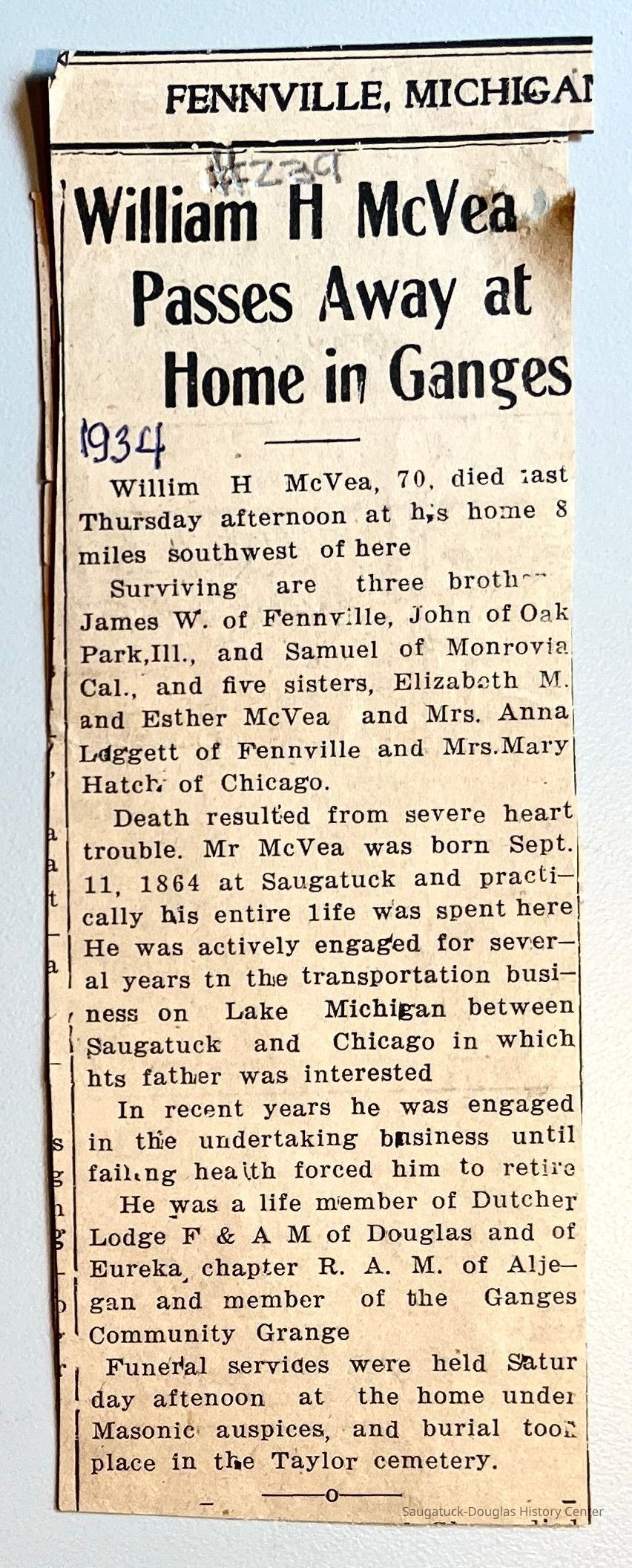 K. Newspaper clippings of obituaries for William H. McVea #239 marked 1934 (photos of front and back)
