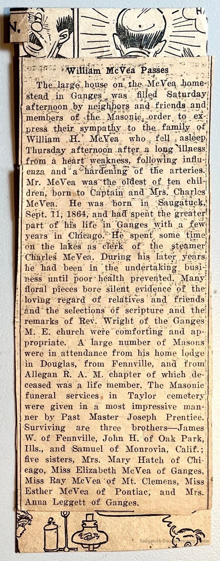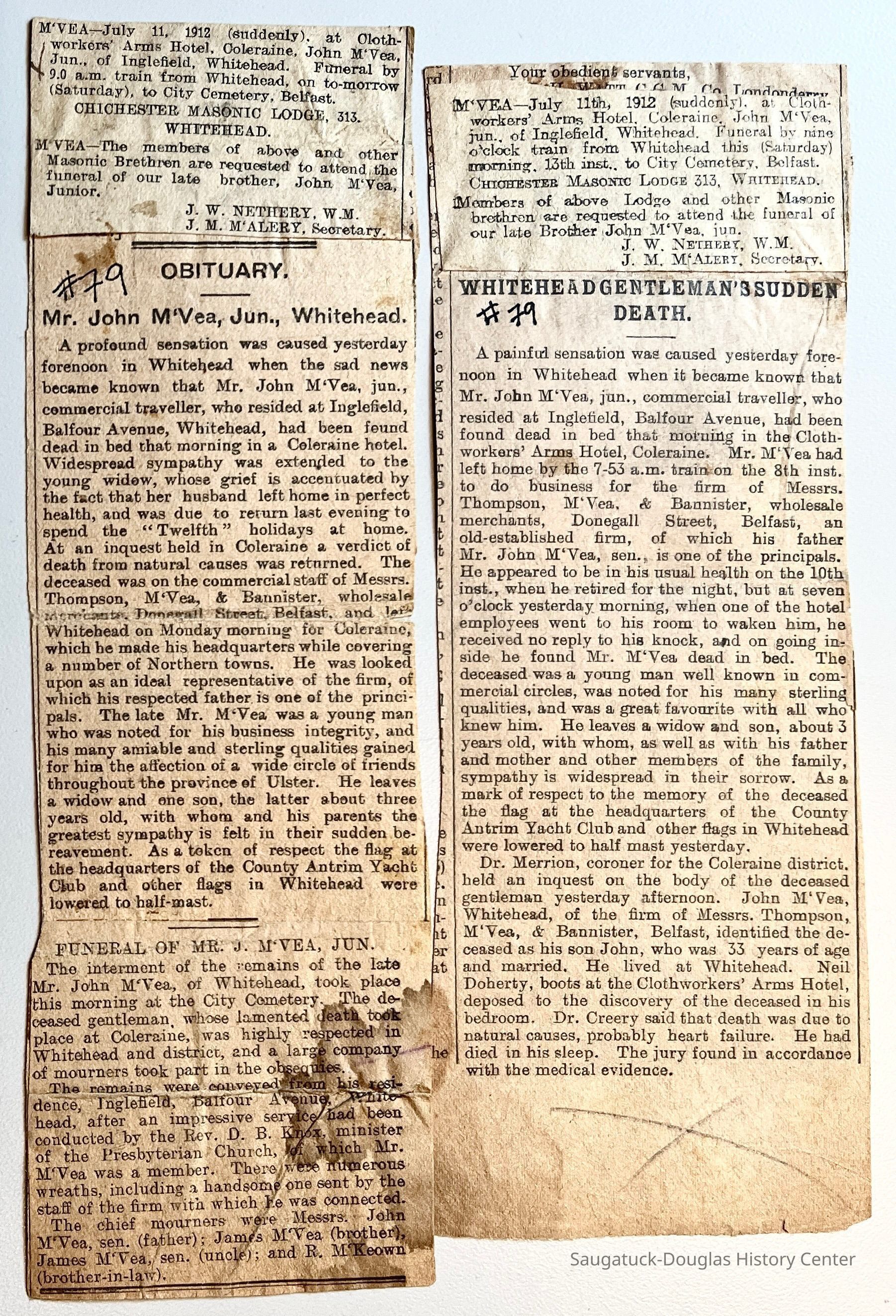 M. Two newspaper clippings of obituaries for John M'Vea #79
