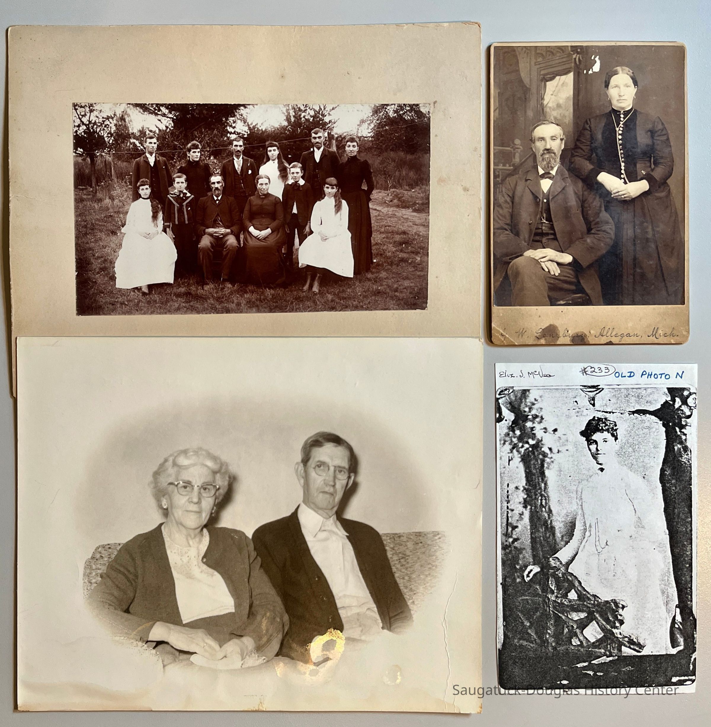A. Portrait of twelve people seating and standing outdoors. Written on back: "Standing: William, Elizabeth, Charles, Rachel, James, Mary. Seated: Esther, Samuel, Father Charles/Mother Elizabeth, John Anna. Sea captain Charles McVea #35, about 1895." Also on back of photo is imprint from photographer "C.M. Billings, View Artist, Fennville, Mich." The photo is 4.5x7.5" and is mounted on a 8x10" board.