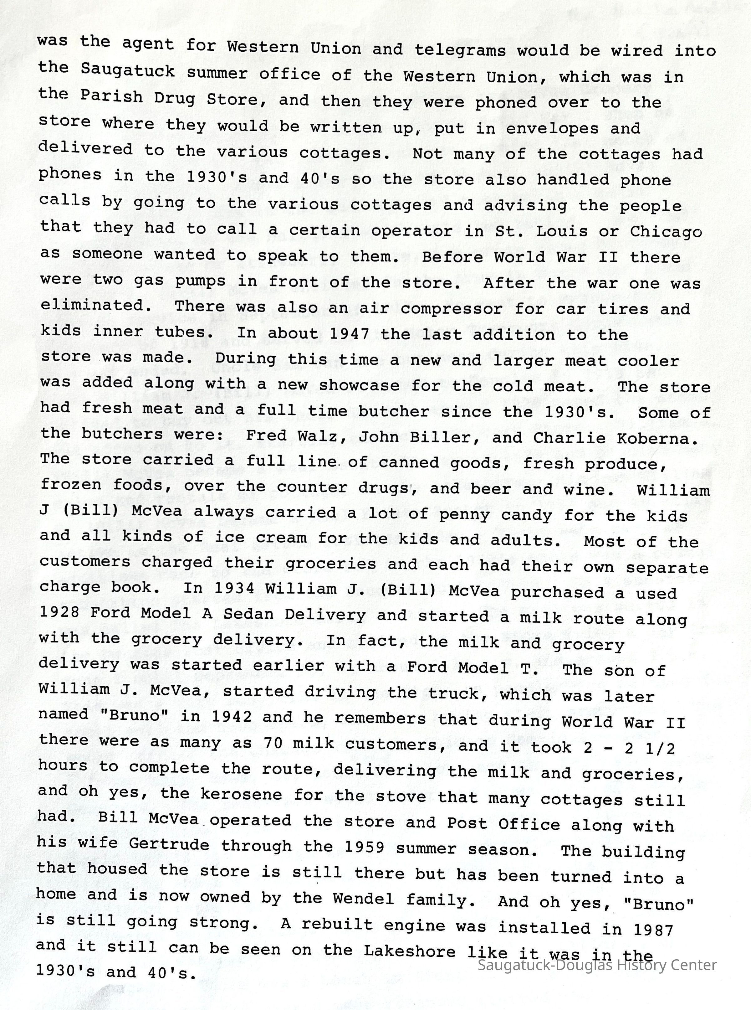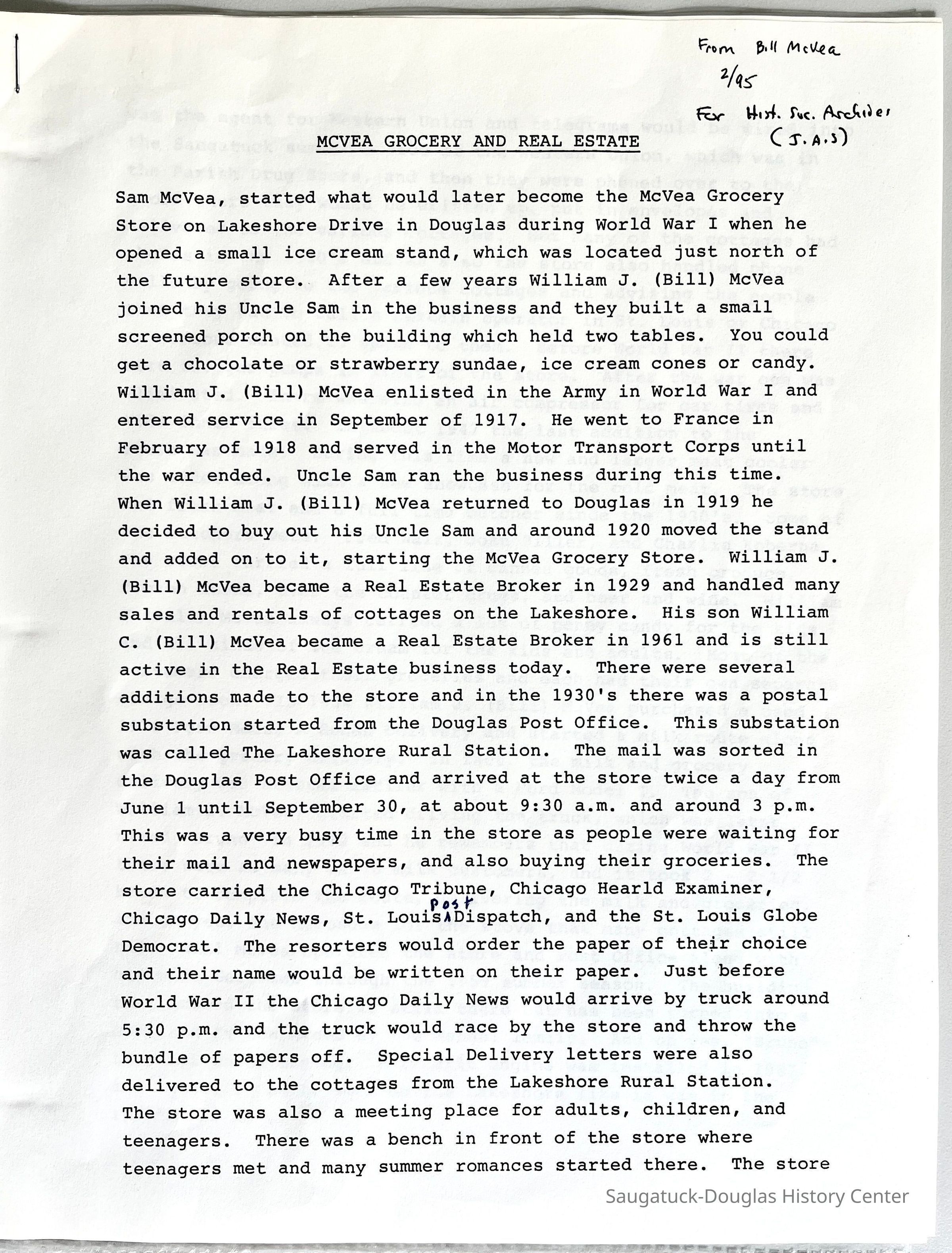 Sam McVea, started what would later become the McVea Grocery Store on Lakeshore Drive in Douglas during World War I when he opened a small ice cream stand, which was located just north of the future store..After a few years William J. (Bill) McVea joined his Uncle Sam in the business and they built a small screened porch on the building which held two tables. You could get a chocolate or strawberry sundae, ice cream cones or candy. William J. (Bill) McVea enlisted in the Army in World War I and entered service in September of 1917. He went to France in February of 1918 and served in the Motor Transport Corps until the war ended. Uncle Sam ran the business during this time. When William J. (Bill) McVea returned to Douglas in 1919 he decided to buy out his Uncle Sam and around 1920 moved the stand and added on to it, starting the McVea Grocery Store. William J. (Bill) McVea became a Real Estate Broker in 1929 and handled many sales and rentals of cottages on the Lakeshore. His son William C. (Bill) McVea became a Real Estate Broker in 1961 and is still active in the Real Estate business today. There were several additions made to the store and in the 1930's there was a postal substation started from the Douglas Post Office. This substation was called The Lakeshore Rural Station. The mail was sorted in the Douglas Post Office and arrived at the store twice a day from June 1 until September 30, at about 9:30 a.m. and around 3 p.m. This was a very busy time in the store as people were waiting for their mail and newspapers, and also buying their groceries. The store carried the Chicago Tribune, Chicago Hearld Examiner, Chicago Daily News, St. Louis Post Dispatch, and the St. Louis Globe Democrat. The resorters would order the paper of their choice and their name would be written on their paper. Just before World War II the Chicago Daily News would arrive by truck around 5:30 p.m. and the truck would race by the store and throw the bundle of papers off. Special Delivery letters were also delivered to the cottages from the Lakeshore Rural Station. The store was also a meeting place for adults, children, and teenagers. There was a bench in front of the store where teenagers met and many summer romances started there. The store