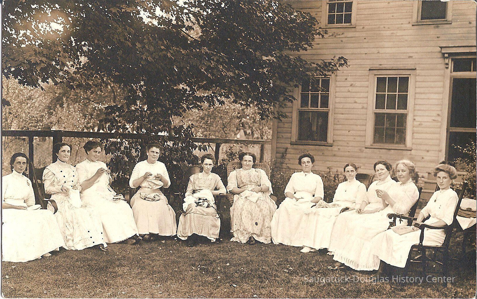 A group of women in summer dresses working on needlework in front of the Mc Vea house.Collection