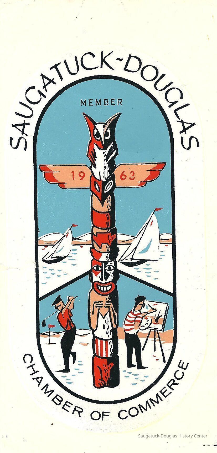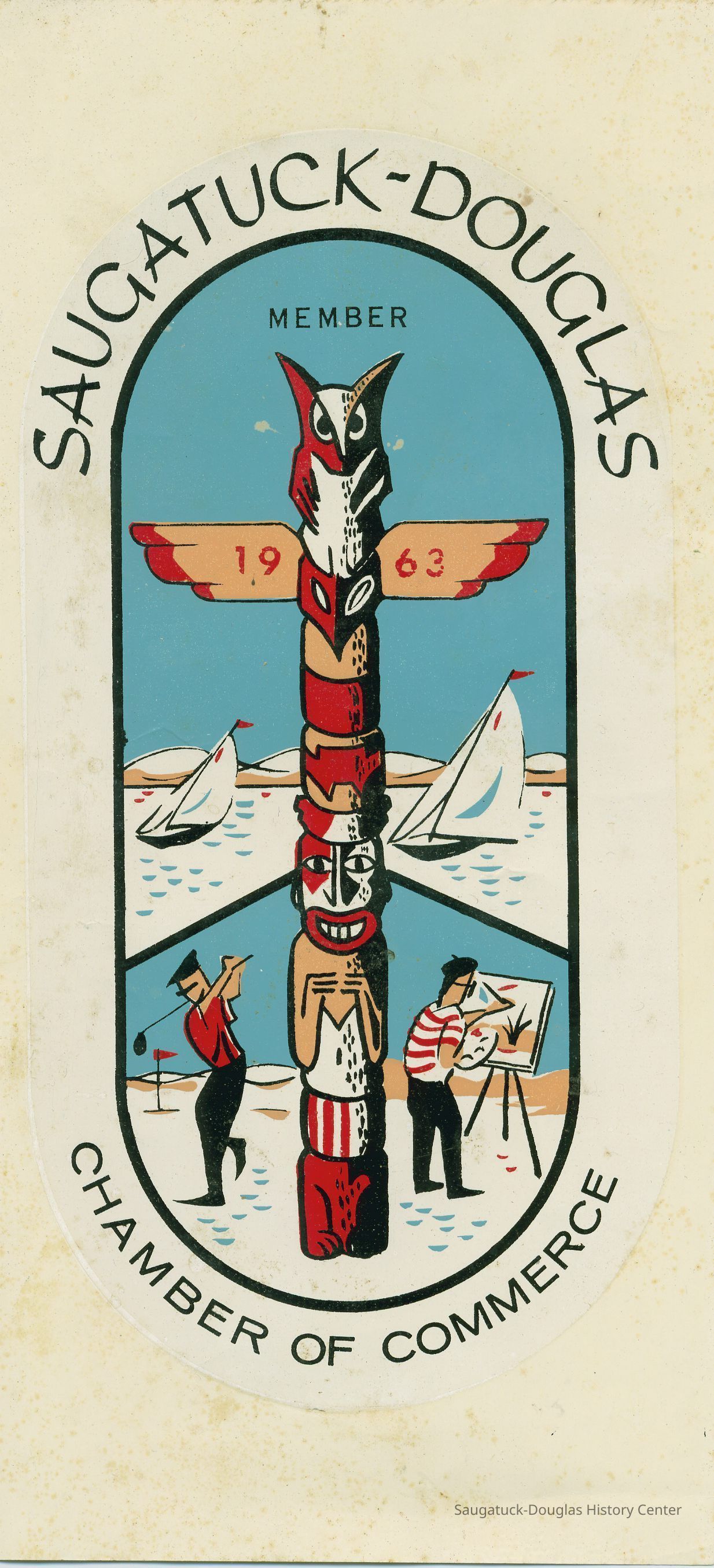 Four color decal given out by the Chamber of Commerce in 1963 to their members. This was displayed in the store windows to show the public that they were members. It depicts a totem-pole with sailboats, dunes, and two men. One an artist and one playing golfCollection