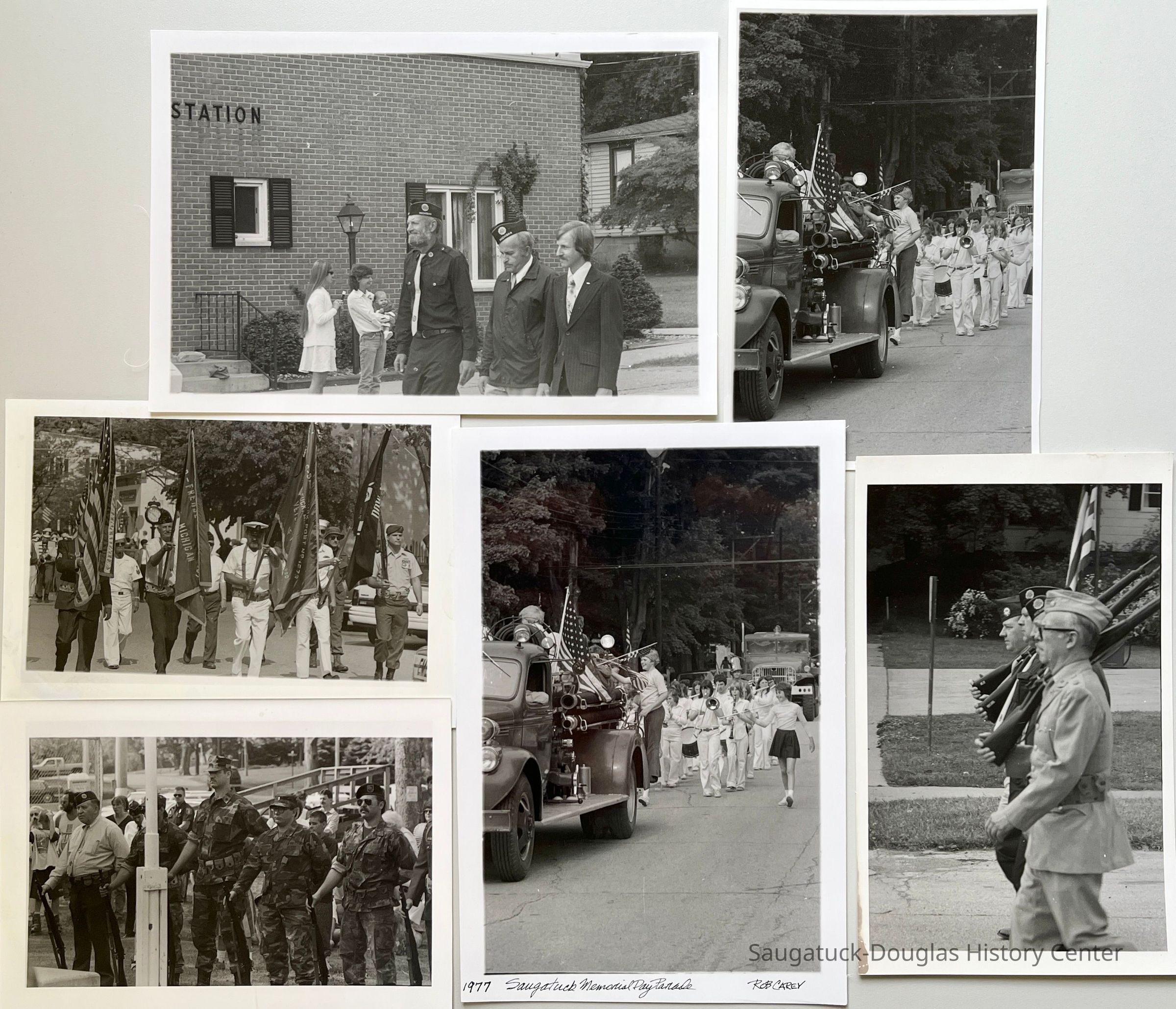 Photographs taken by Rob Carey of Memorial Day parades and commemorations showing veterans and armed service members in uniform, flag color guard 1994, marching bands and fire trucks in 1977.