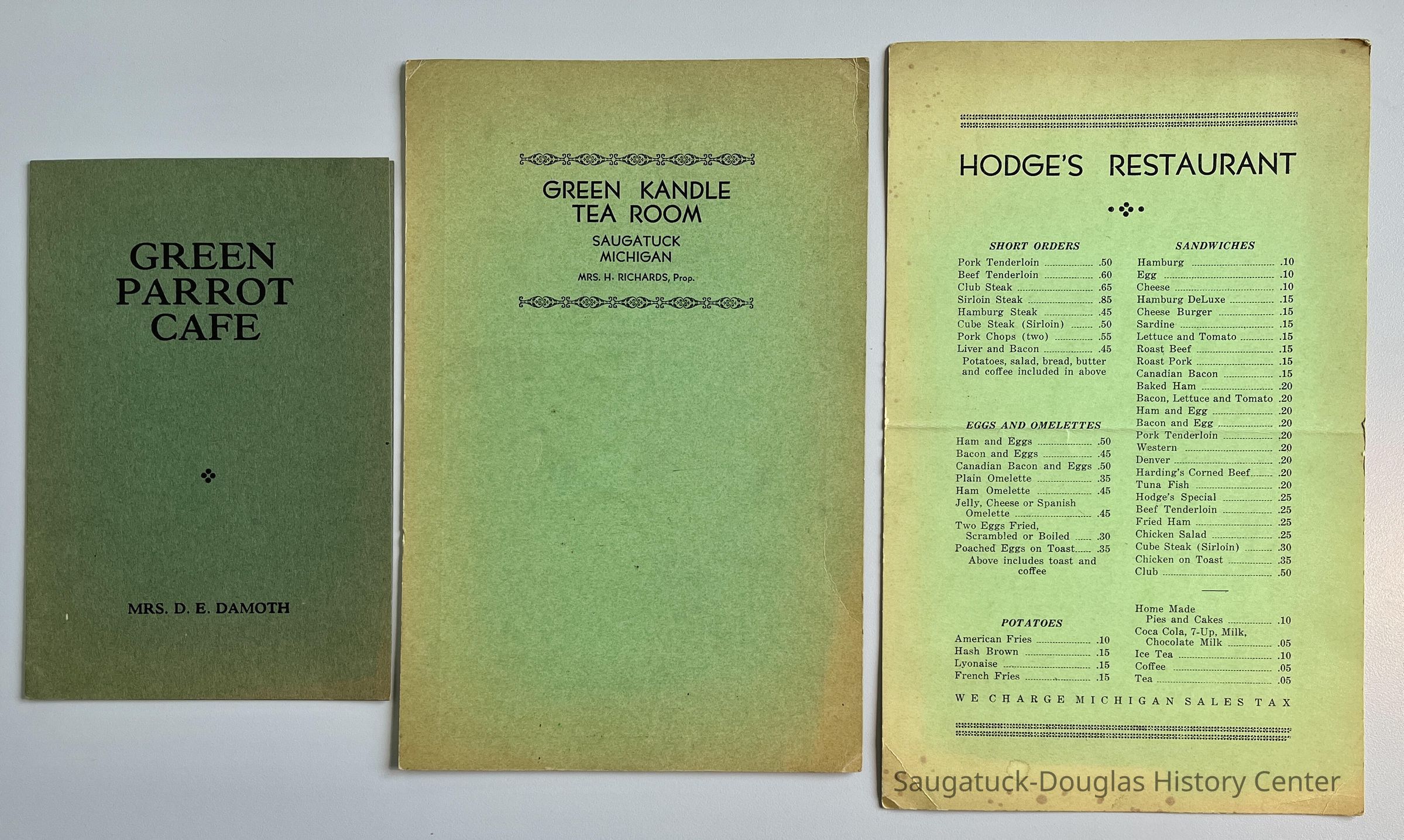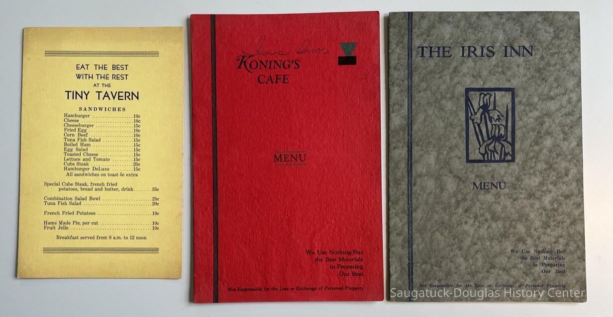 Menus from the Corner Shop, Terrace Park Tavern, Tara, Green Parrot Cafe, Green Kandle Tea Room, Iris Inn, Tiny Tavern, West Shore Golf Links, Terrace Park Tea Room, Koning's Cafe and Hodge's restaurantContext
