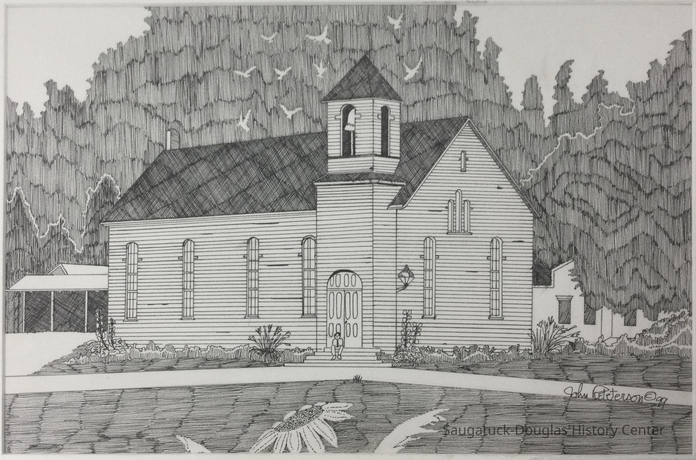 Ink drawing of the Methodist Episcopal Church by John Peterson. Matted and shrink wrapped.Type of Drawing