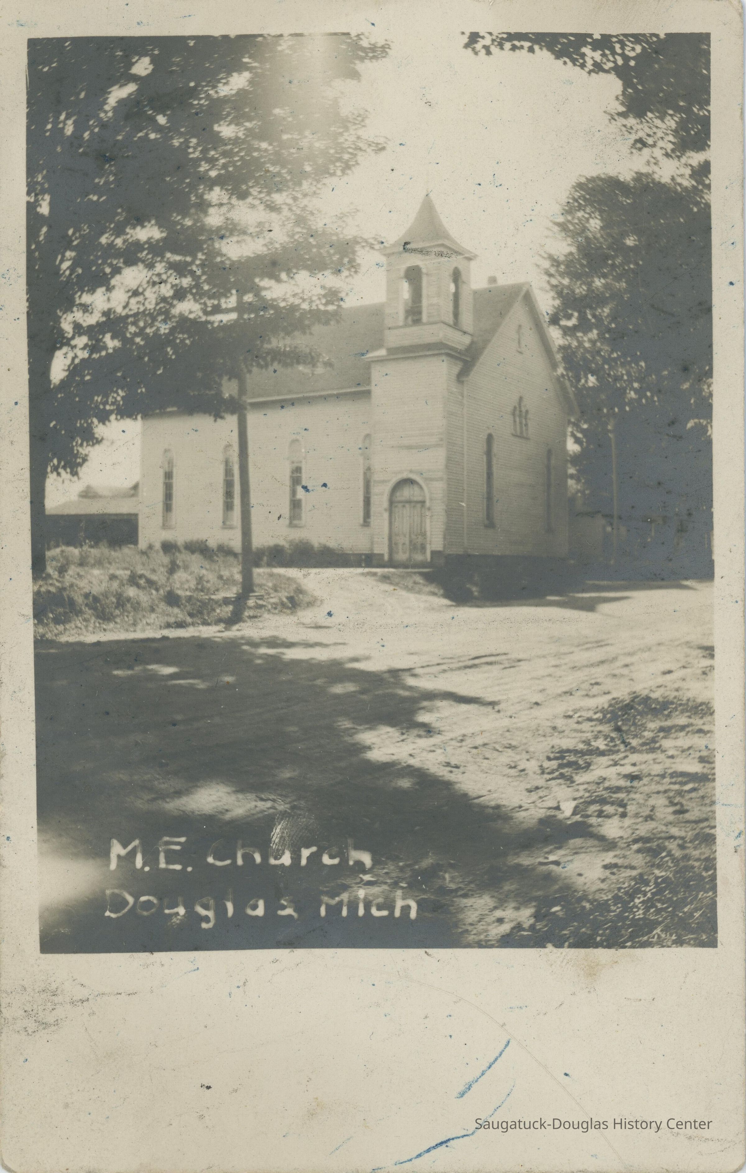 A black and white postcard showing the Methodist Episcopal Church on a dirt road. Attached to the left side of the entrance is the belfry.Subject