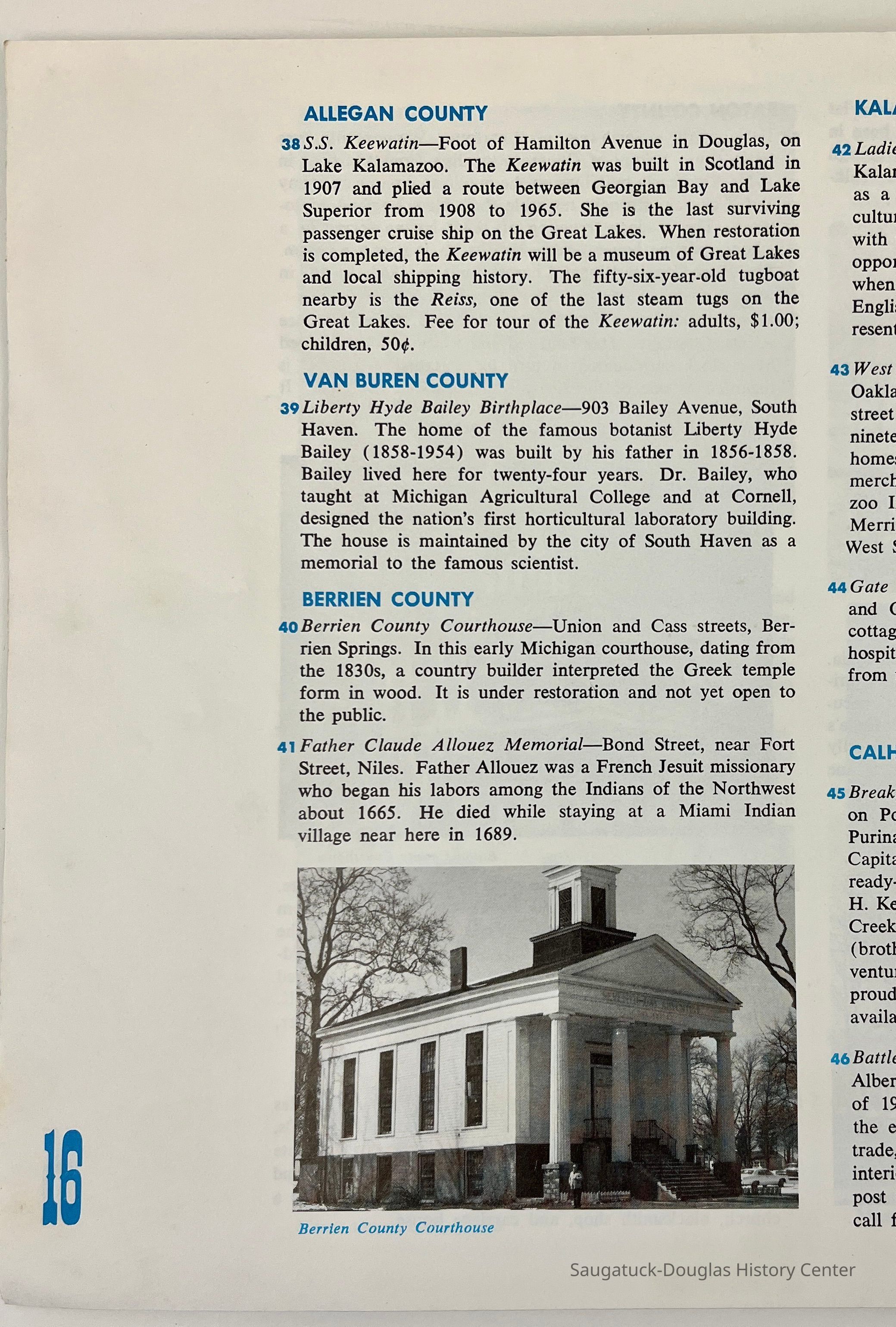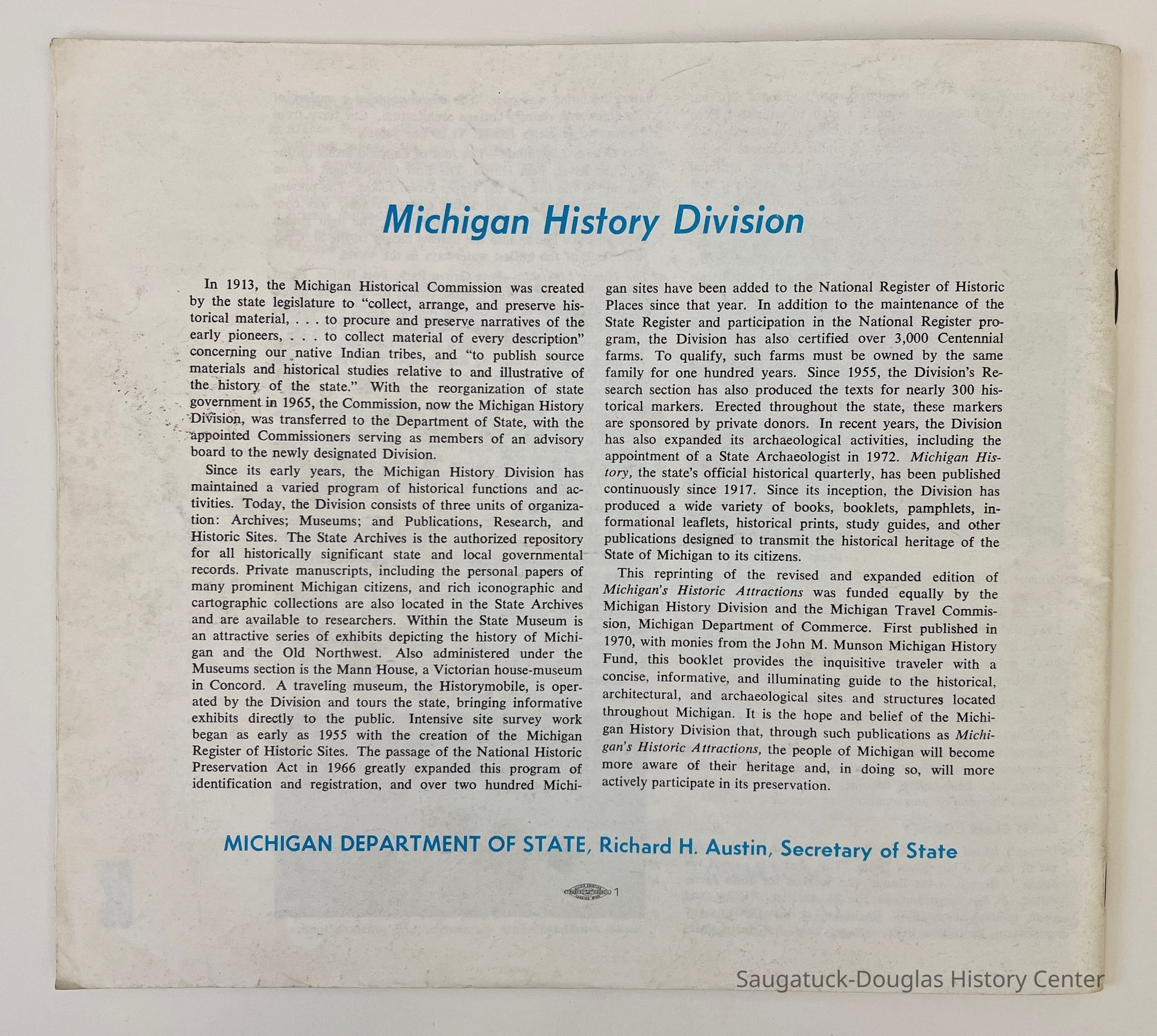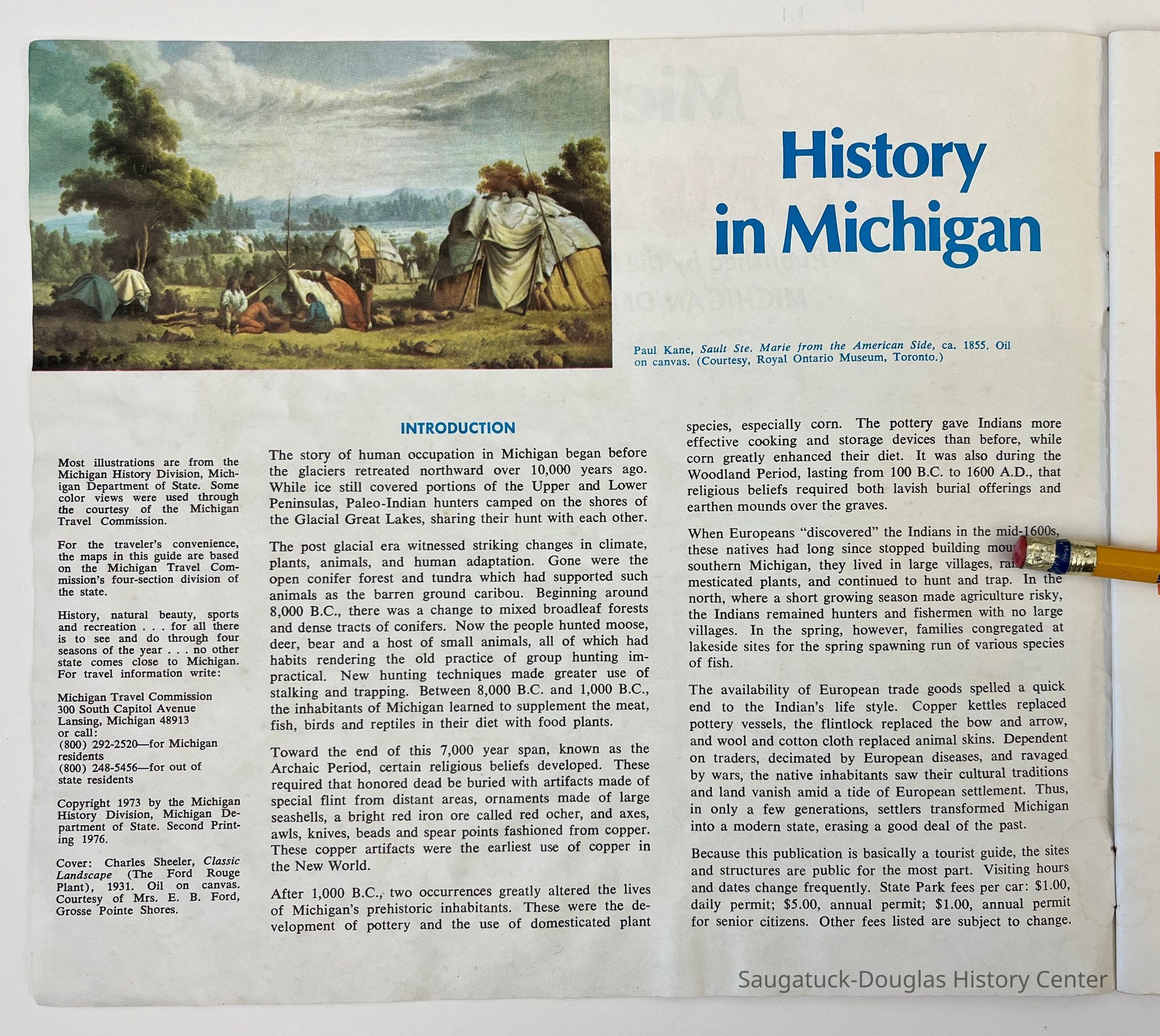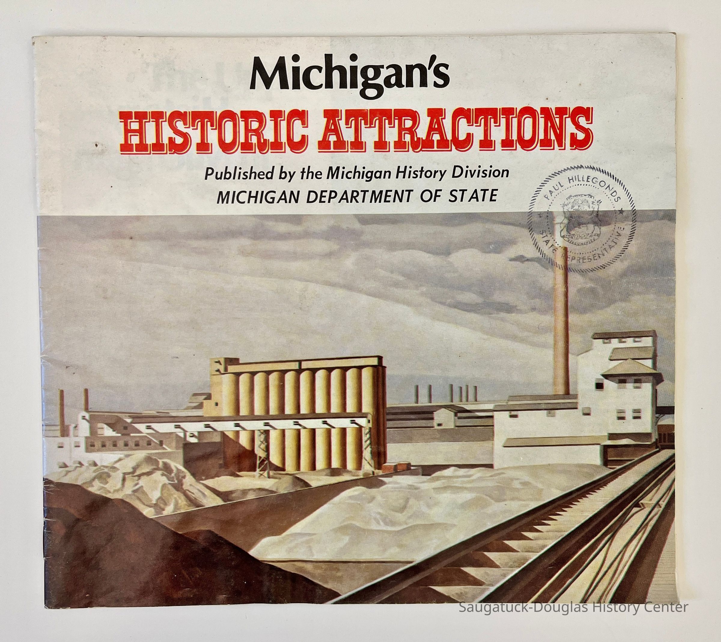 Booklet published by the Michigan History Division, Michigan Department of State. The cover has an oil painting of the Ford Rouge Plant, by Charles Sheeler, 1931, and a stamp from State Representative Paul Hillegonds. The text has a historical overview of the state, regional maps and travel guide highlights for every county. The lone entry for Allegan County is the S.S. Keewatin on page 16. The back cover has information about the Michigan History Division.