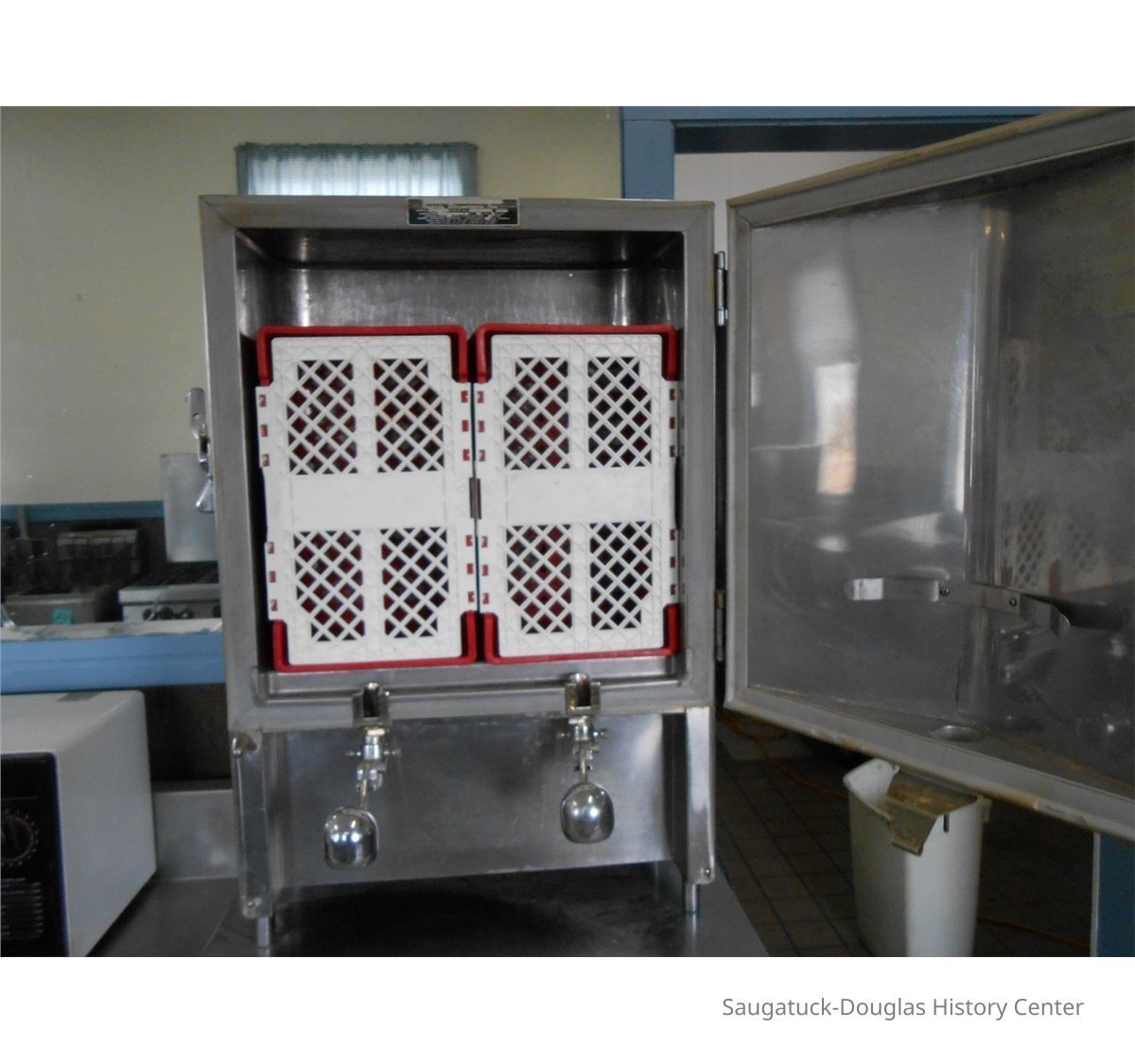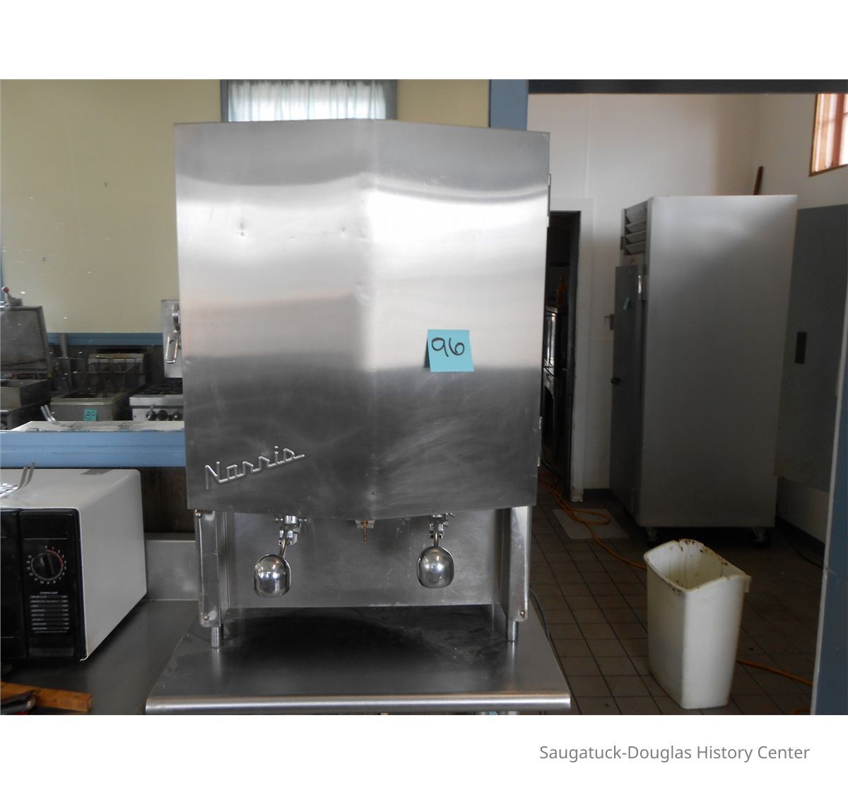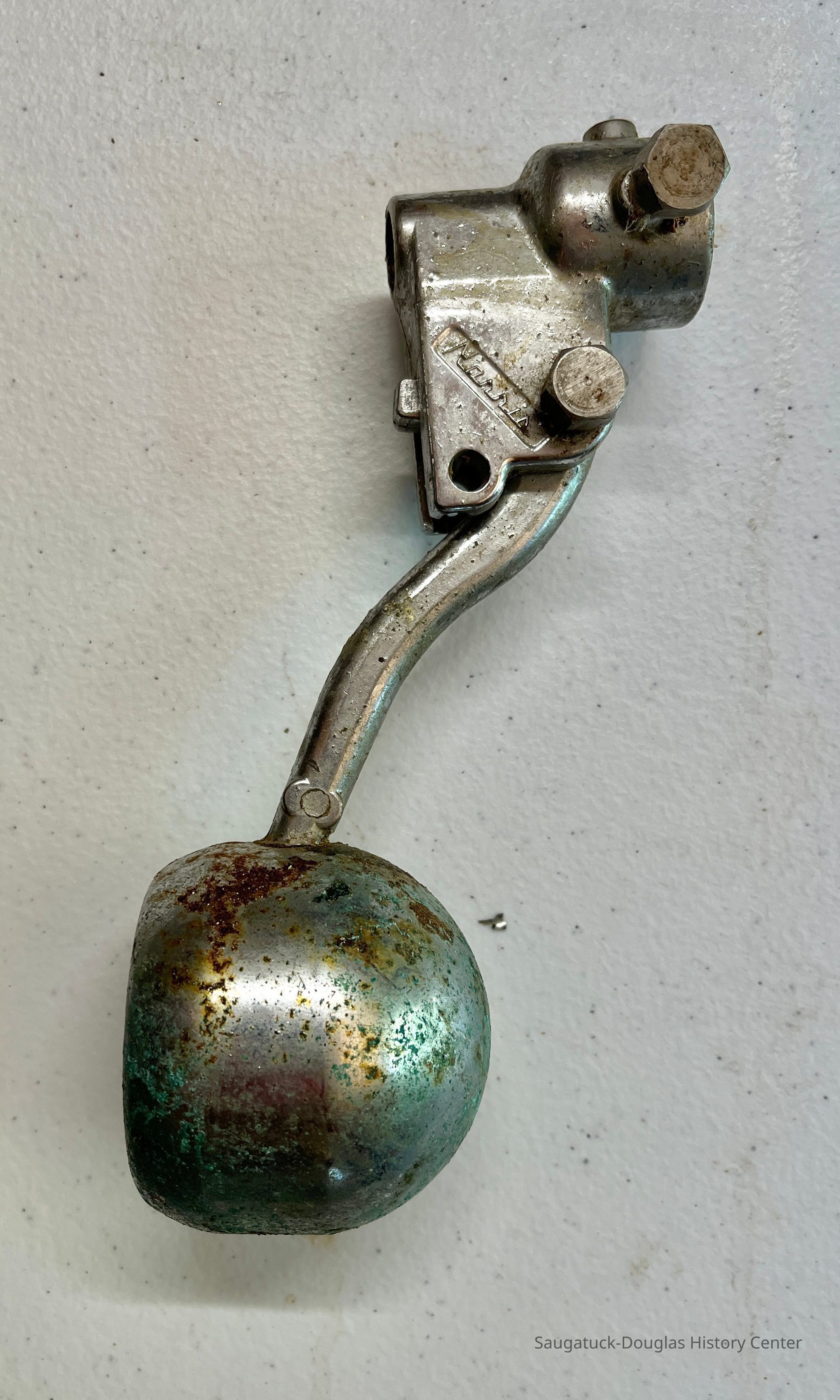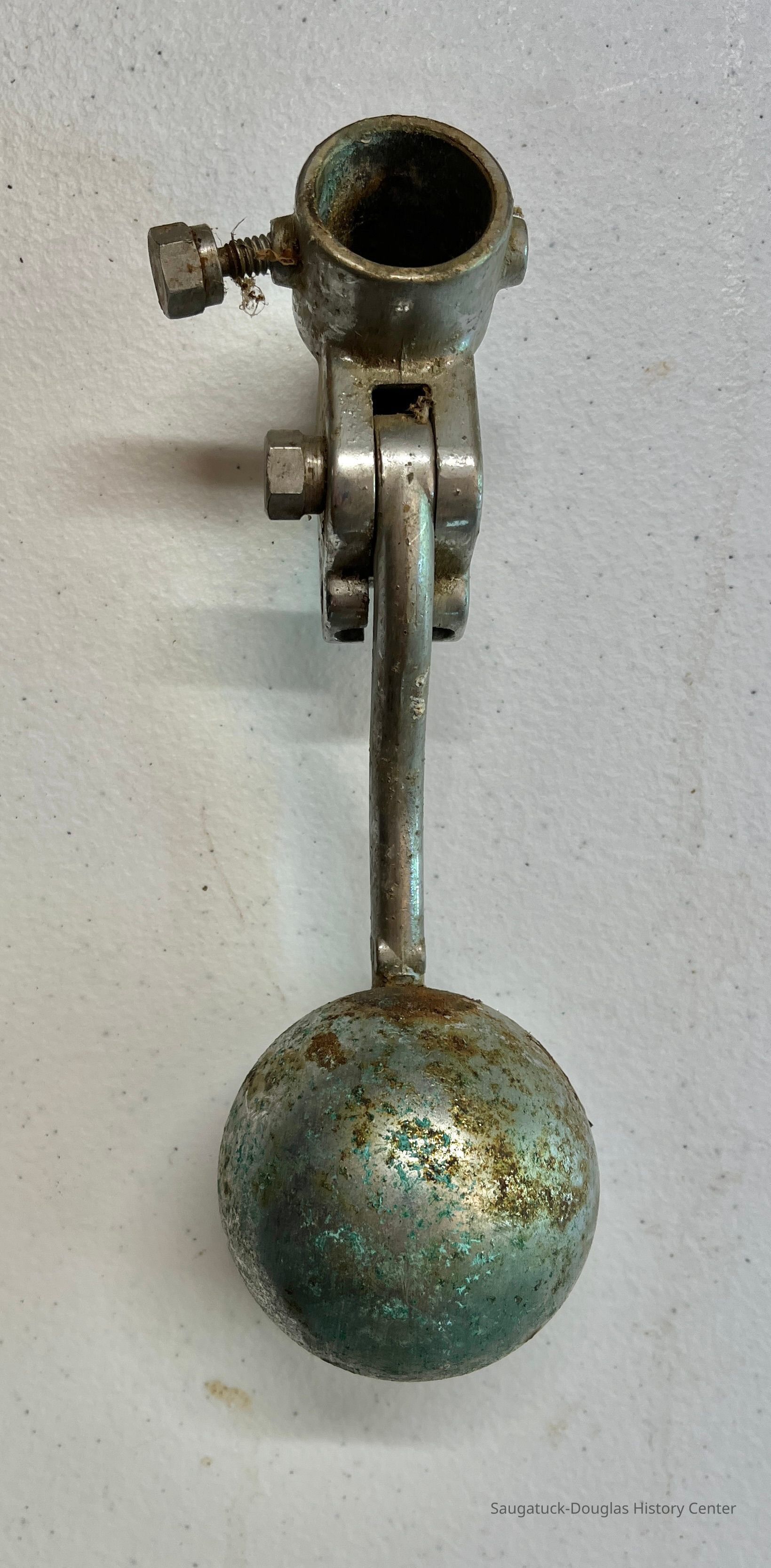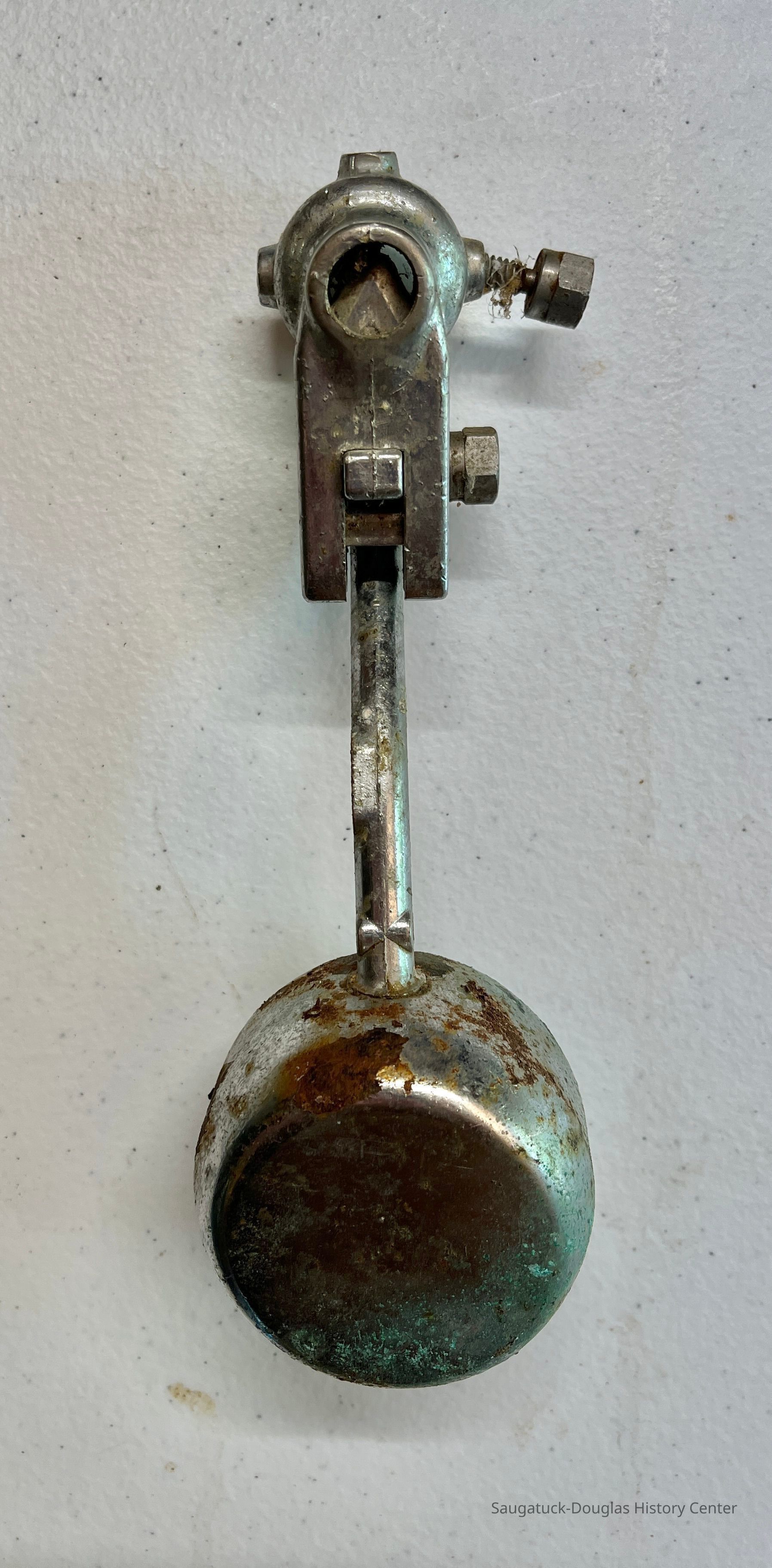 This device allowed workers to dispense milk using only one hand and without having to open the refrigerator, thus keeping the milk at a more constant temperatur. The worker held a cup under the dispenser and use their forearm to lift the weight and dispense the milk. This part was found at the Douglas Root Beer Barrel when the building was being restored. The barrel served milkshakes.Collection