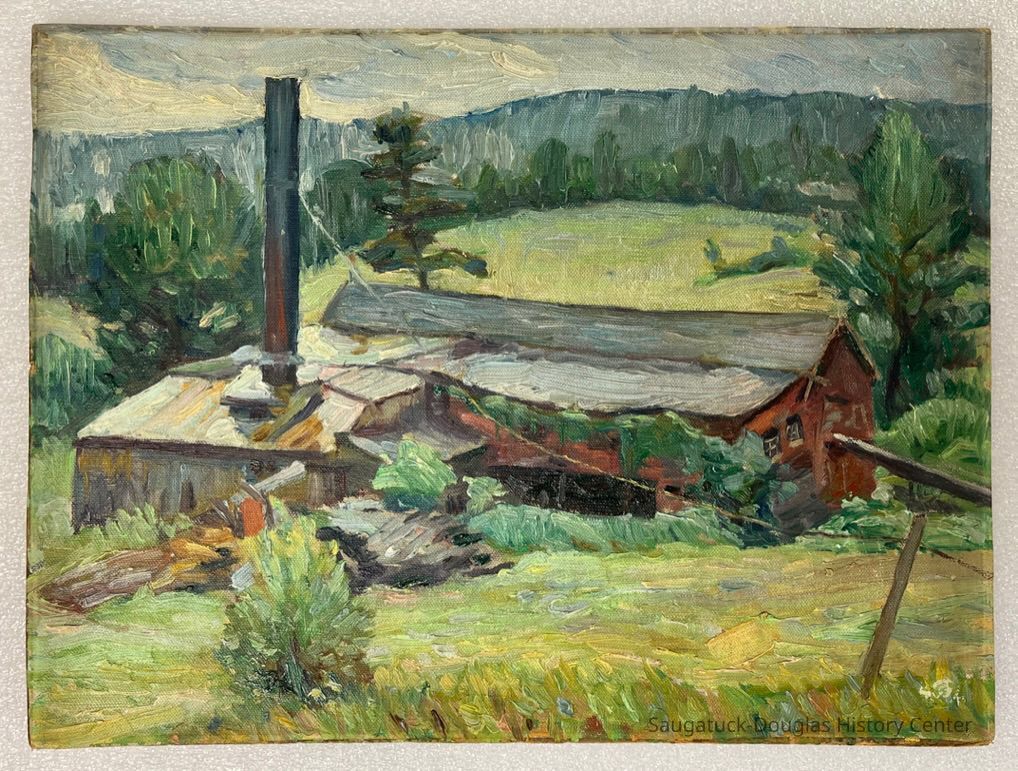 Side one is covered by an oil painting of a factory or mill building with a large smokestack.