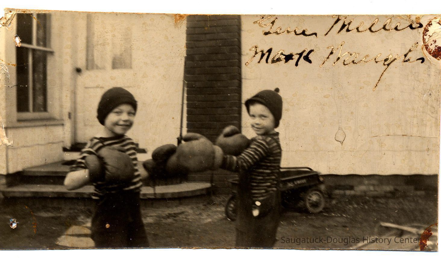 Two boys in striped shirts and knitted caps face off with adult-size boxing gloves. The boys are standing outside a residence with a wagon in the background. Boys identified as Gene Miller and Mark WaughPhotograph Details