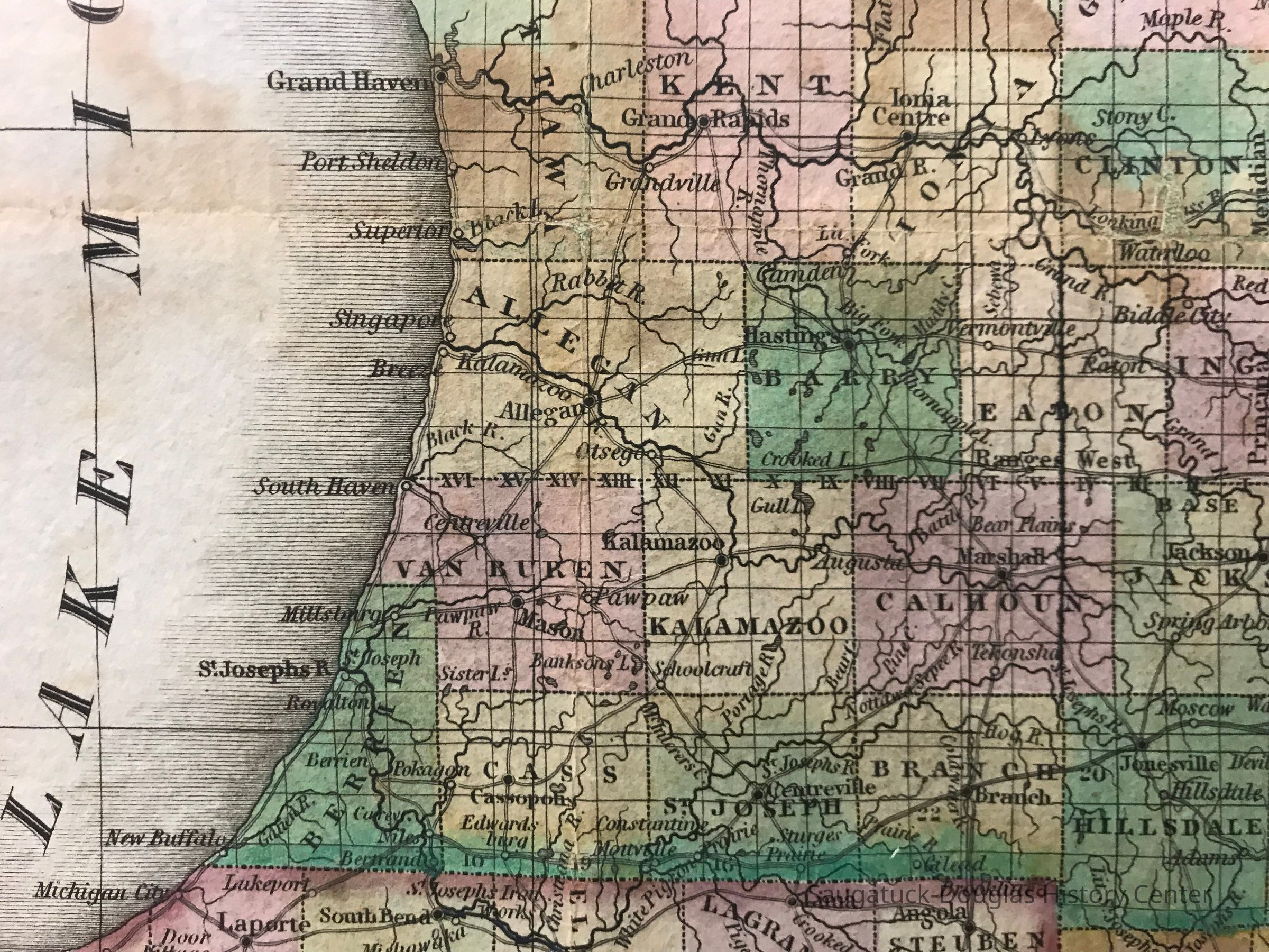 Look carefully at the map: you may identify the Kalamazoo River and the county seat of Allegan. You may also read the name Singapore, the infamous “ghost town” established in 1836 and abandoned in 1875 near Saugatuck. Also marked is the phantom settlement of Breeze on the south shore of the Kalamazoo River despite no place existing with that name. Neither Saugatuck or Douglas appear on this map.