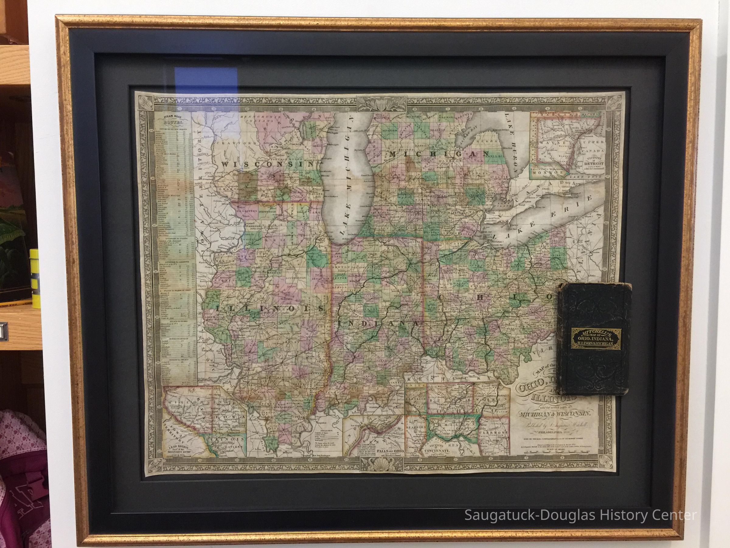 In 1834, Philadelphia geographer and publisher Samuel Augustus Mitchell purchased the printing plates from A. Finley’s 1825 map of the Midwest region in A New American Atlas. He revised it with newly compiled federal surveys to produce this folding traveler’s map revised with roads, railroads, a table of steamboat routes, and insets of Detroit, Cincinnati, the falls of Ohio, and the Wisconsin-Illinois border.