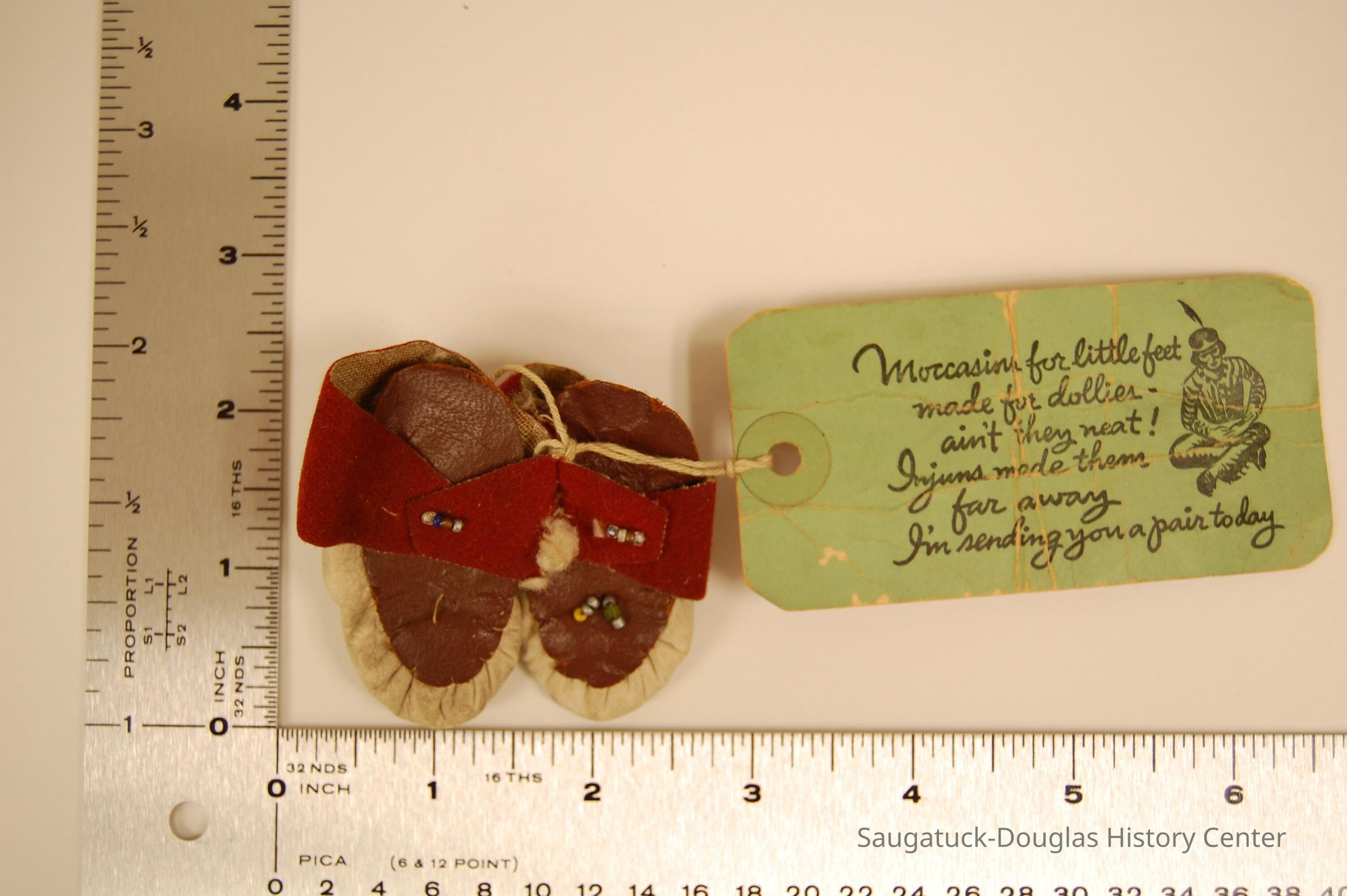 Toy moccasins with a light brown leather bottom and dark brown leather top. There is a red strap over each moccasin with three beads sewn in. There is a green note tied onto the moccasins saying "Moccasins for little feet made for dollies ain't they neat! Injuns made them far away I'm sending you a pair today."Collection