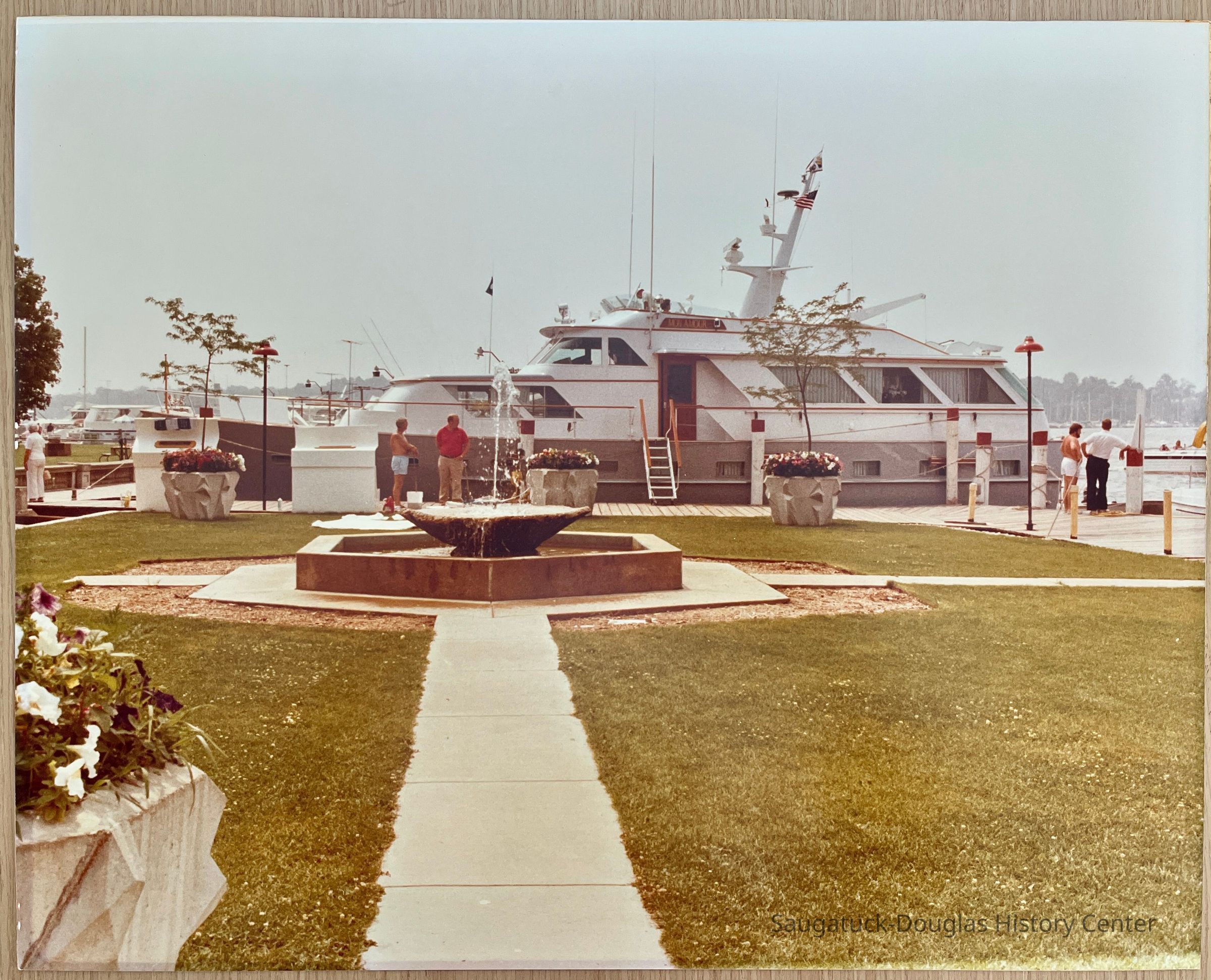 Large cruiser-style yacht docked along the river with the Coral Gables fountain and lawn with massive, approaching-Brutalist, faceted cement flower planters in the foreground. The yacht has a sign that reads "Mon Amour." Clothing styles suggest photo is from 1970s or 1980s.Photograph Details