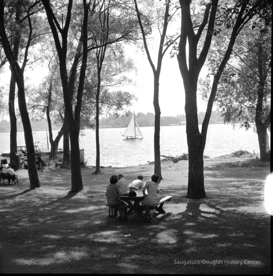 Four people seated on a picnic table under the shade of tall trees. In the distance a boat in full sail crosses Lake Kalamazoo. Morrison may be Cook Park.