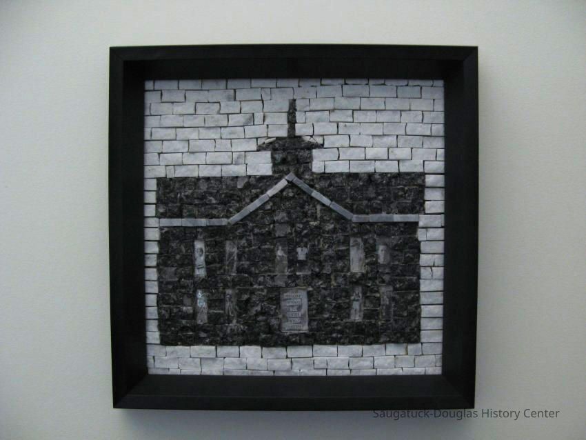 This collage depicts the Douglas School House using black, white and gray tiles. It is held in a black frame.Collection