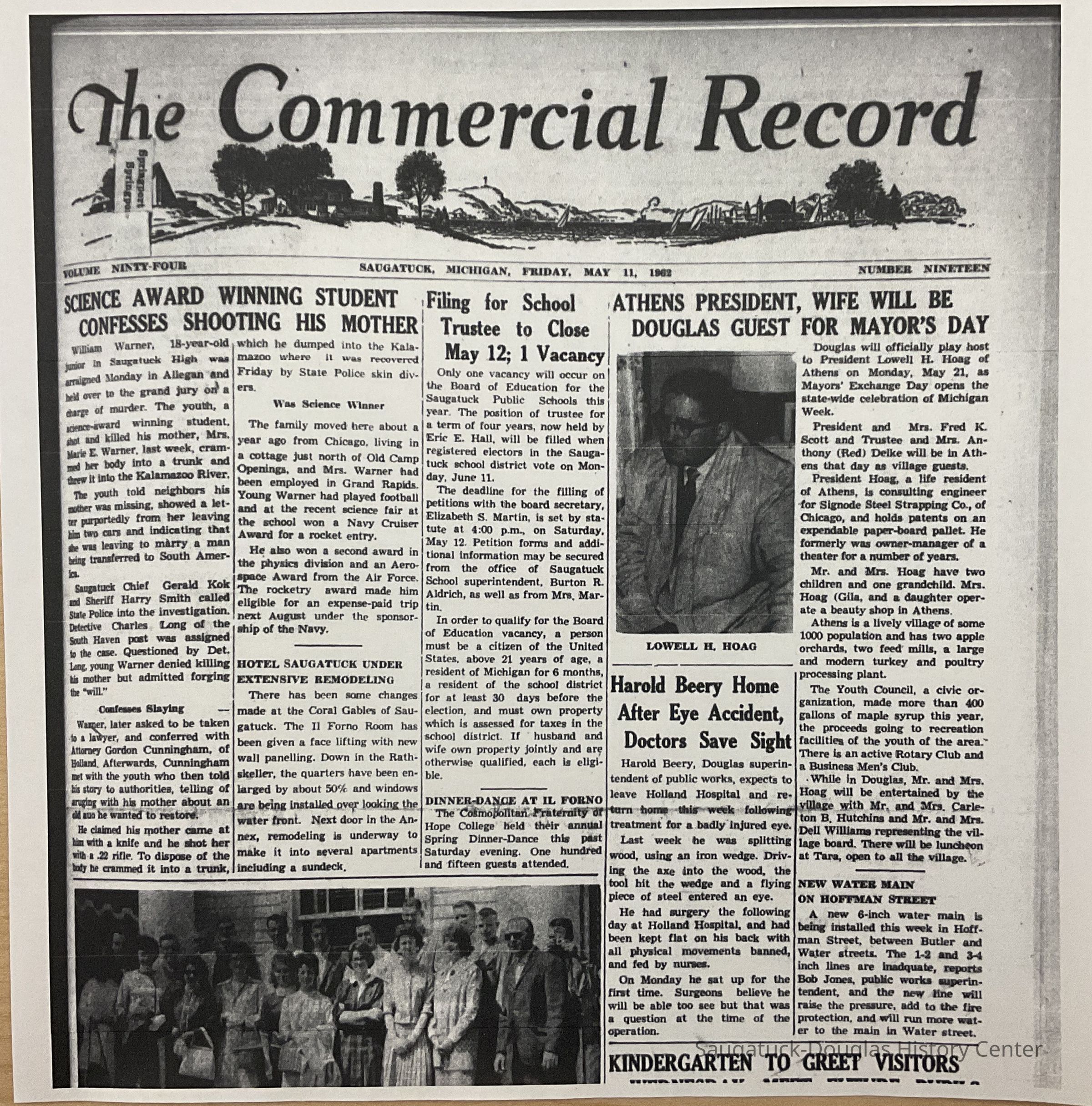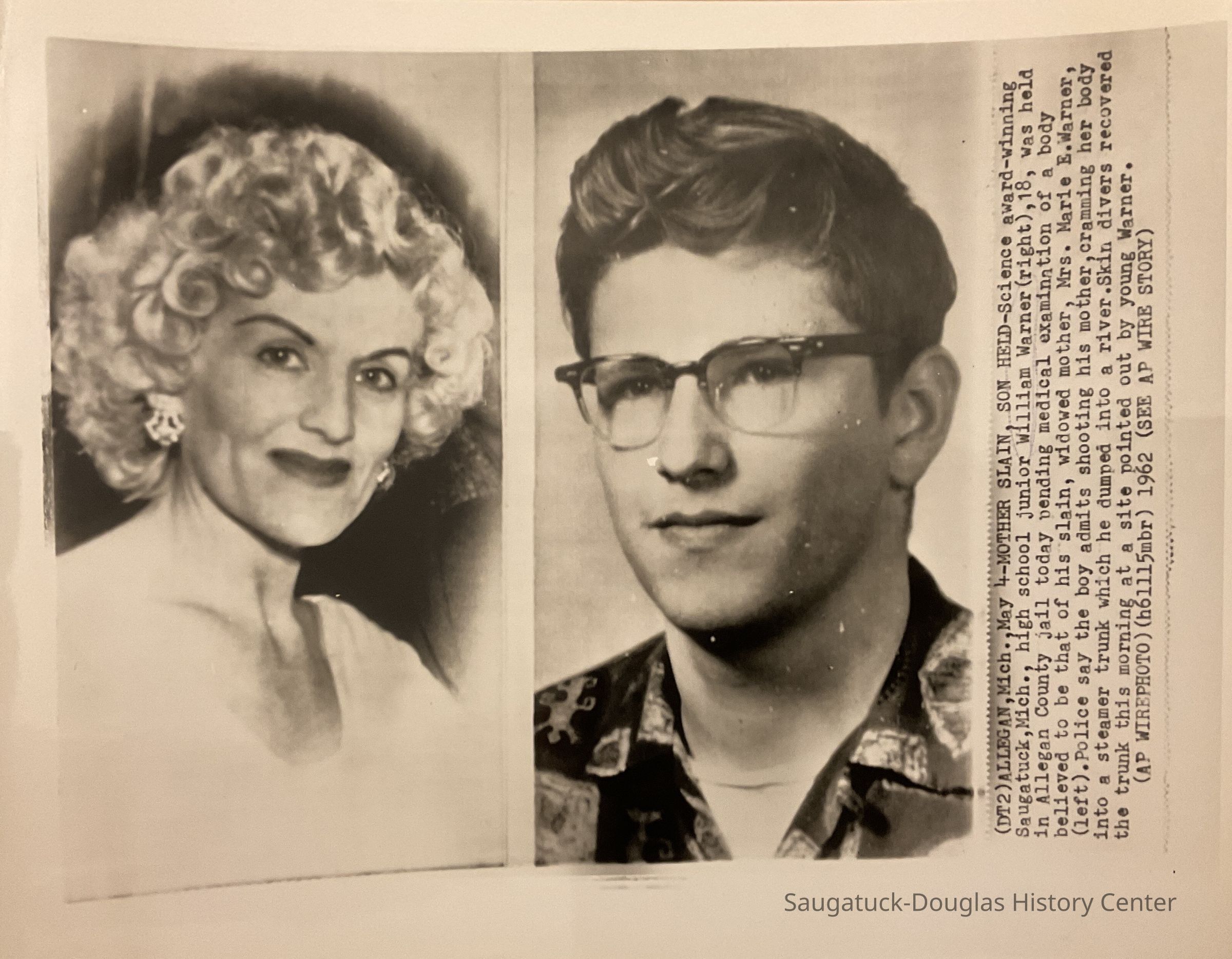 A glossy black and white print of two photos, Marie E. Warner and her son, William, a junior at Saugatuck High School. The accompanying newspaper clipping tells the story of the son admitting to shooting his mother and cramming her body in a trunk which he dumped into the Kalamazoo River.Collection