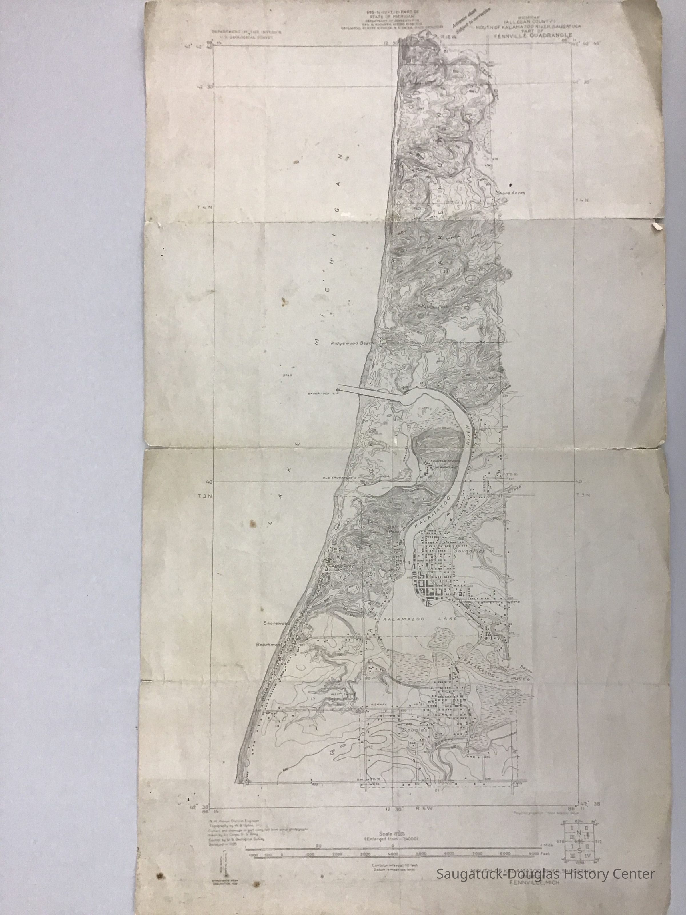 USGS quadrangle map of Douglas, Saugatuck, and Laketown township centered on the Kalamazoo River. Features on map include roads, buildings, elevation contours, and bodies of water. Place names on the map include Juniper Hill, Carver Drain, Shore Acres, Pelican Beach, Ridgewood Beach, Goshorn Creek, Shorewood, Beachmont, Clipson's Bayou, and the Tannery.Acquisition