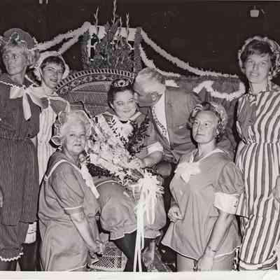 The crowning photo has text handwritten on the back "L-R Joyce (Hacklander) Busscher, Delia (Whipple) Smith, Betty Fiala, (Queen), Ev Thomas, Jane (Bird) Van Dis, Margaret "Peggy" (Webster) Boyce" and "Mary Net Steele".