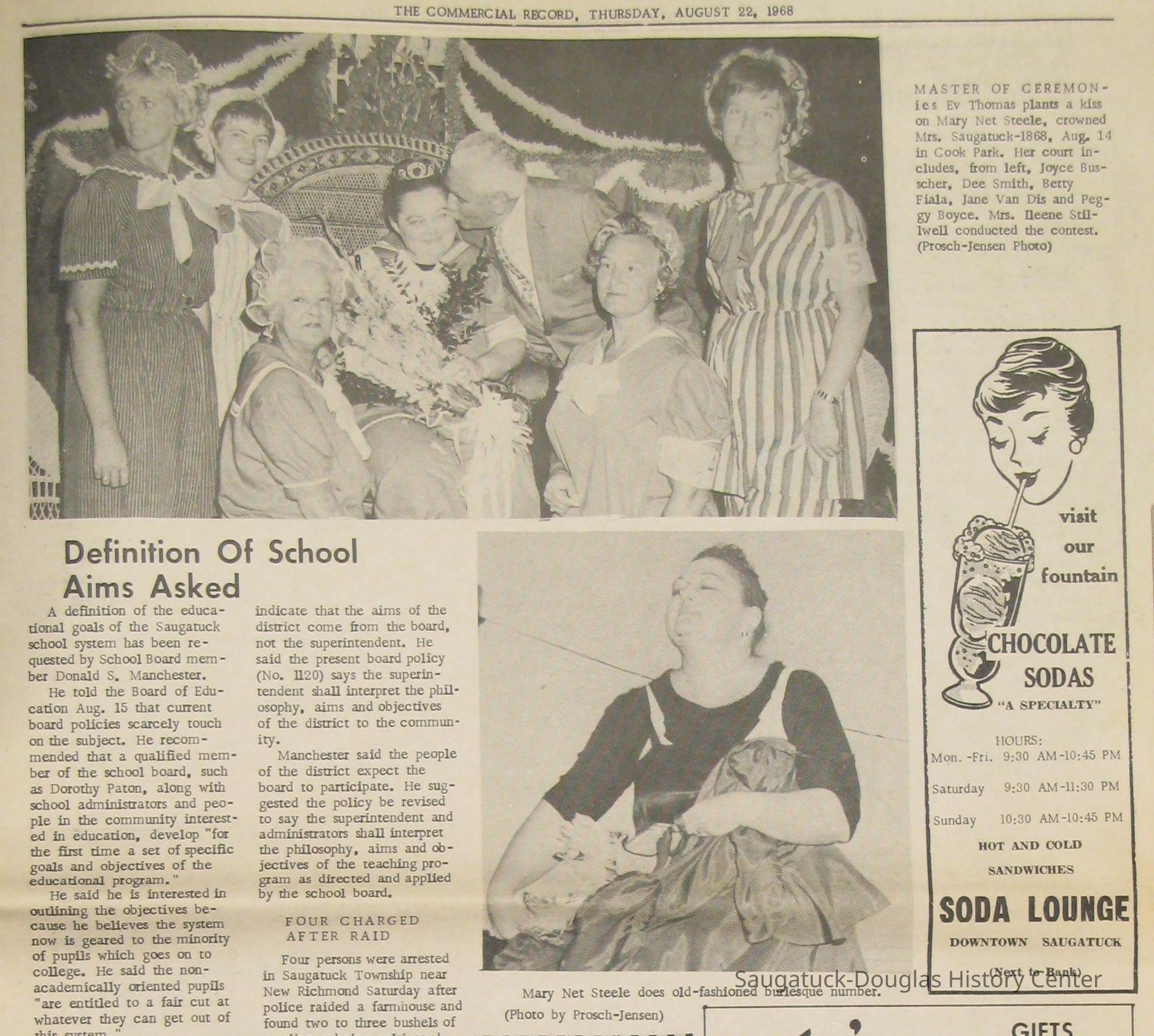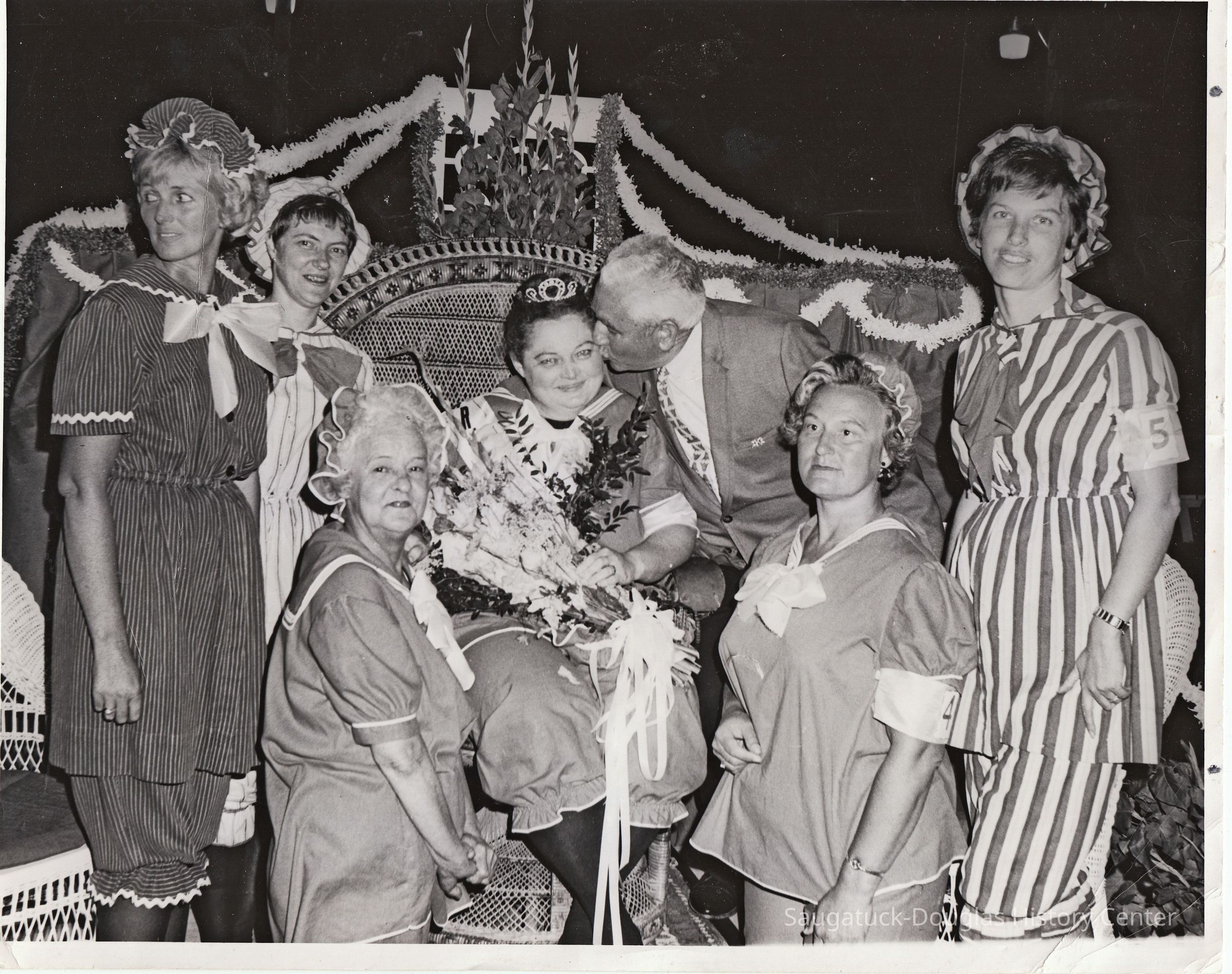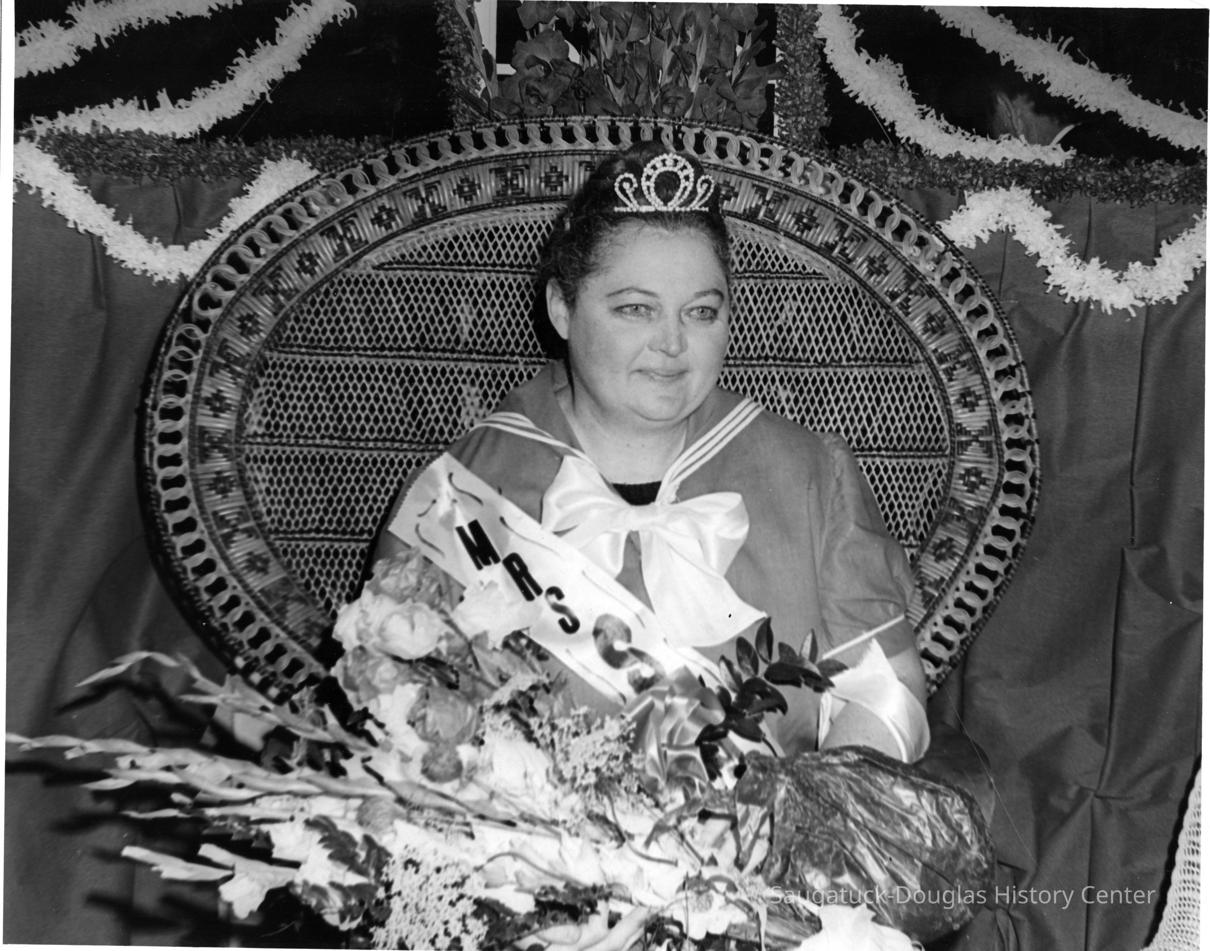 As part of the Saugatuck Village Centennial of 1968, a spoof beauty contest "Mrs. Saugatuck-1868" included a modest swimsuit competition poolside at the Butler Restaurant and a tiara awarded at Cook Park.Collection