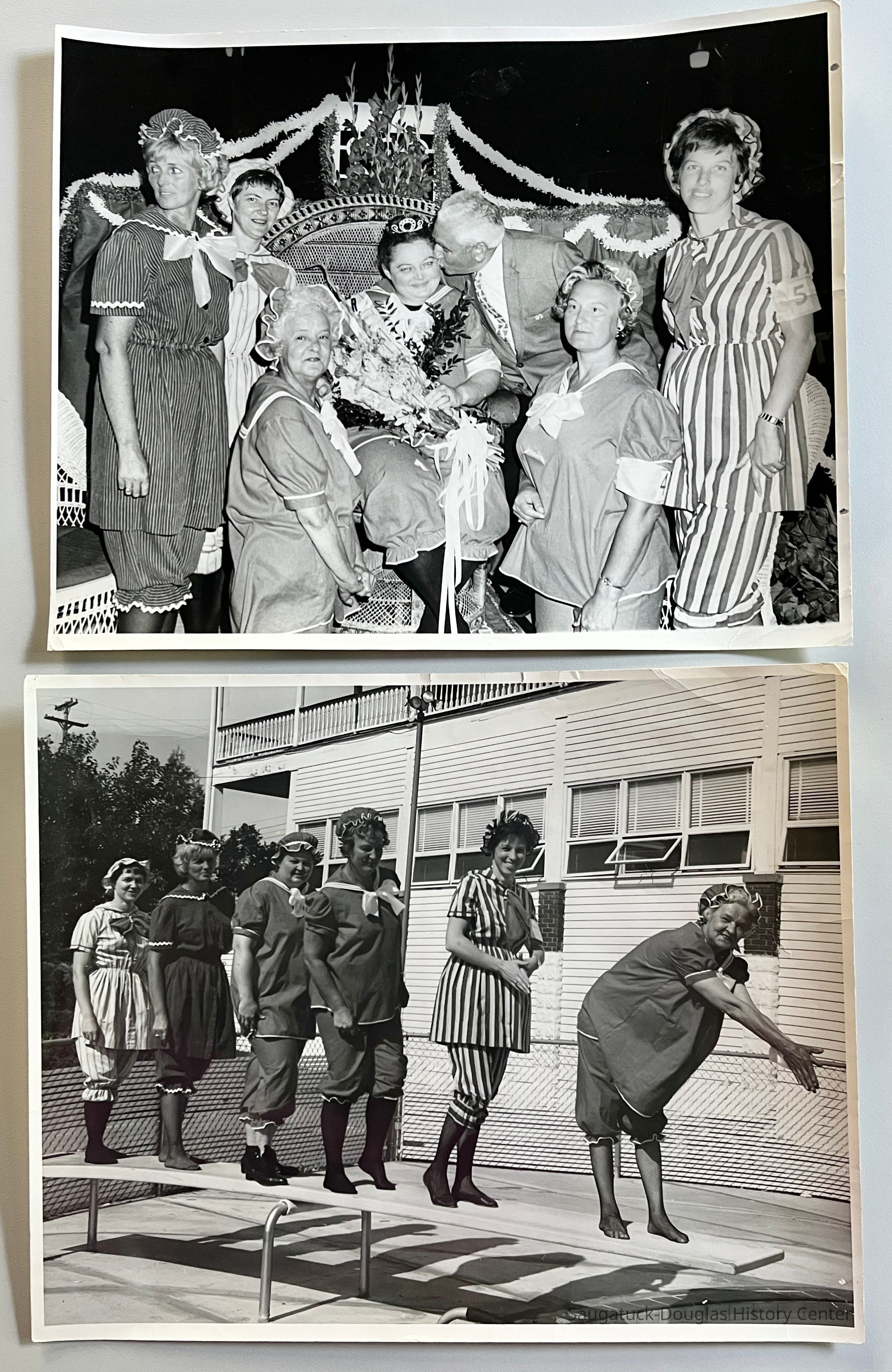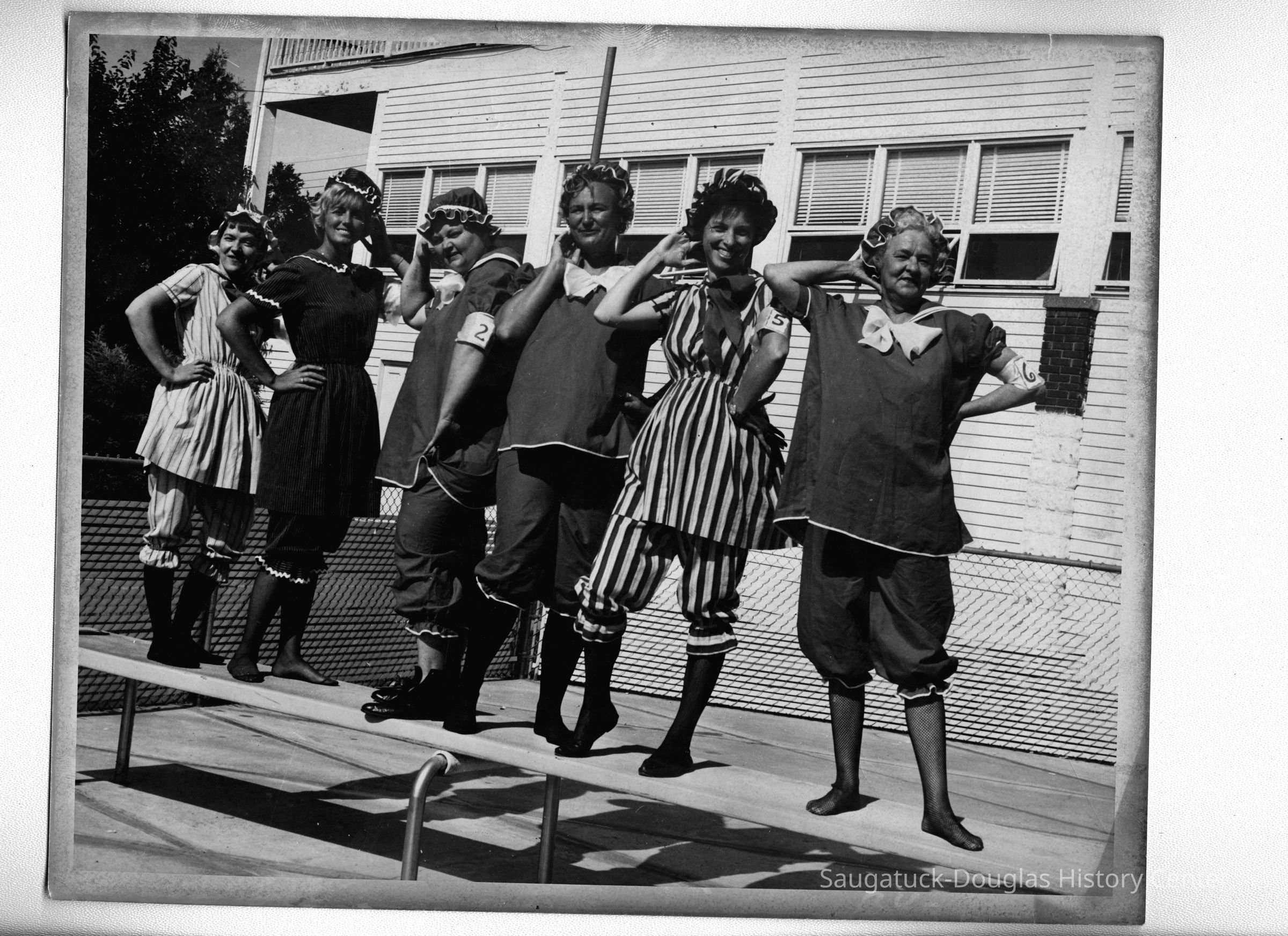 The diving board photo has text handwritten on the back "Left to Right Delia Smith, Joyce Busscher, Mary Stelle, Jane Van Dis, Peggy Boyce, Betty Fiala" and "Mrs. Saugatuck Contest".Photograph Details