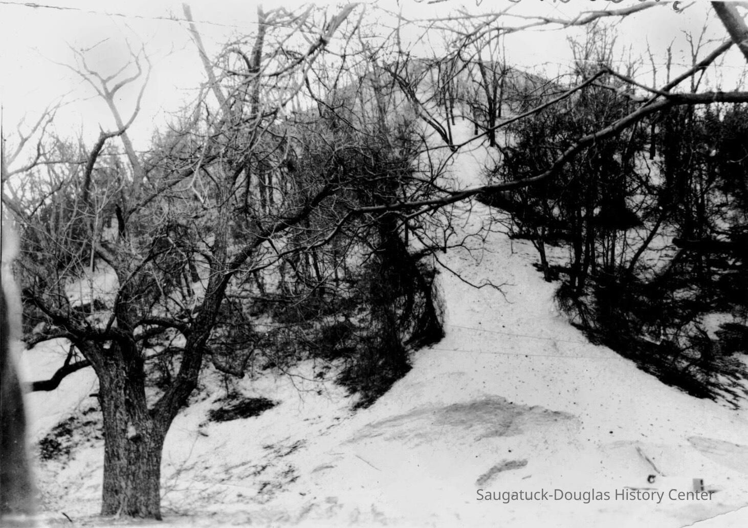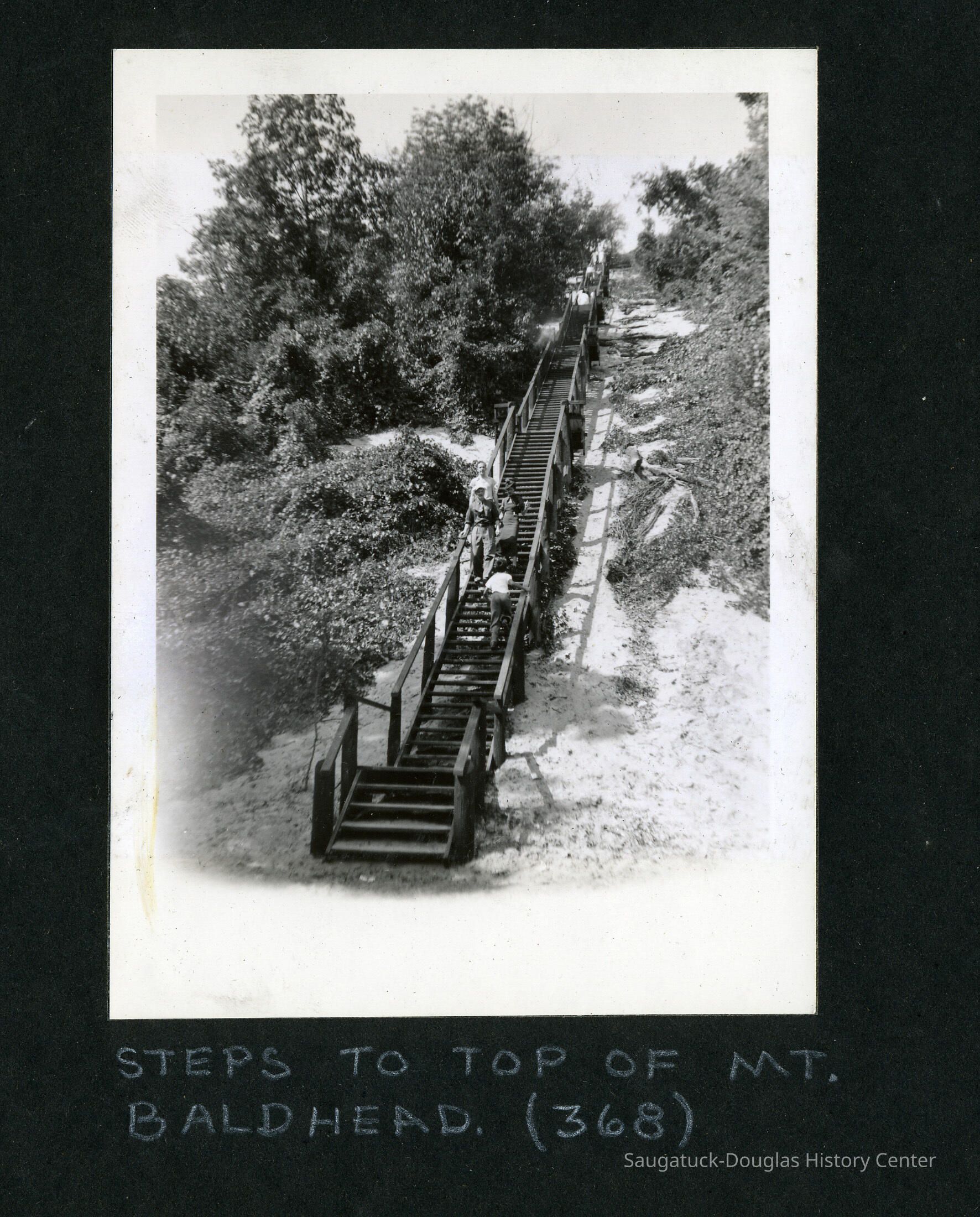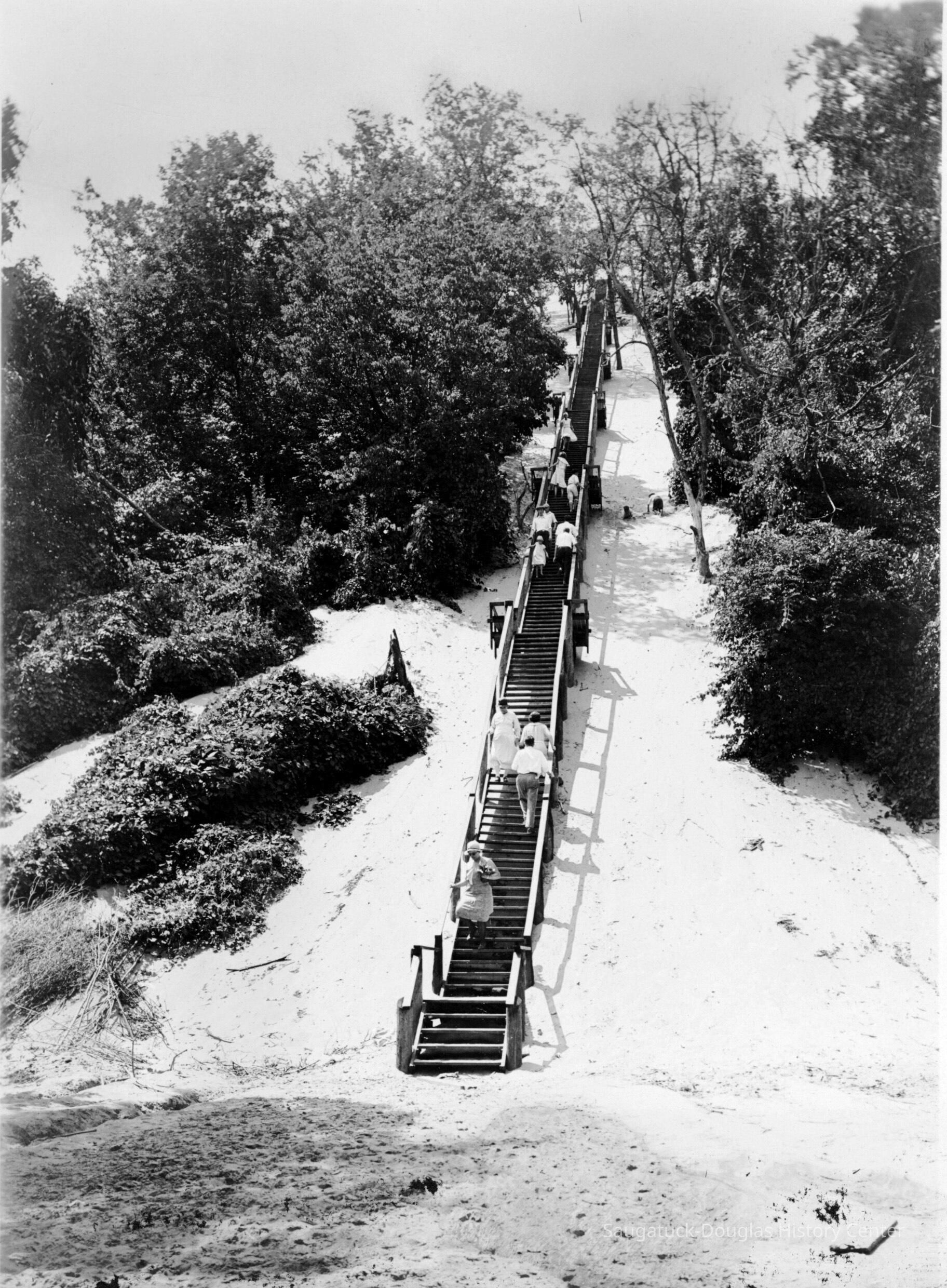 “The stairway up Baldhead will be finished ere the close of the week. This is made in sections of about fifty feet interspersed with cool and shady resting places, when the climber can start aloft with renewed vigor. It is four feet wide, with eight inch risers, each step being of 2 in. plank, 12 inches in width, the whole structure strong and well put together. The more we look into the matter, the more firmly we become convinced that this is Saugatuck’s golden opportunity, and we are glad to note that the park project meets the popular favor that it does.”