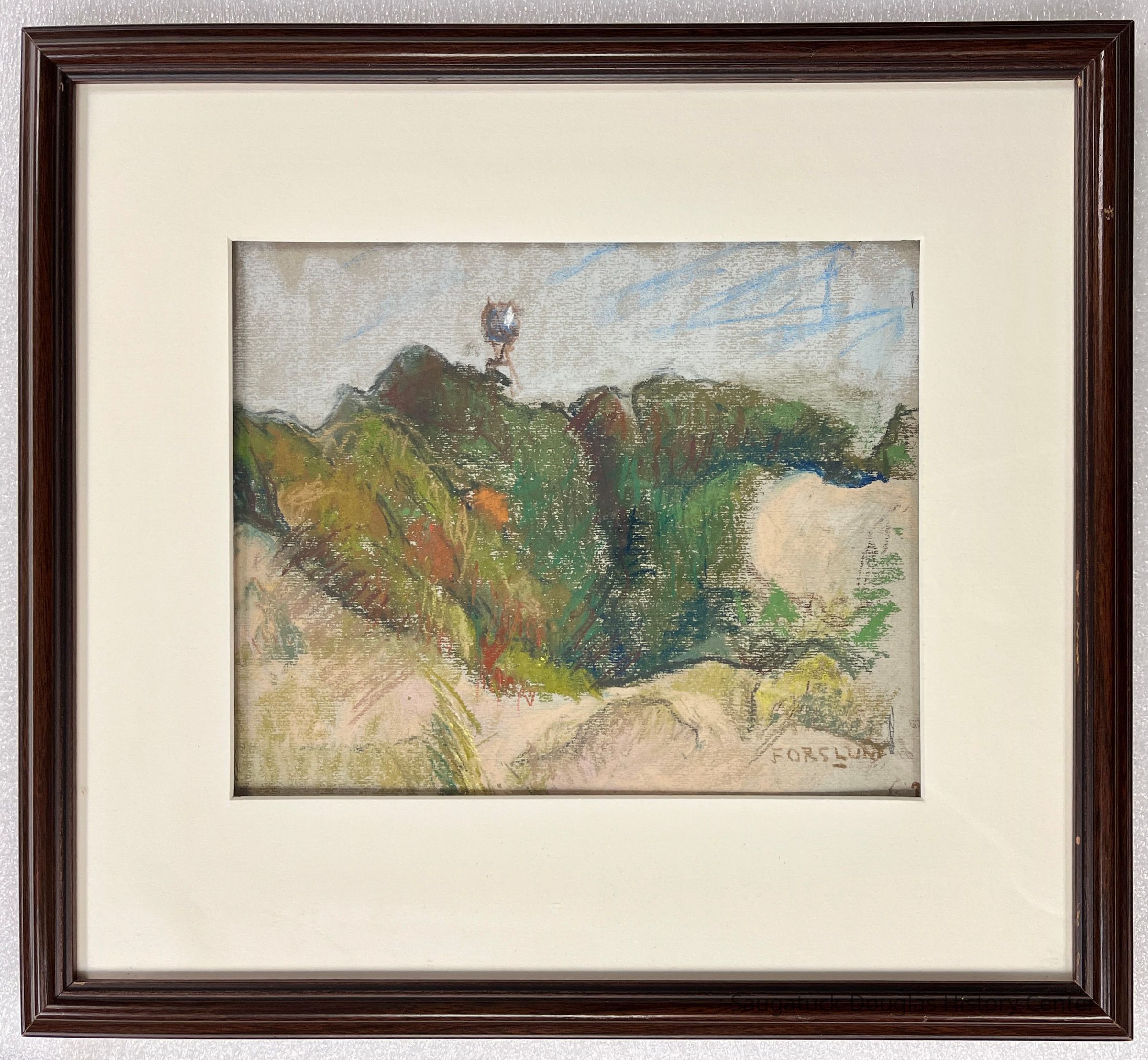 View of Mt. Baldhead in pastel on paper. Radar dome visible in left third of composition. View looking east from Oval Beach. Dark frame with beige mat.Collection