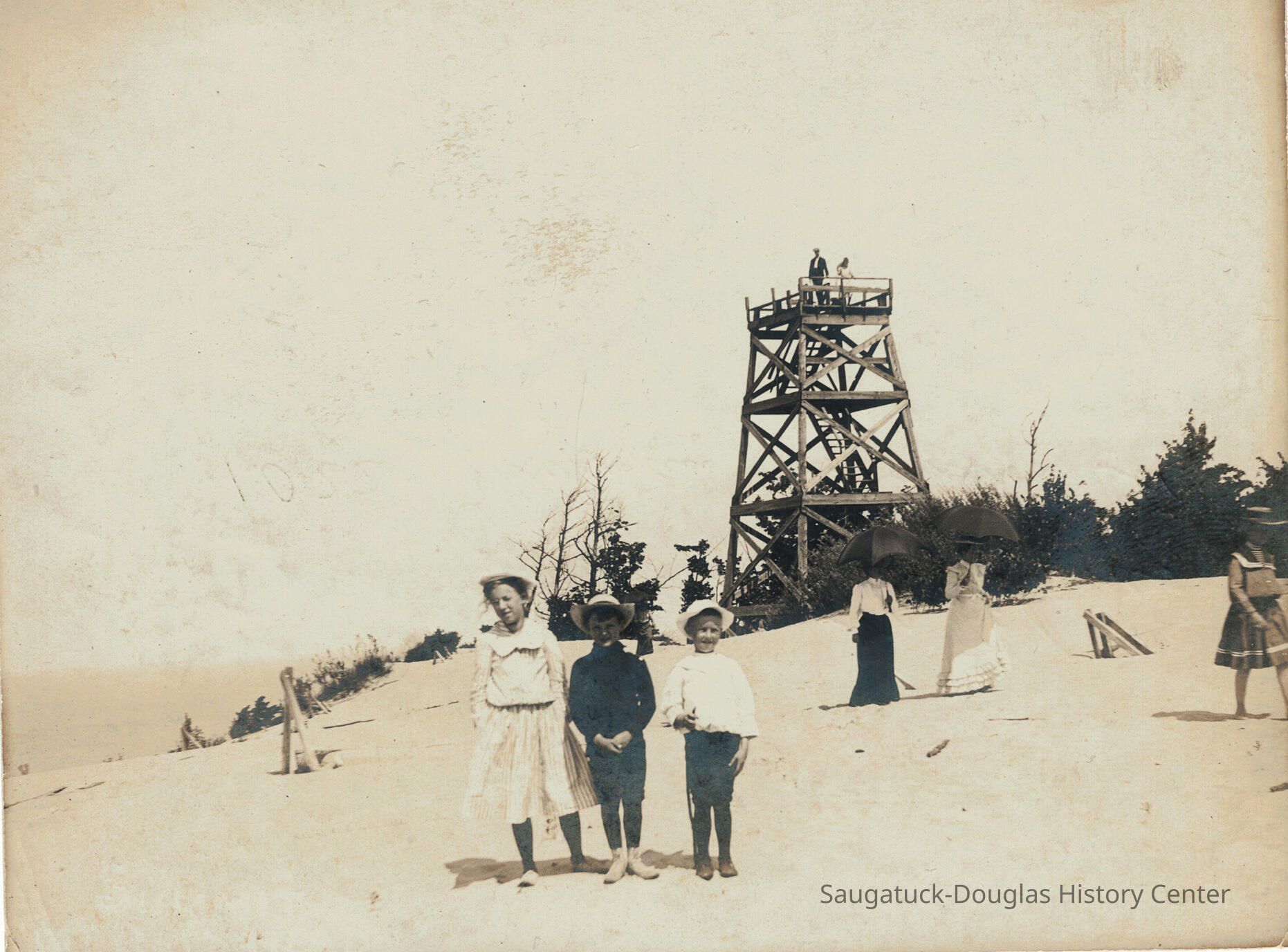Three children pose at the bare top of Mt. Baldhead. Two women in street wear and parasols walk by. Two small figures are atop the tower.
