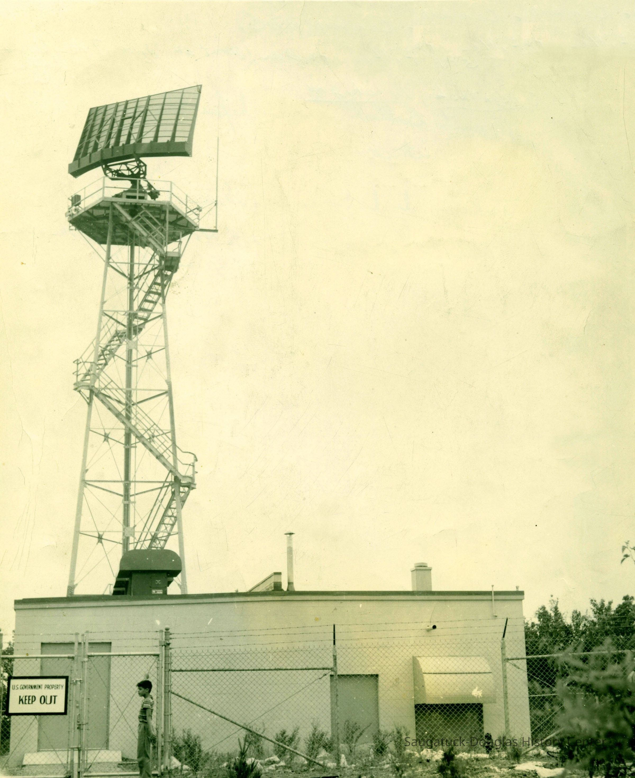 A boy stands outside the fence of the radar installation atop Mt. Baldhead. The tower does not yet have its fiberglass dome. A sign on the chain link fence, that is topped with barbed wire, says "U.S. Government Property KEEP OUT"Photograph Details