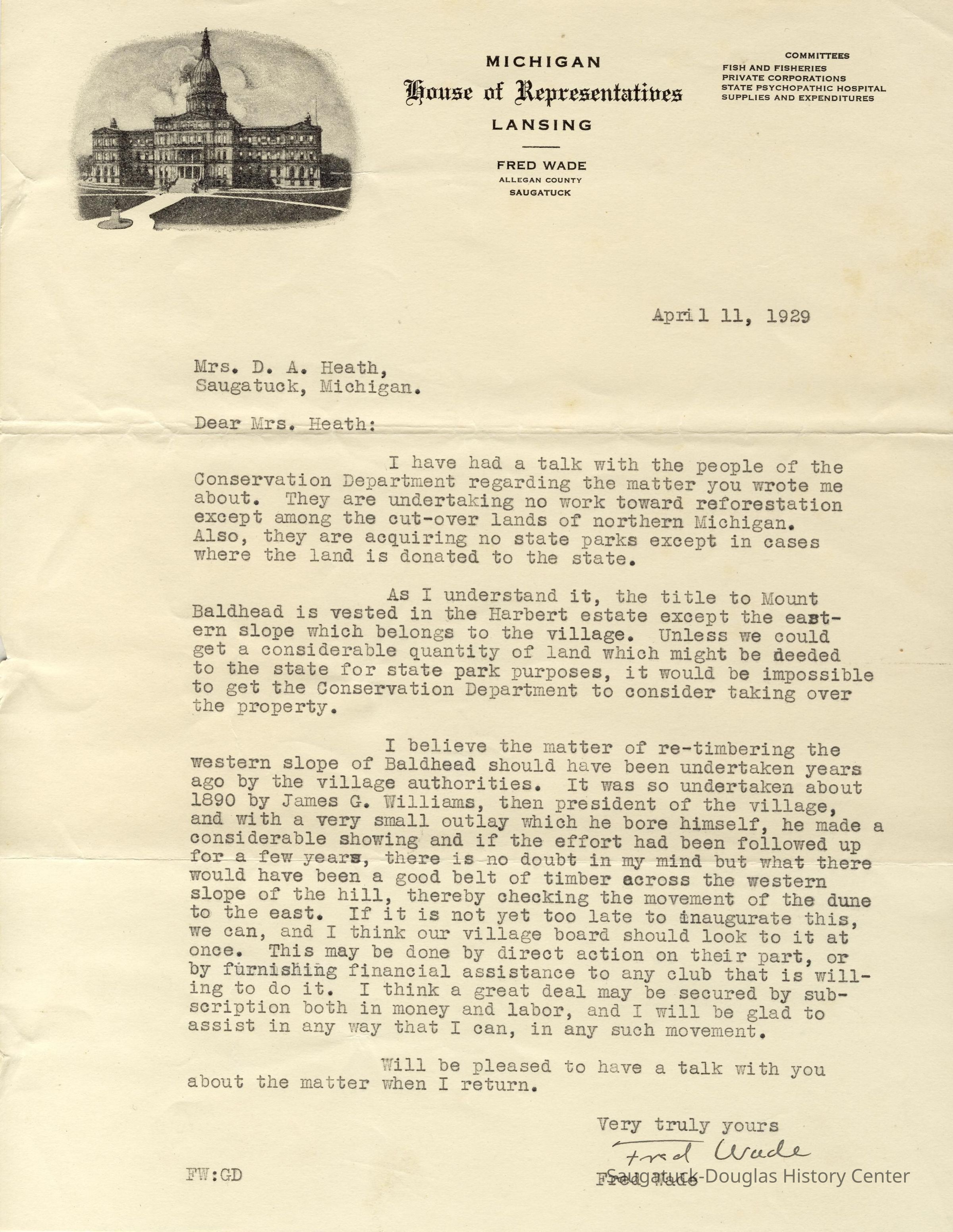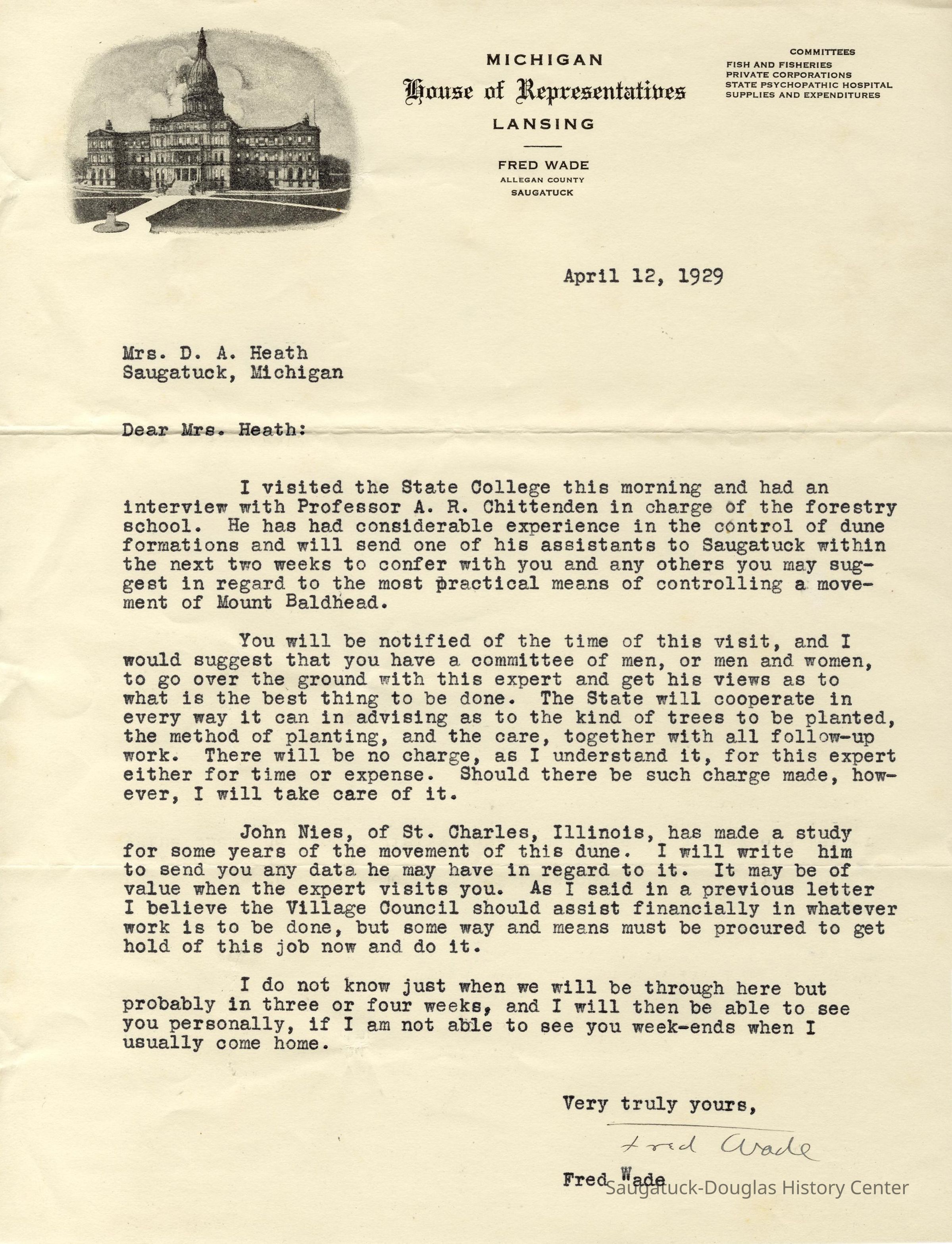Included with this entry two letters from Michigan State Representative Fred Wade, dated April 11 and 12, about re-timbering Mt. Baldhead to stabilize the dune - if land owned by Harbert estate can be deeded to the state - and connect Mrs. Heath to John D. Nies.Context