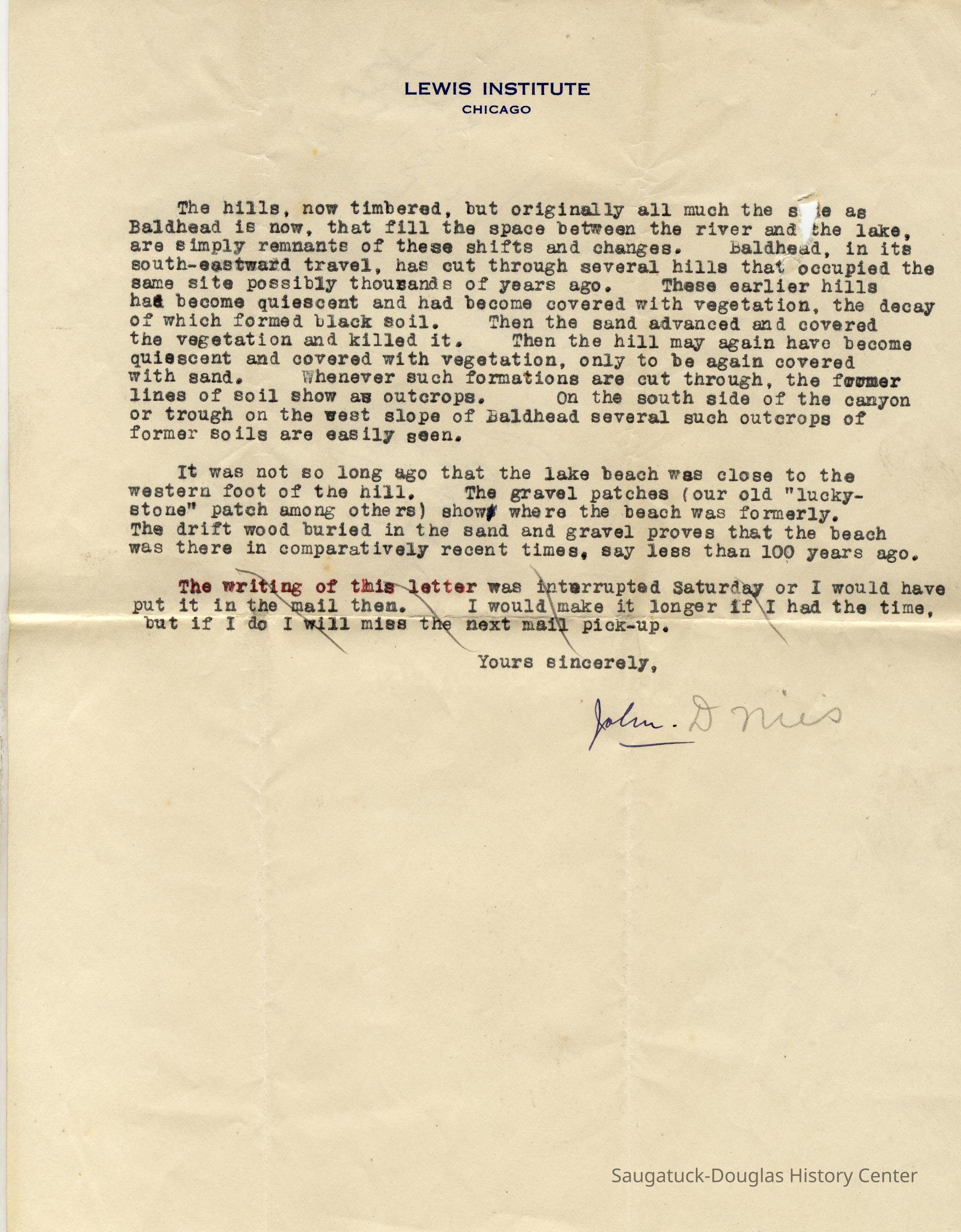 In 1929 residents of Saugatuck became concerned that Mt. Baldhead, then truly bald, would one day close off the river leaving the town without water access to Lake Michigan. May Francis Heath, who was writing a book about the area, led the group of concerned citizens. She wrote John D. Nies, identified on his stationary as of Lewis Institute, to seek his opinion as a scientist as well as a former resident (his father was one of the founders of Koning's Hardware Store). This is his reply: