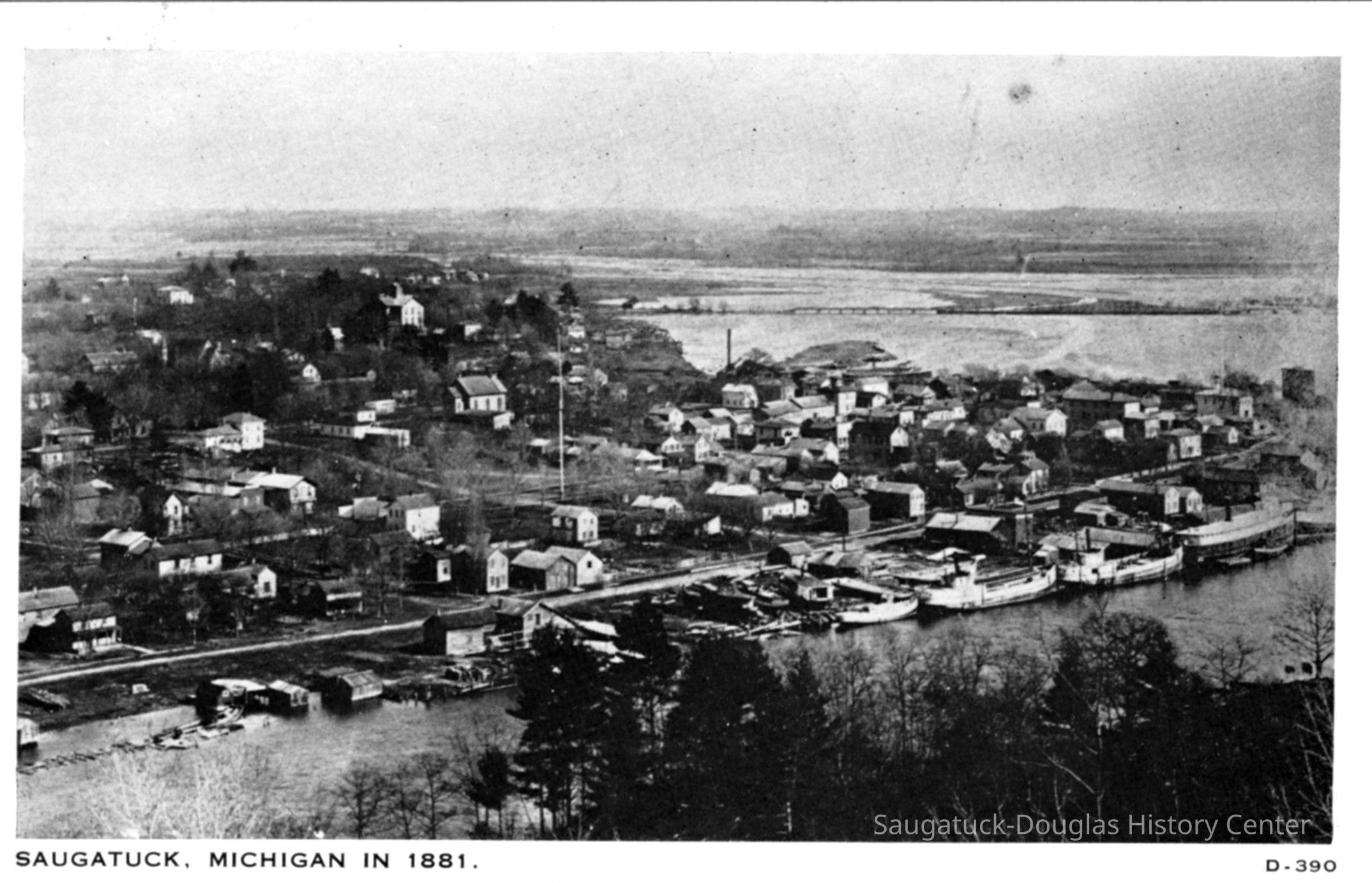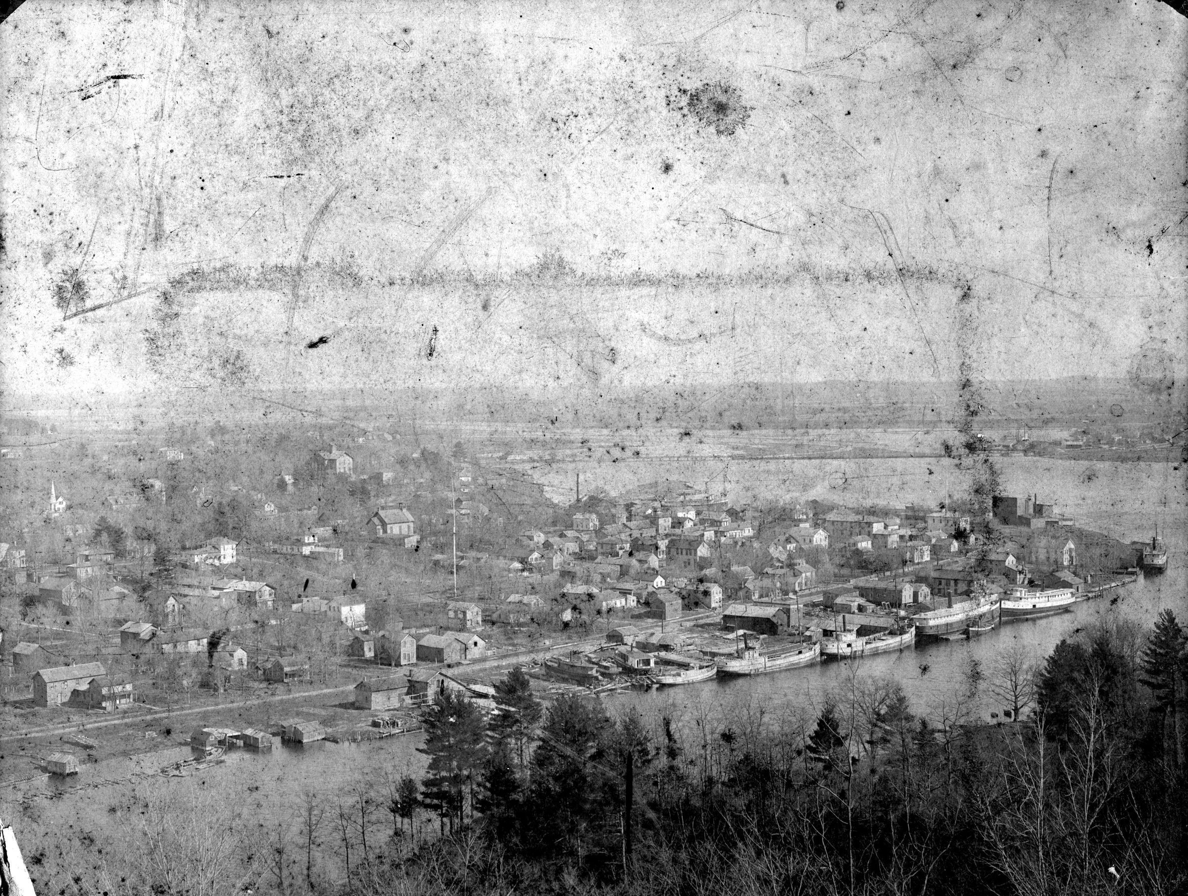 View from Mount Baldhead showing the Liberty poles, Saugatuck Union School, and Water street semi-flooded with a row of five steamships moored stern to bow. The Griffin and Henry Boom is visible in Lake Kalamazoo, Hotel Butler is still being used as a grist mill on the far right and a white church with a tall, pointy spire of the "Old Methodist Church" is visible on the far right.The negative or print was significantly scuffed.Photograph Details