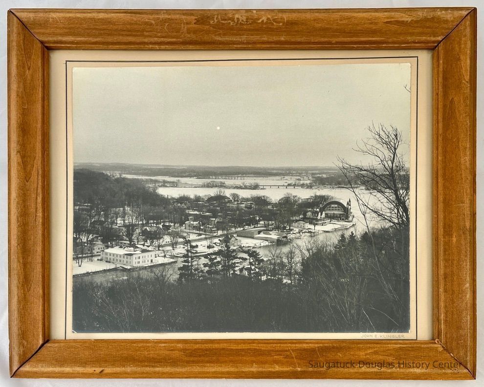 B/W photo of the view from Mount Baldhead in winter, after 1937 (when the East Shore Pavilion was demolished). The print has "John E. Klinger" written on the backing board in the lower right corner.