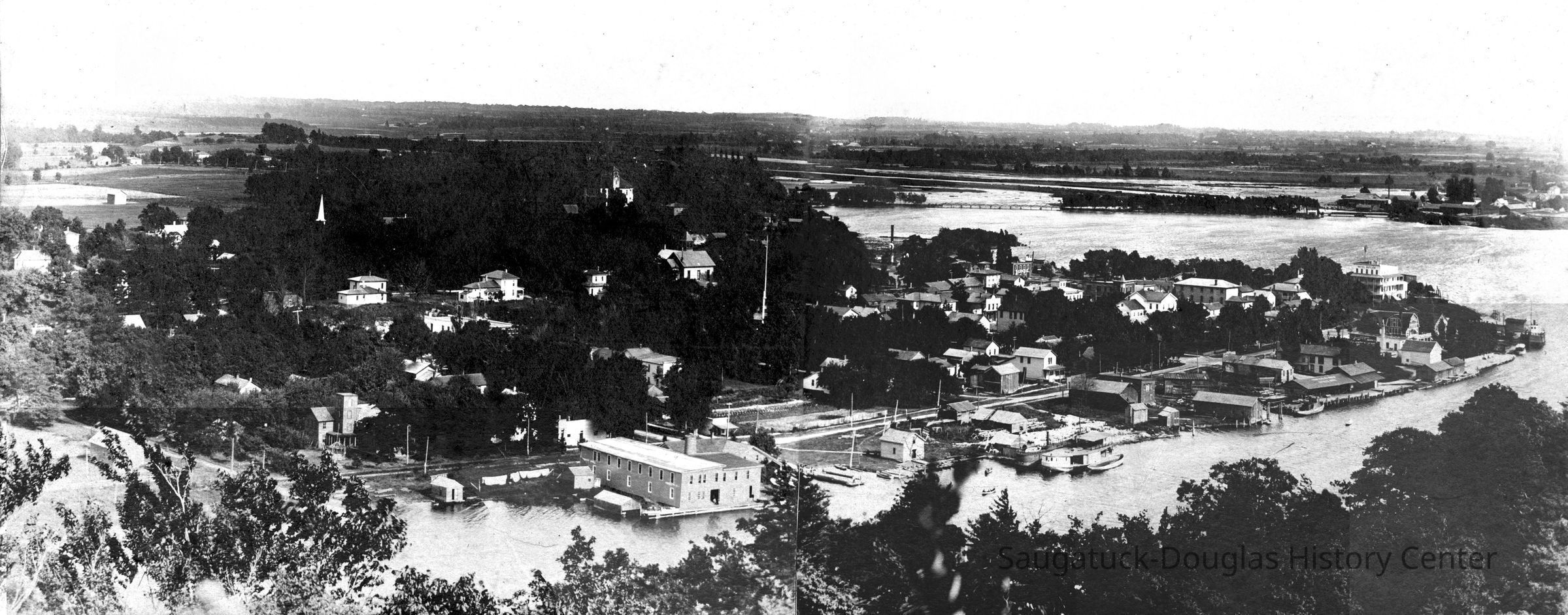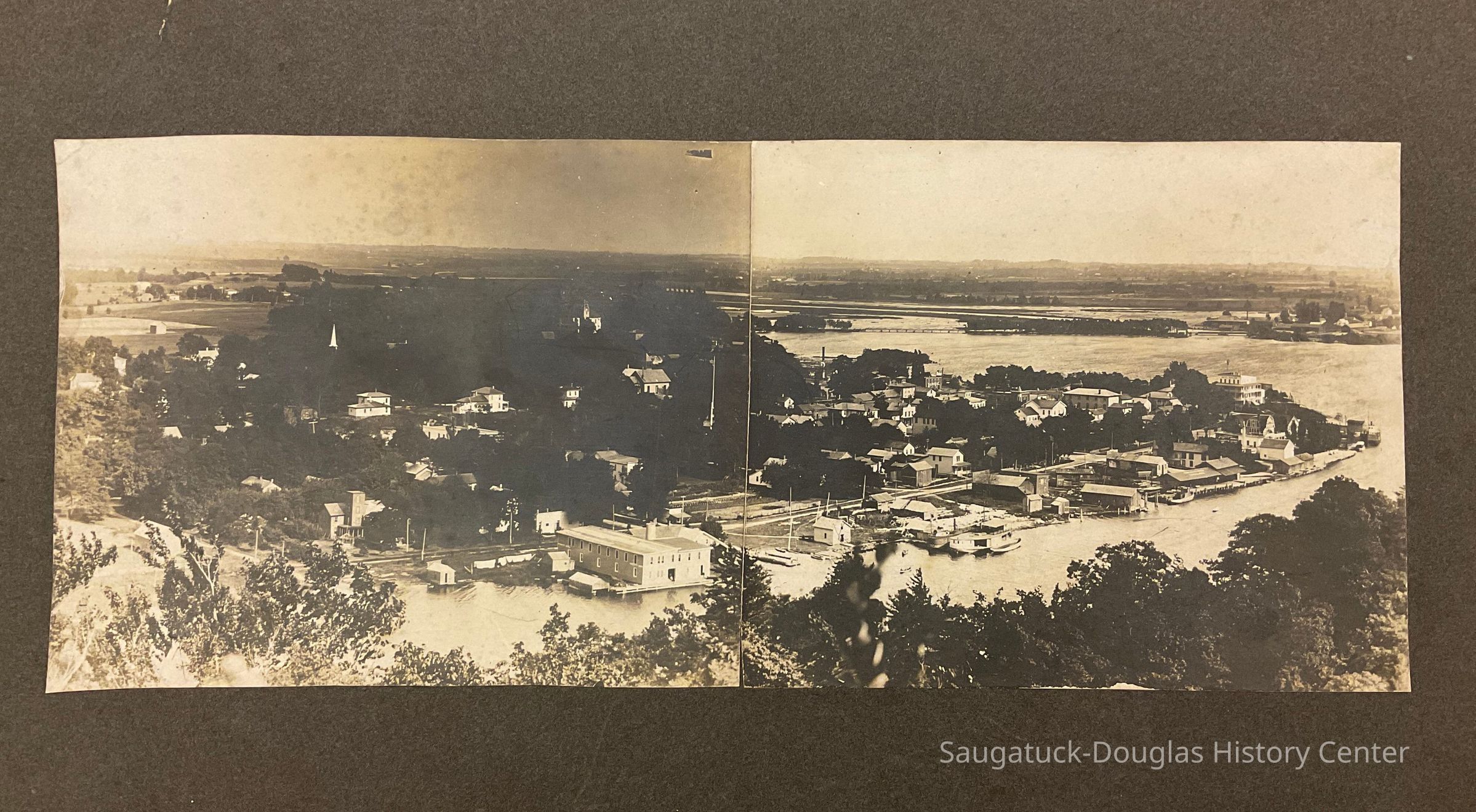 11.5 x 4.5" black and white photograph (made up of two individual photographs) of Saugatuck Village. The view was taken from the top of Mt. Baldhead and shows the waterfront along Water Street in the foreground. This is a pre-1909 photo taken before the Big Pavilion was built.Photograph Details