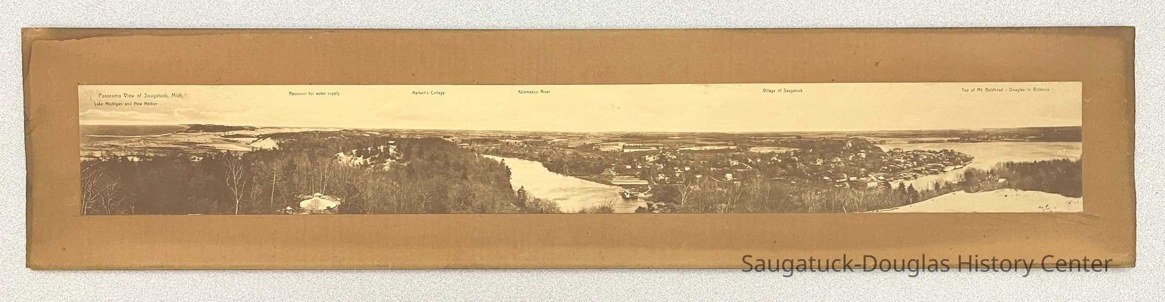 The view includes labels for Lake Michigan and New Harbor [completed 1906], Reservoir for water supply, Harbert's Cottage, Kalamazoo River, Village of Saugatuck and Top of Mt. Baldhead - Douglas in Distance. There is no sign of the Big Pavilion that was built in 1909.Collection