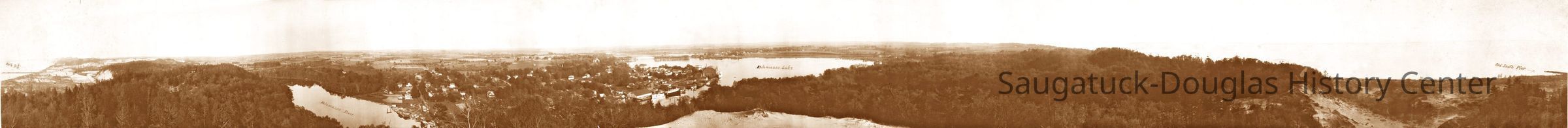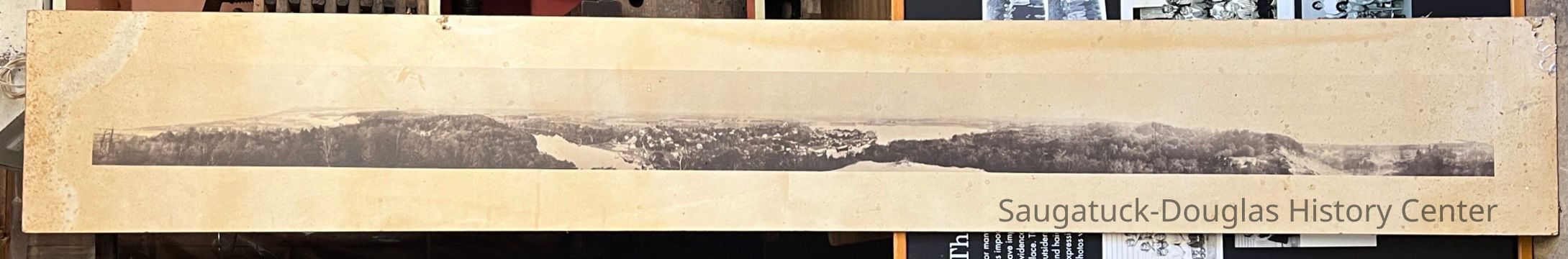 Seven-foot long b/w print of a 360-degree panorama photo taken from the top of Mount Baldhead. The photo includes the Big Pavilion so it was taken after 1906. The photo is printed on matte paper and mounted on brown fiberboard. Unframed.Photograph Details