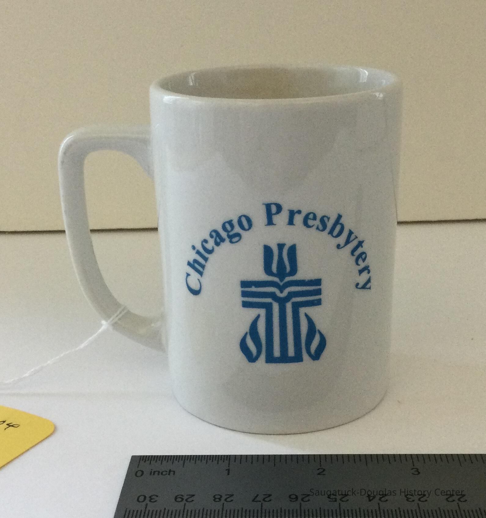White mug with the letters, Chicago PresbyteryCollection
