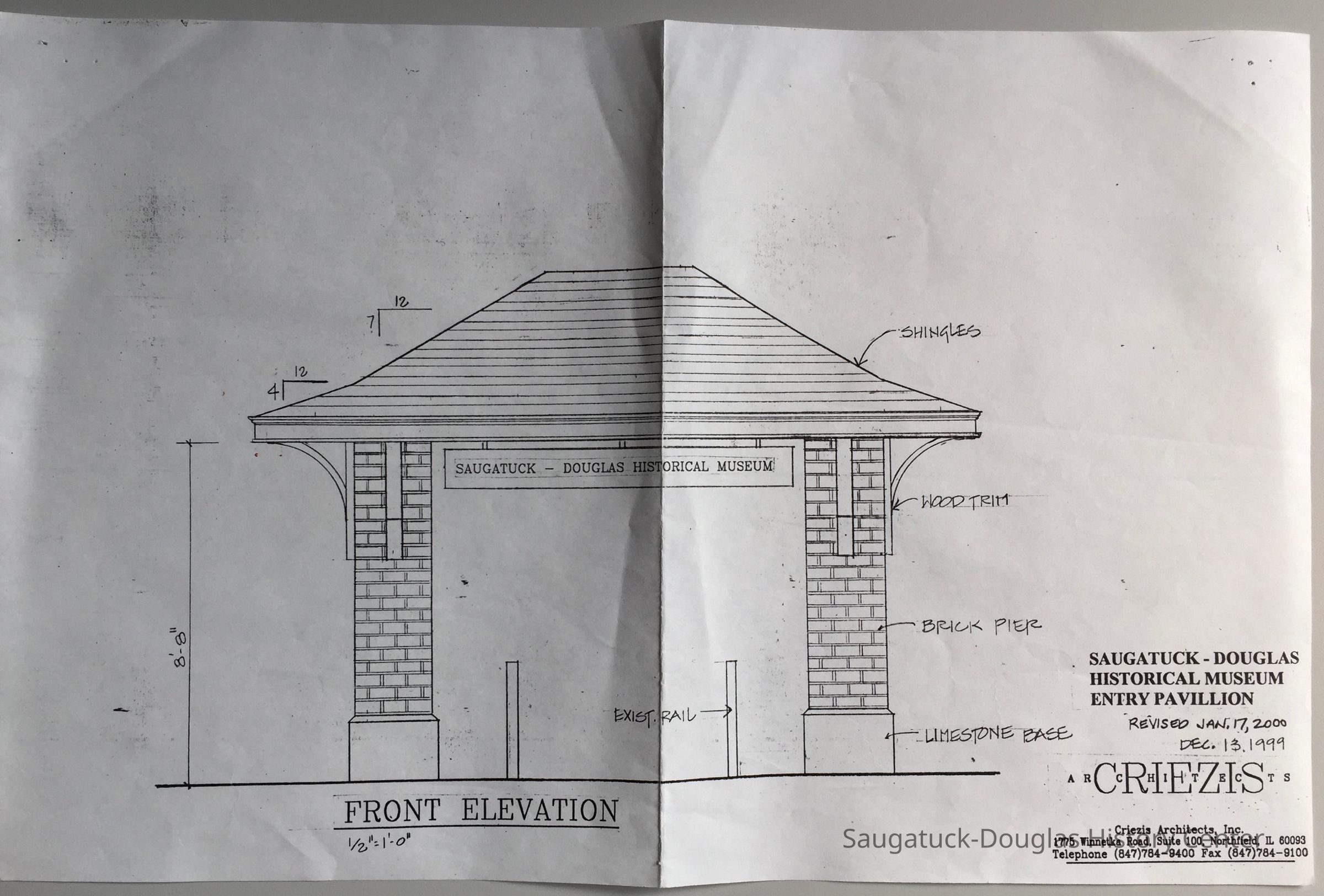 Photocopy of a front elevation drawing for a brick pavilion dated as revised Jan. 17, 2000 by Criezis Architects.Context