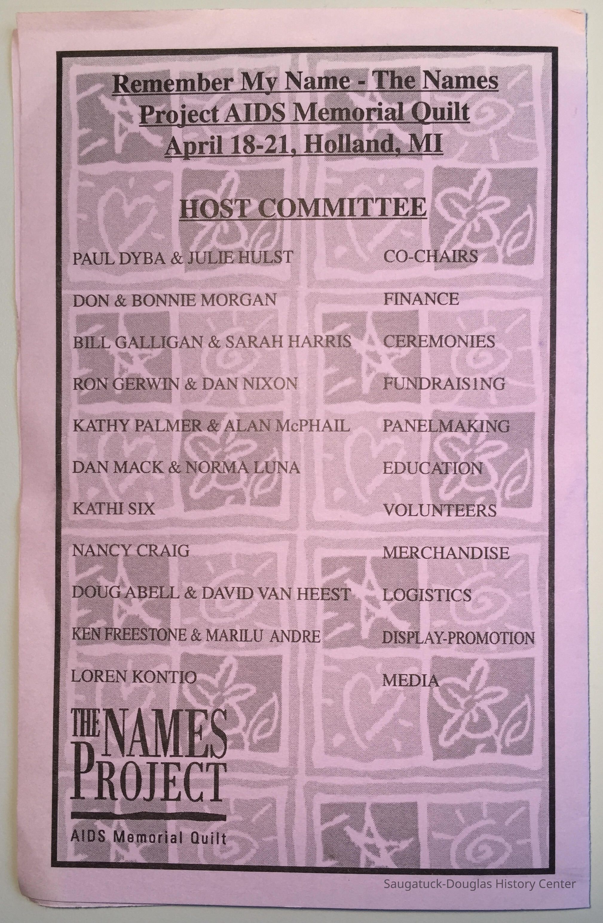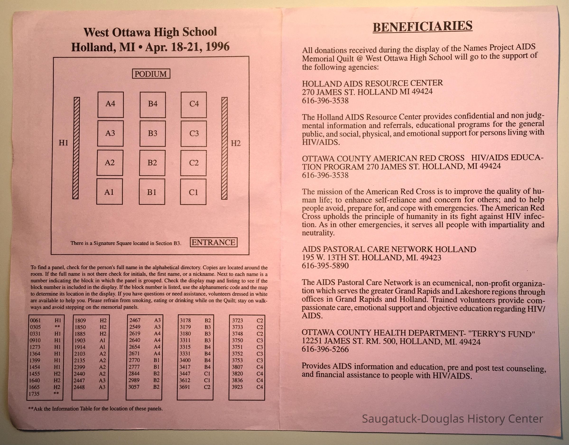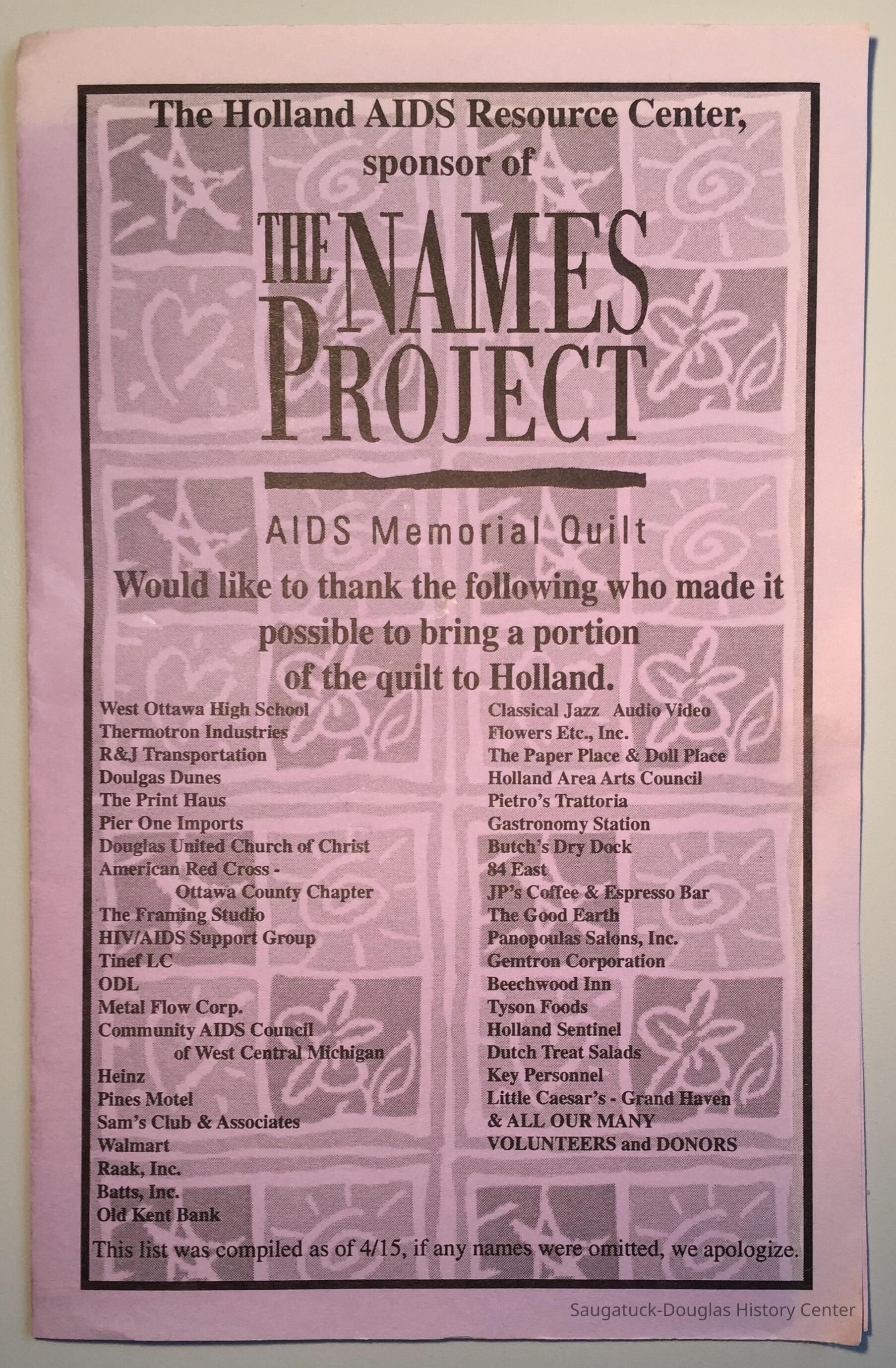 Program for the Remember My Name - The Names Project AIDS Memorial Quilt display on April 18-21, 1996 at West Ottawa High School in Holland, Michigan.