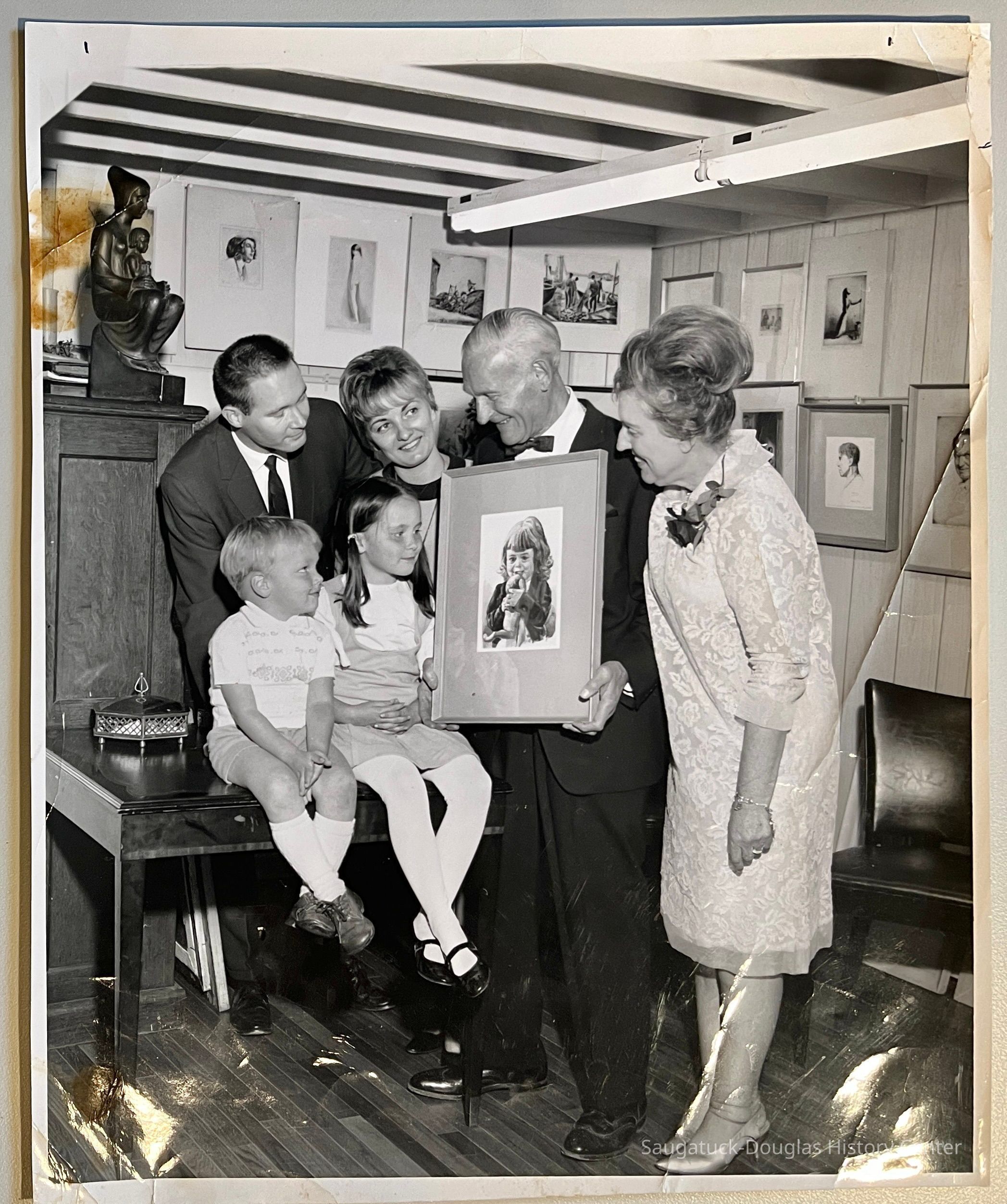 Nathanial P. Steinberg, a mature man in suit and bow tie shows a framed portrait to a girl. What may be the girl's brother and parents look on from the left. Isabel Steinberg, wearing a corsage, smiles from the right. The room where the photo was taken has many artworks on the wall and a florescent light fixture, likely Steinberg's studio at 82 Ellis St. in Douglas.Photograph Details