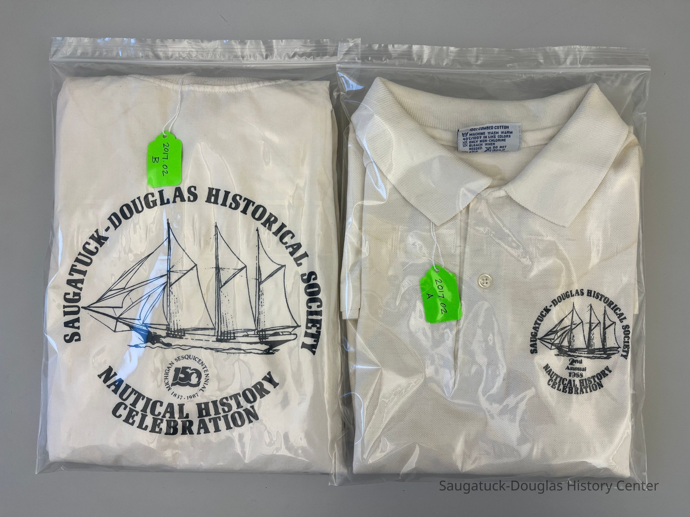 Two shirts. One lightweight white cotton pullover and one white cotton polo shirt with the early schooner logo. and the words: "Saugatuck Douglas Historical Society Nautical History Celebration 1988" . Sold as fundraisers for the Saugatuck Douglas Historical SocietyCollection
