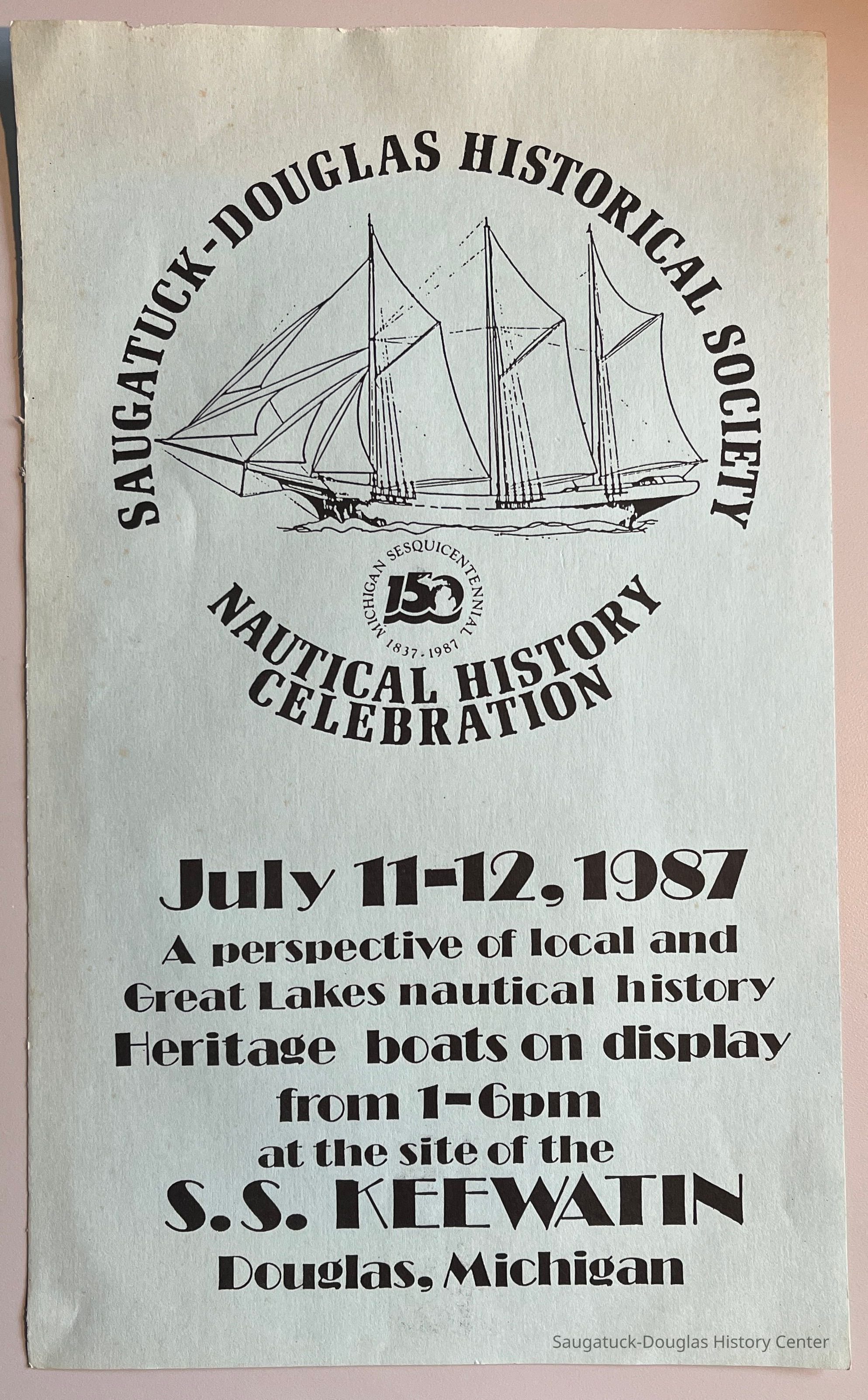 Saugatuck Douglas Historical Society poster of the Nautical History Celebration July 11-12 , 1987. Poster is photocopied on pale blue card stock.Collection