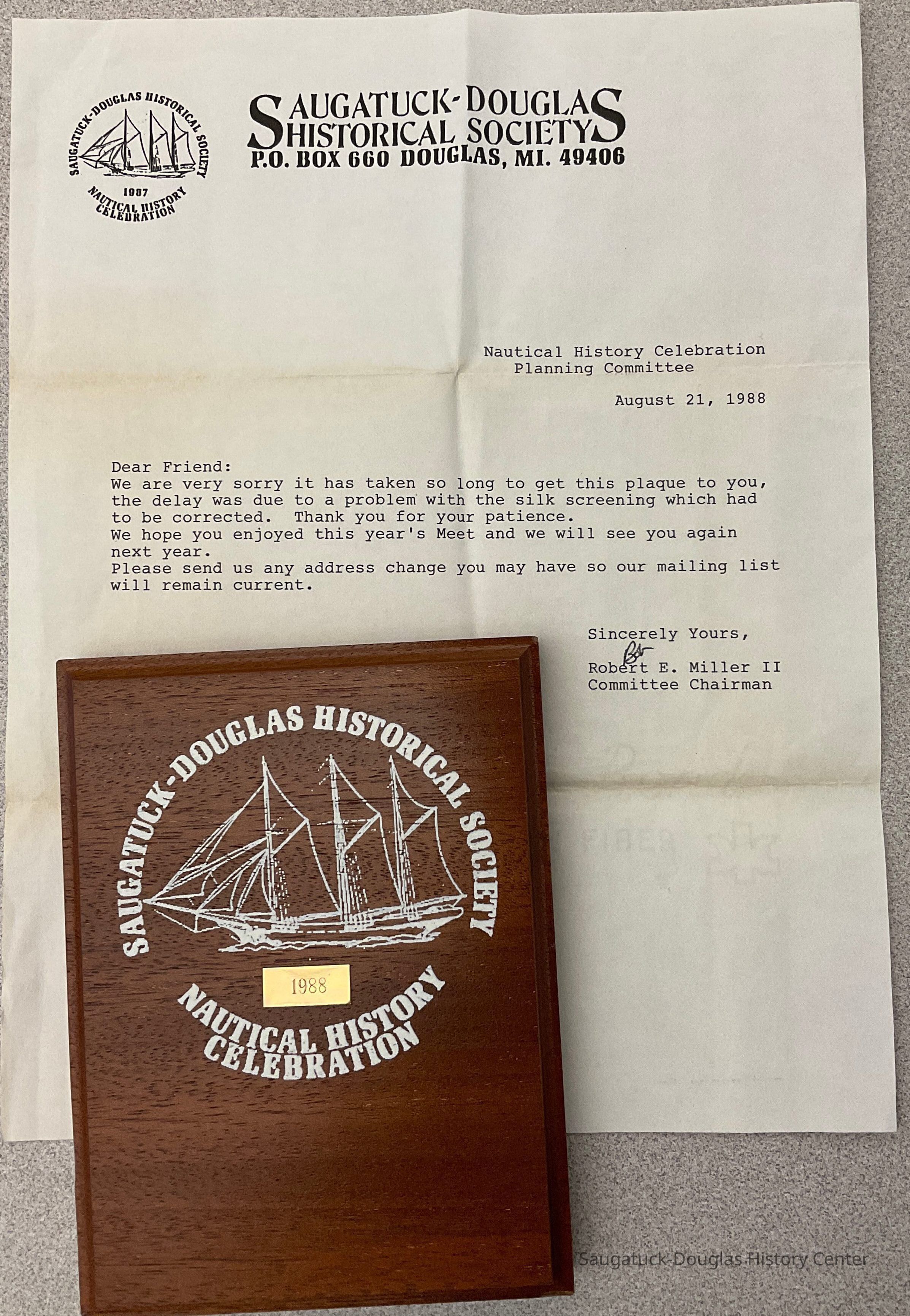 Commemorative wooden plaque and letter from Robert E. Miller IICollection