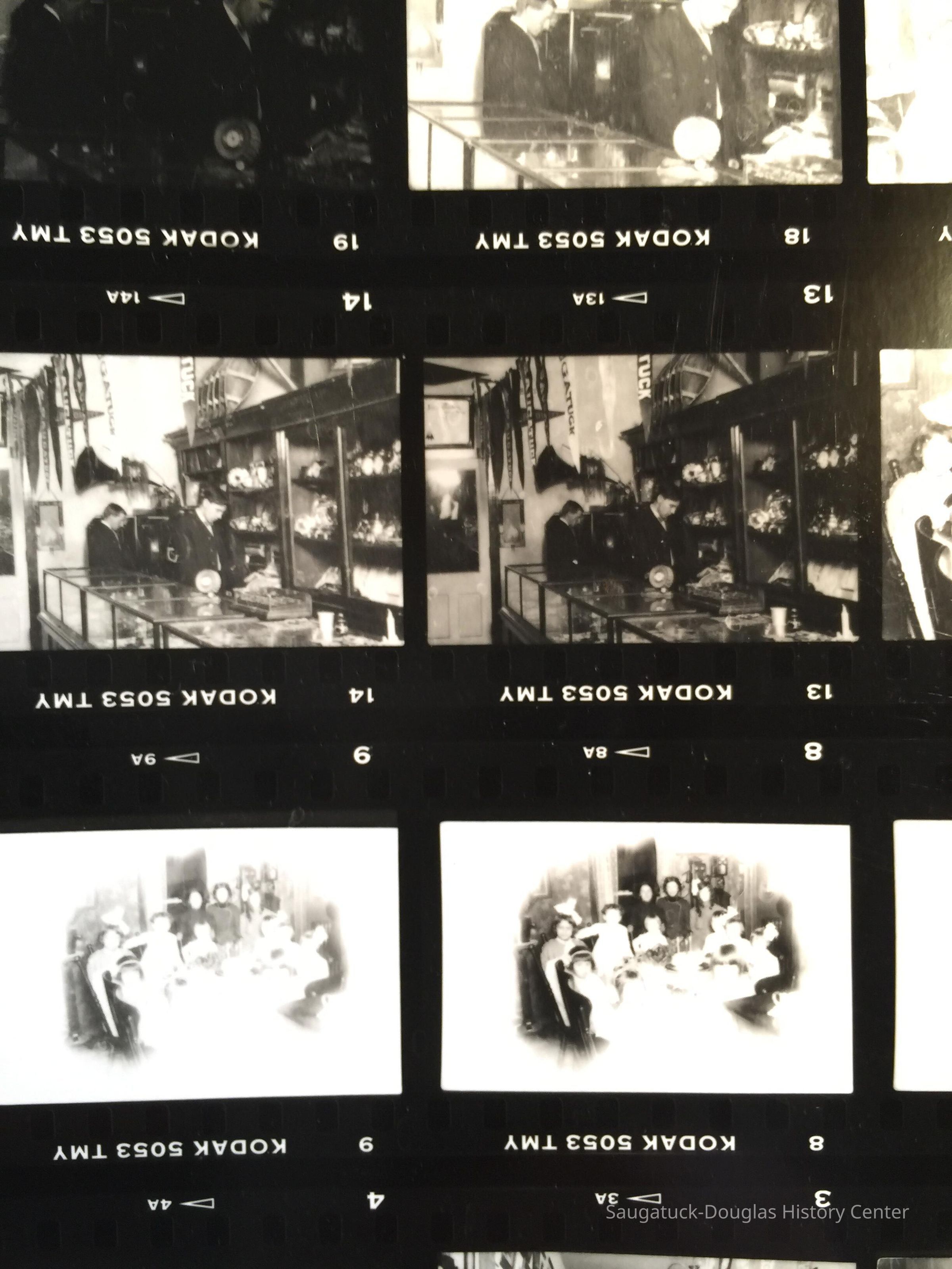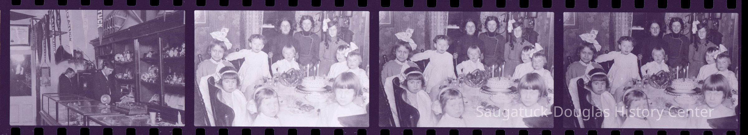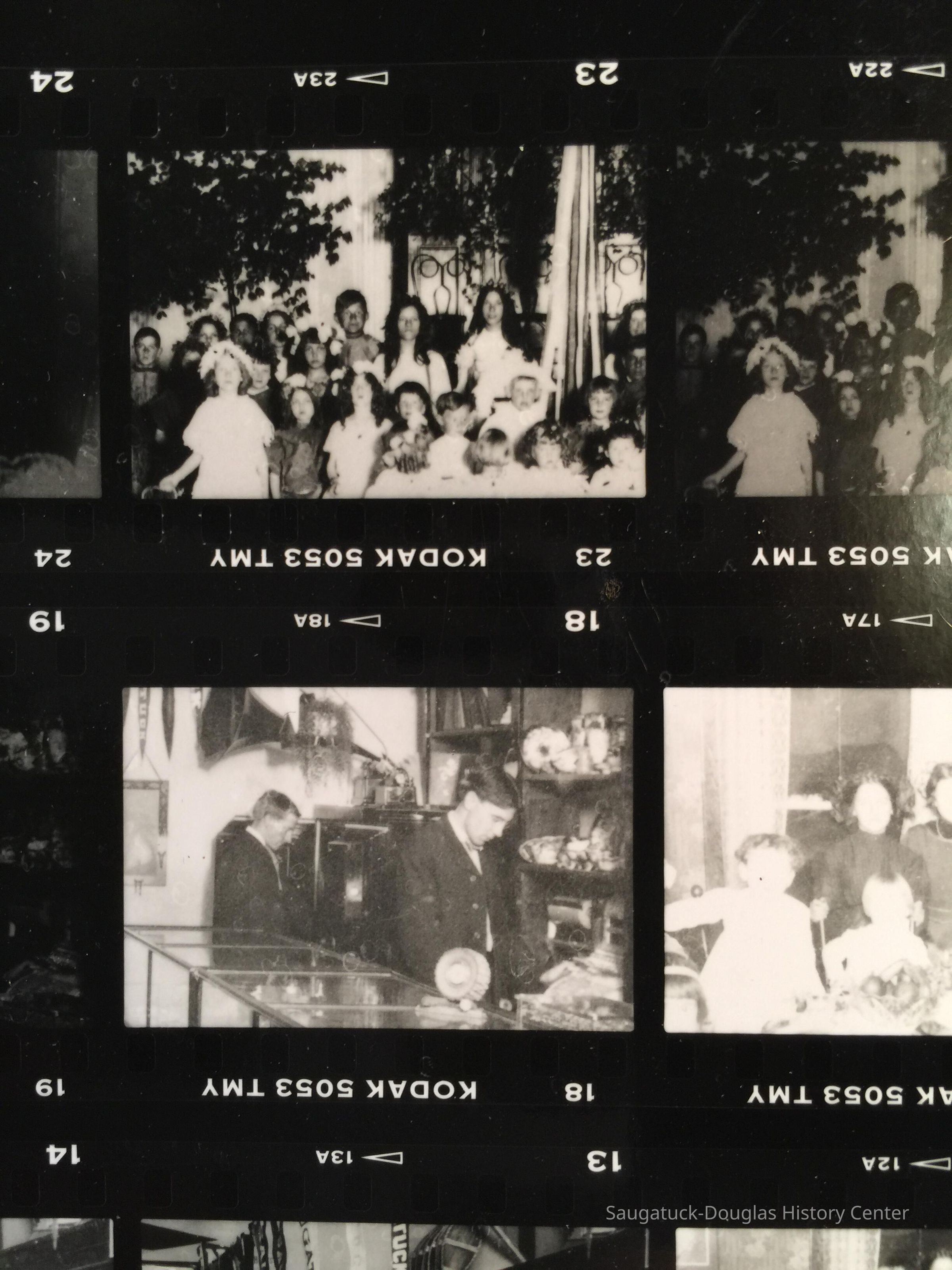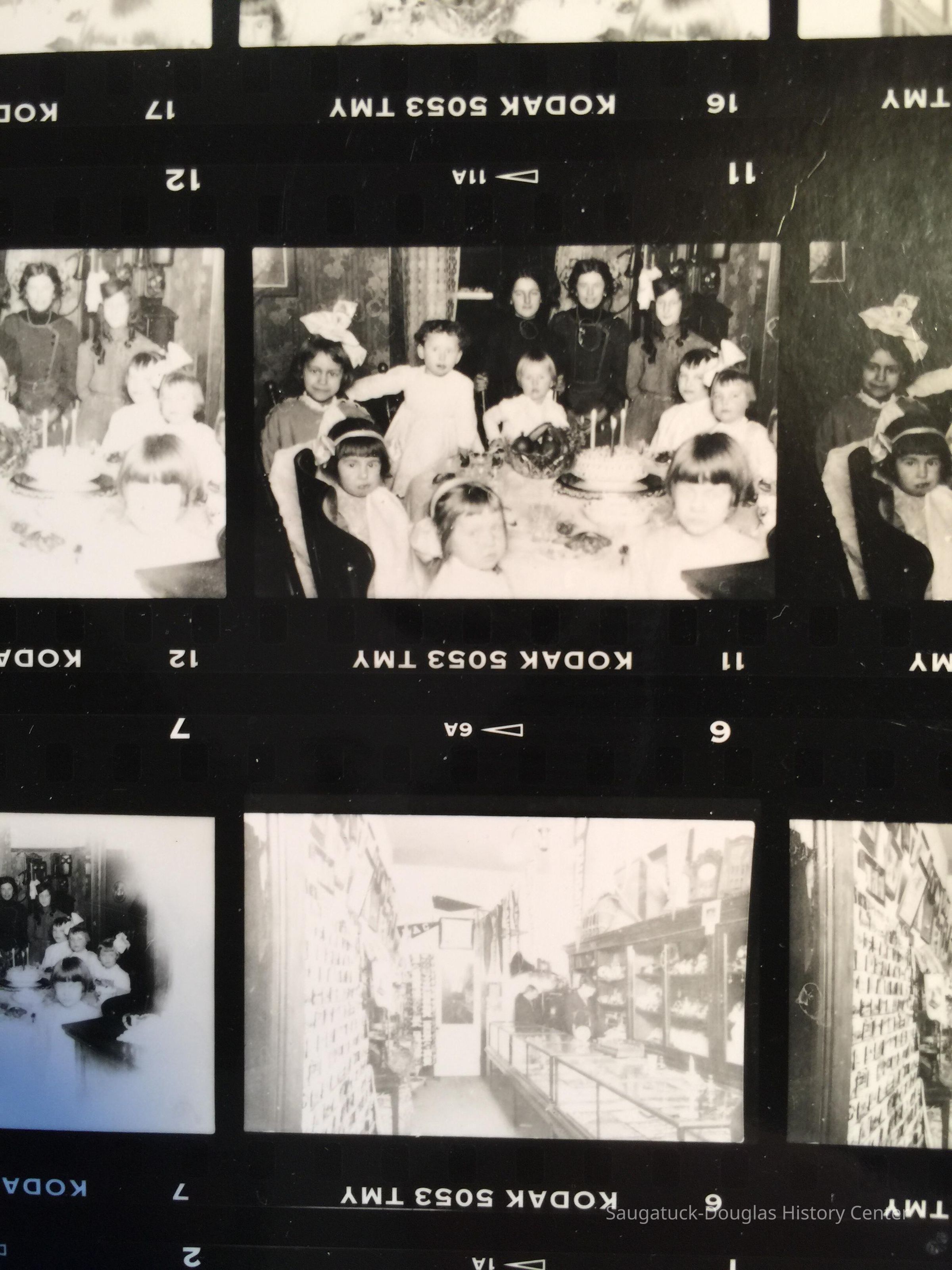 A sheet of 35mm negatives with various exposures of historical images of young men behind the counter of a narrow store with china, gramophones and Saugatuck banners on display, children in costumes for a pagaent and a children's birthday party table. Source unknown. Jotted on the envelope from Lakewood Photo is a note from Jim Schmiechen "From Museum. Don't know what it is. Marsha Kontio might know. - her old store building?"