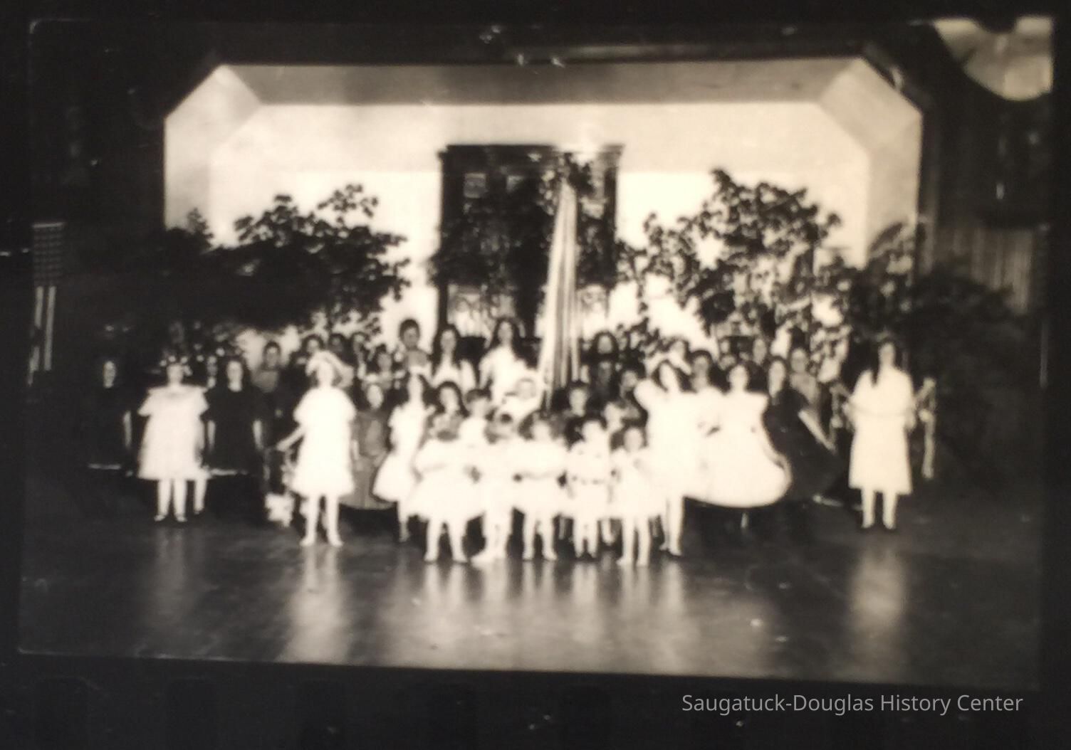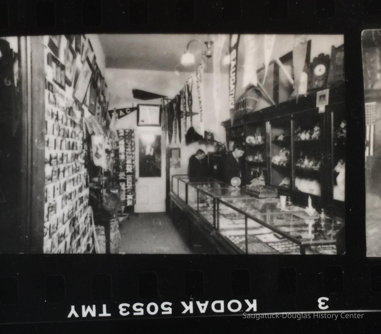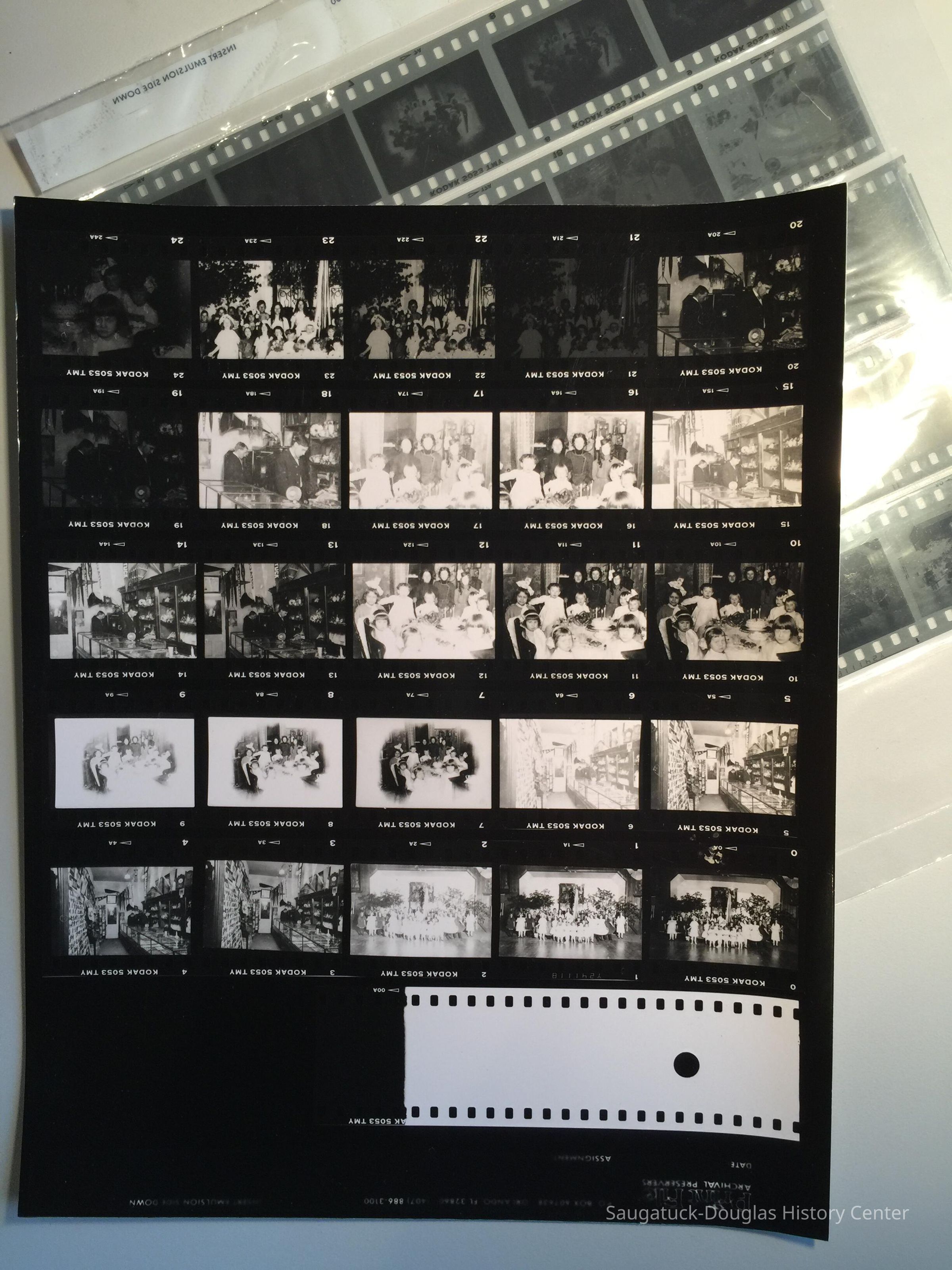 A sheet of 35mm negatives with various exposures of historical images of young men behind the counter of a narrow store with china, gramophones and Saugatuck banners on display, children in costumes for a pagaent and a children's birthday party table. Source unknown. Jotted on the envelope from Lakewood Photo is a note from Jim Schmiechen "From Museum. Don't know what it is. Marsha Kontio might know. - her old store building?"