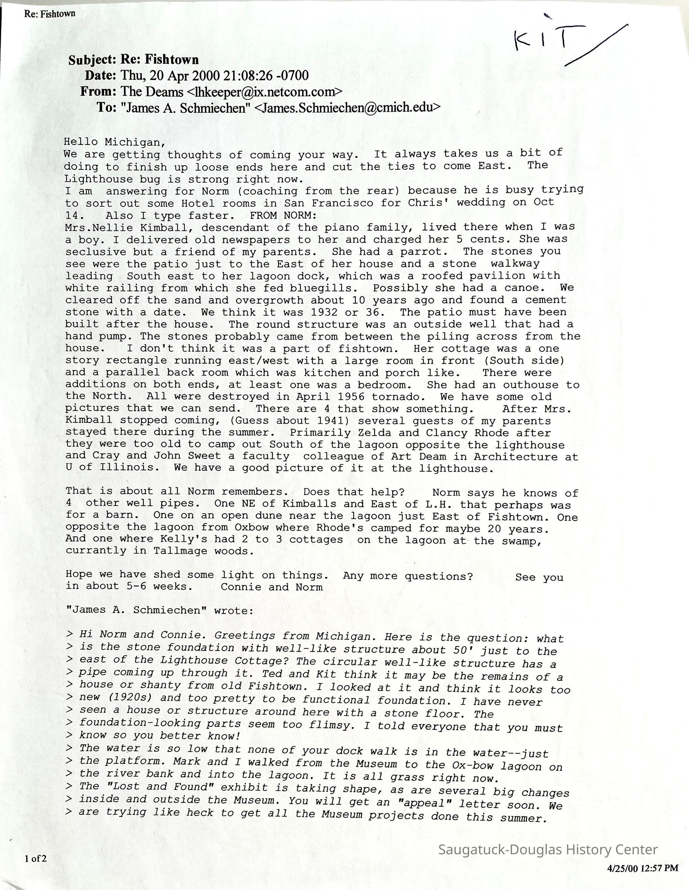 The round structure was an outside well that had a hand pump. The stones probably came from between the pilings across from the house. I don't think it was part of Fishtown. Her cottage was a one story rectangle running east-west with a large room in front on the south side and a parallel back room which was a kitchen and porch. There were additions on both ends and at least one was a bedroom. She had an outhouse to the north. After Mrs. Kimball stopped coming about 1941, several guests of my parents stayed there during the summer. The old Kimball cottage was destroyed in the April, 1956 tornado that leveled the lighthouse."