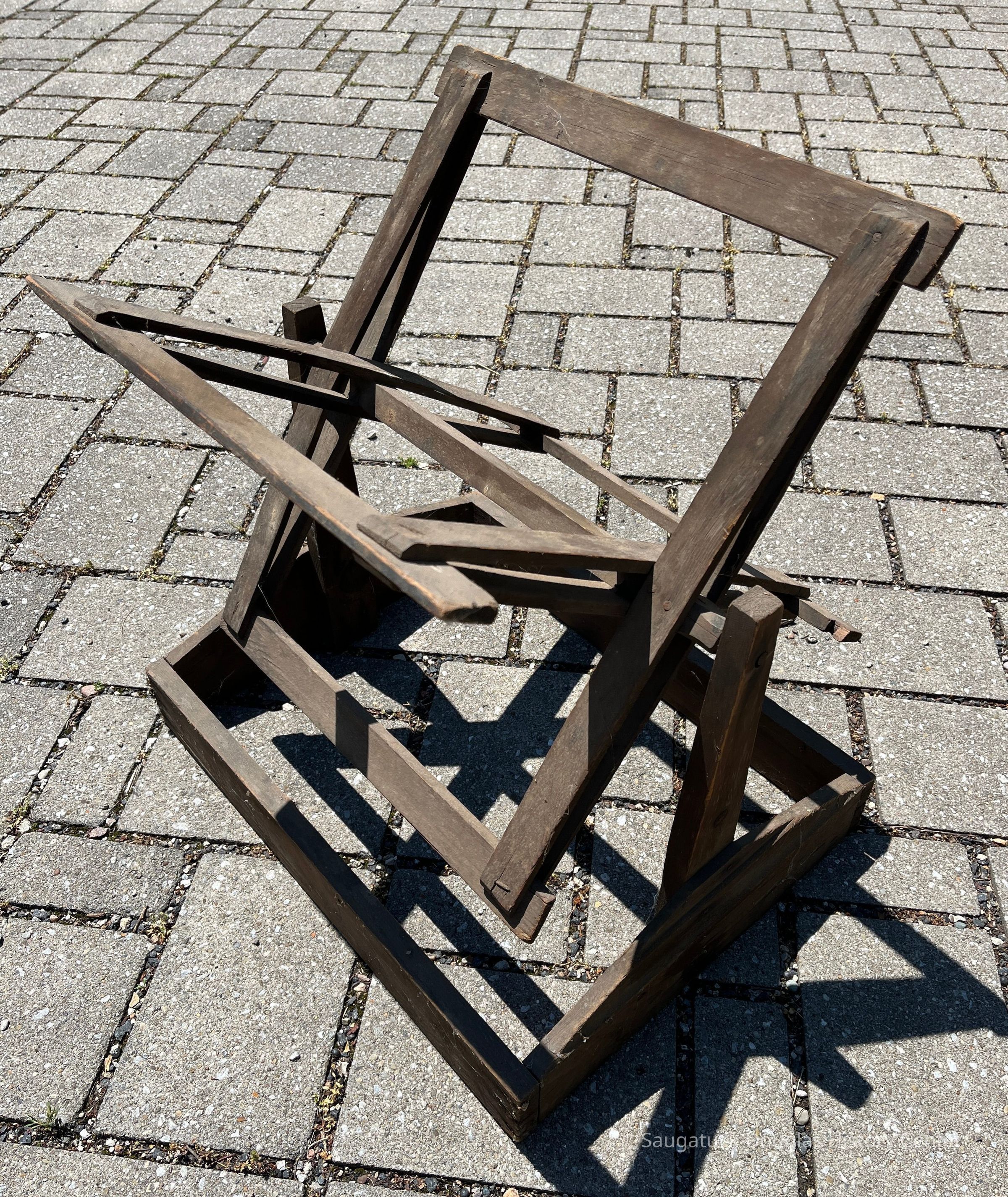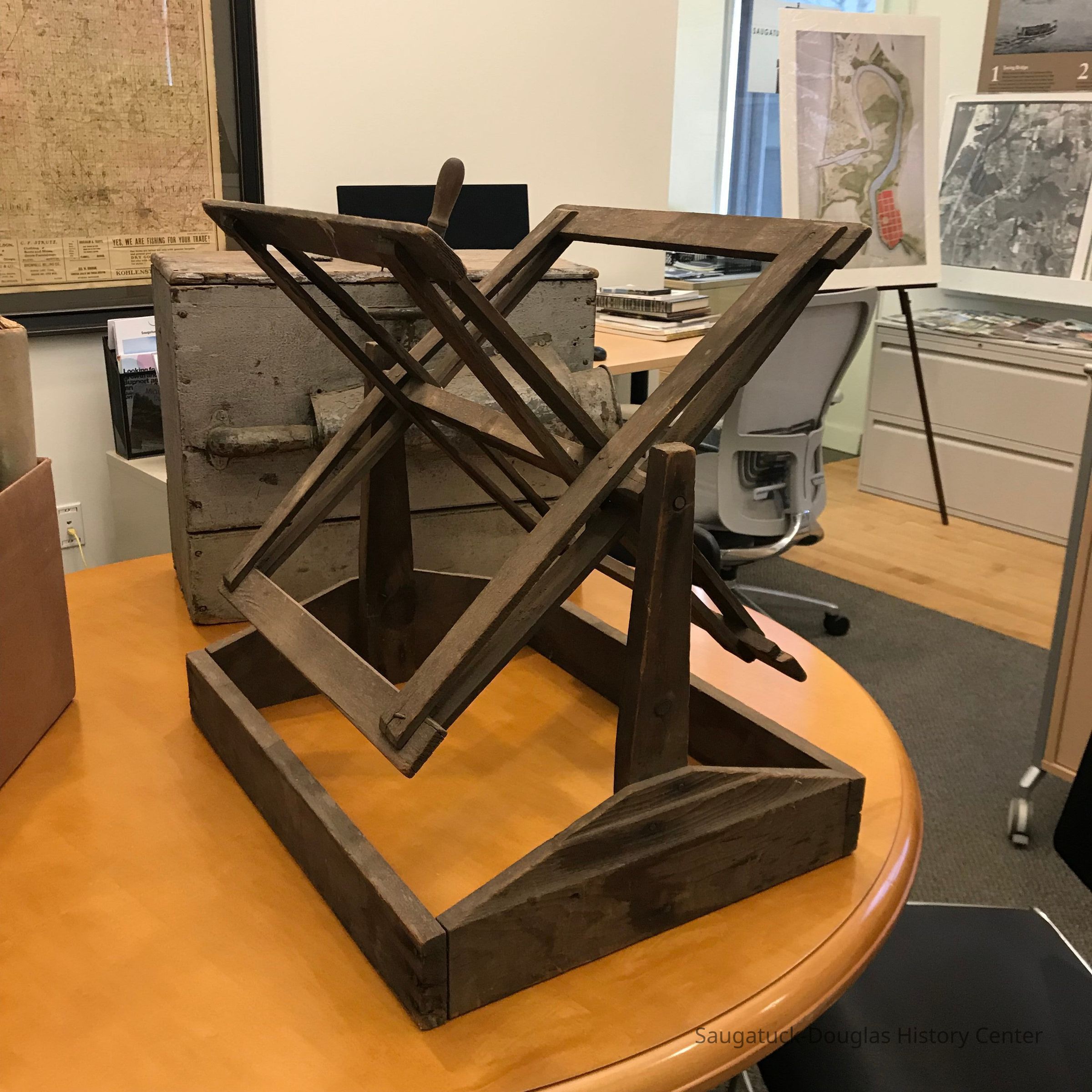 Diminutive wooden net drying reel with a rectangular base and rotating rack with four crossbars. The reel is held together with nails and staples and is of a similar design to the larger reels once common on the Saugatuck docks.Context