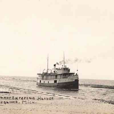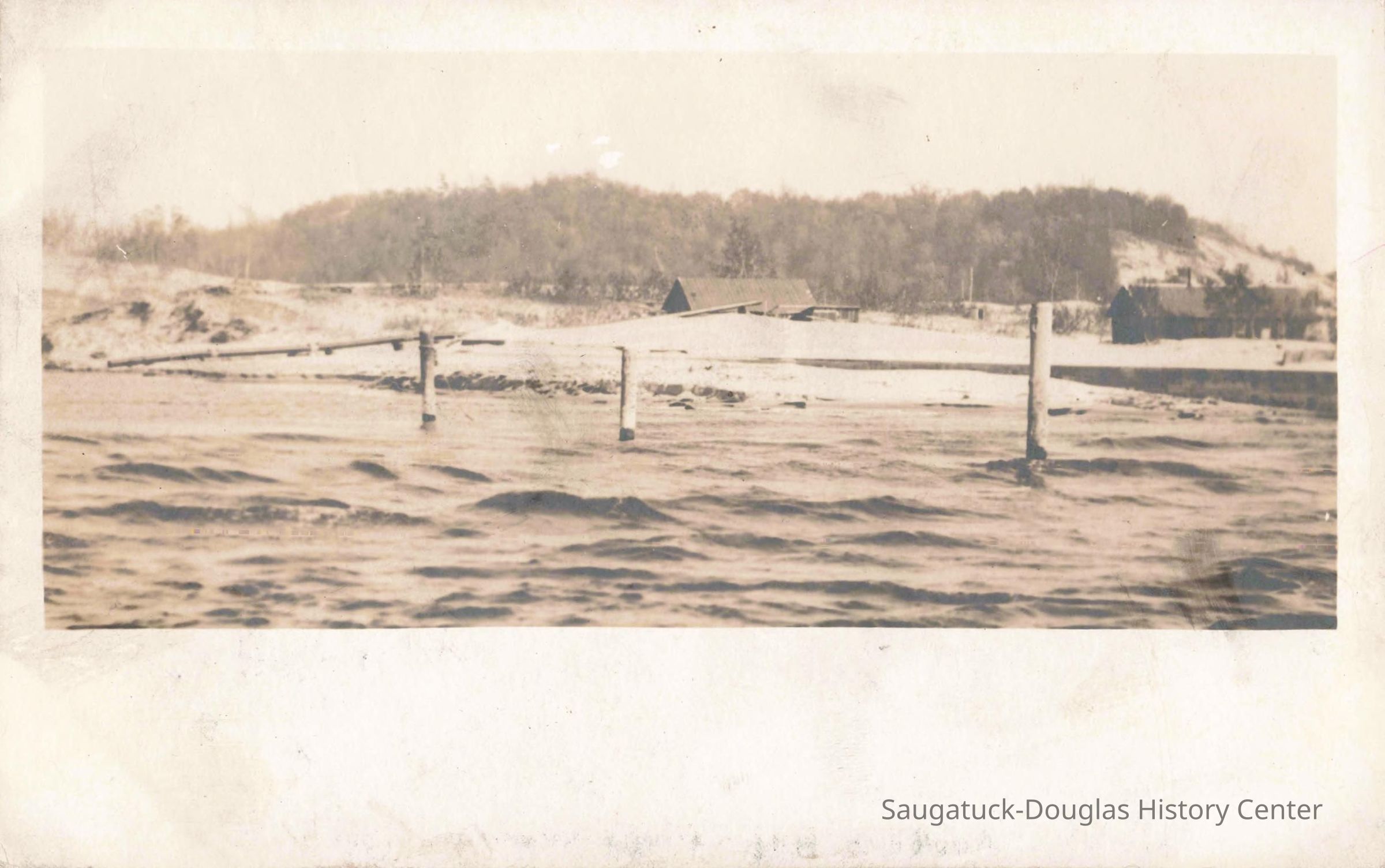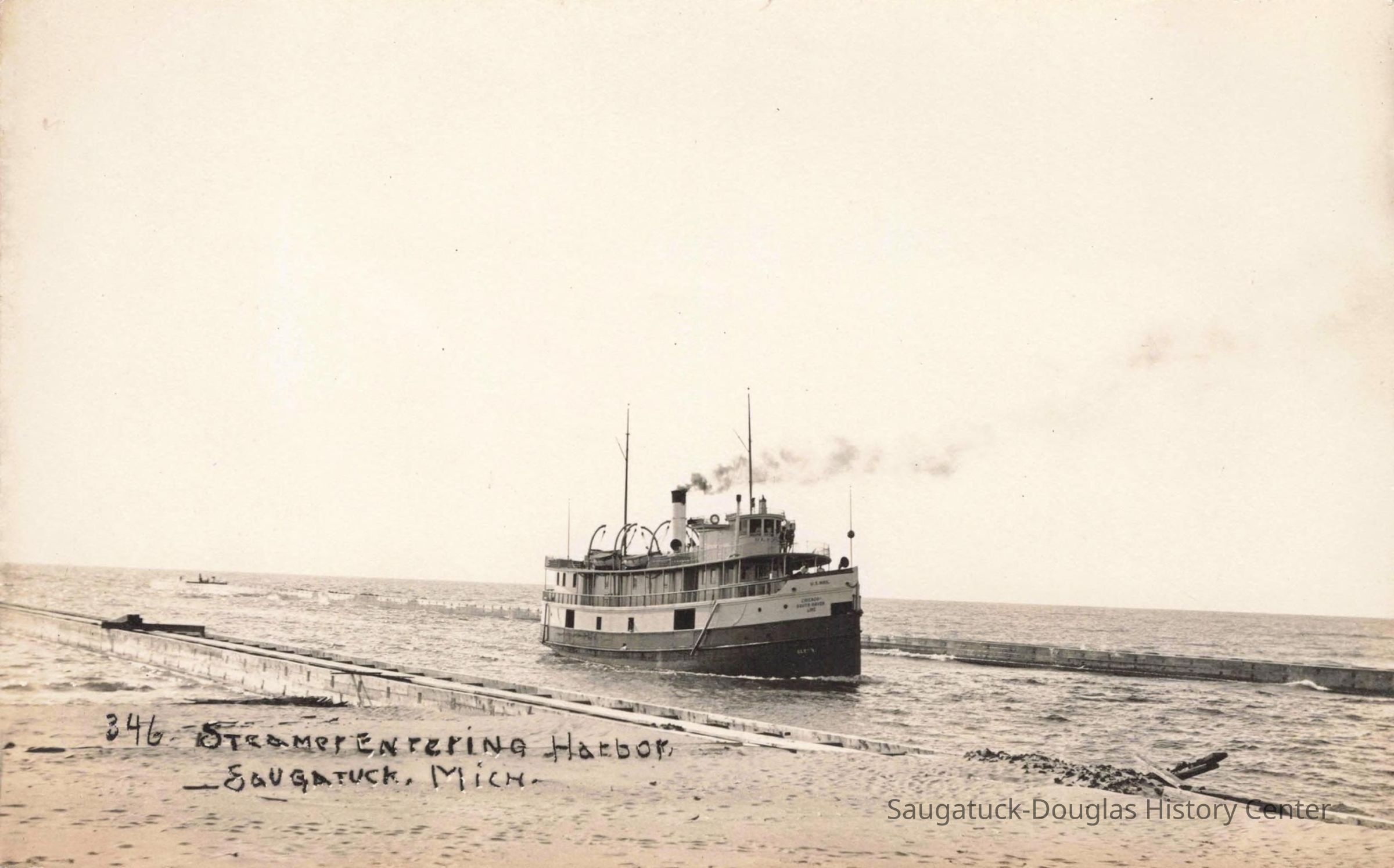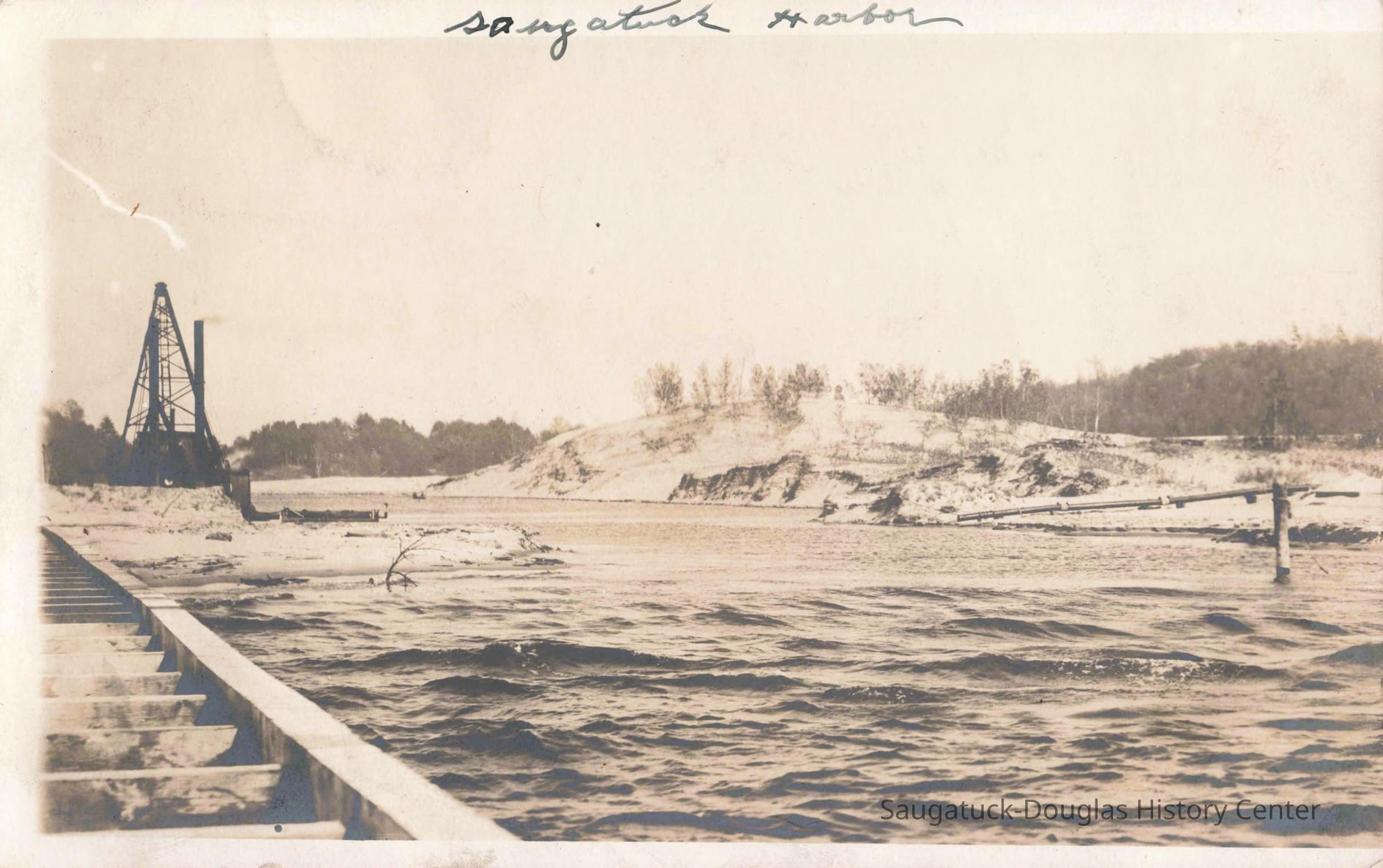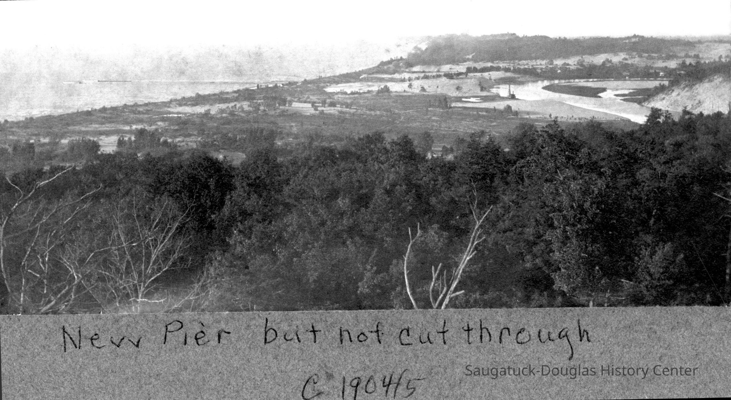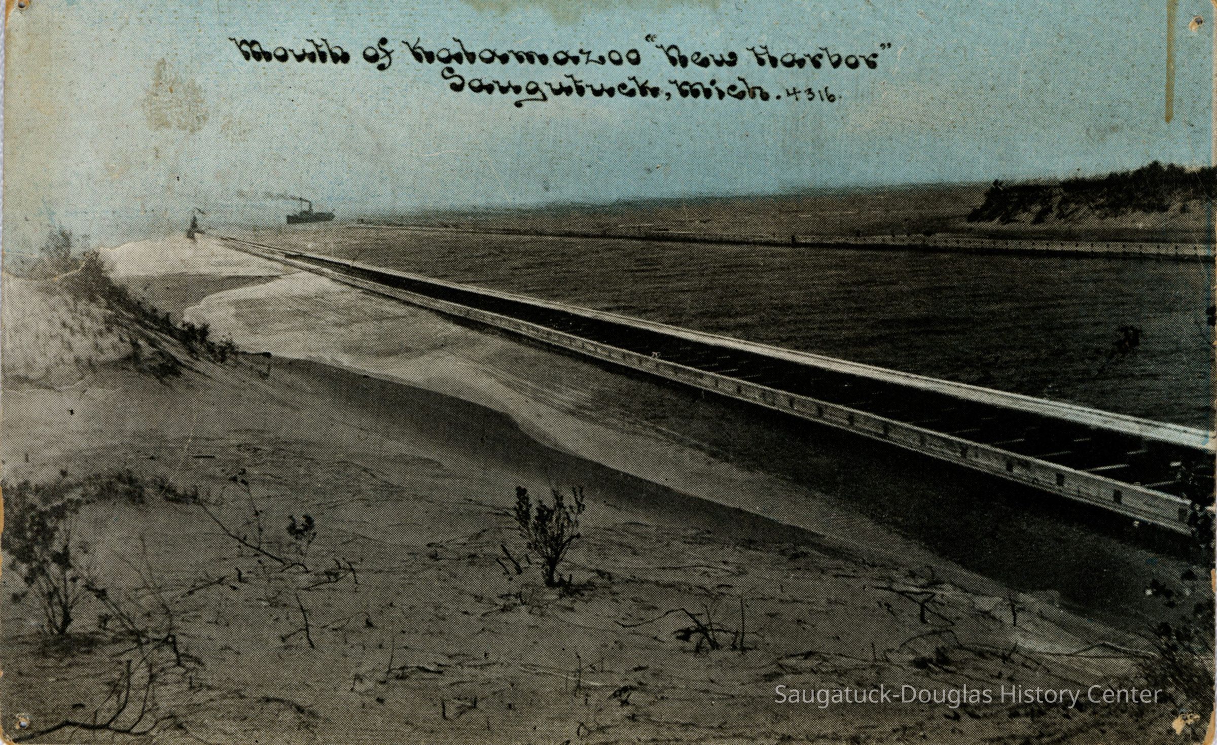 Images of the new Kalamazoo River outlet channel and protective breakwater/piers that were completed in 1904 after much lobbing by Saugatuck townspeople.Photograph Details
