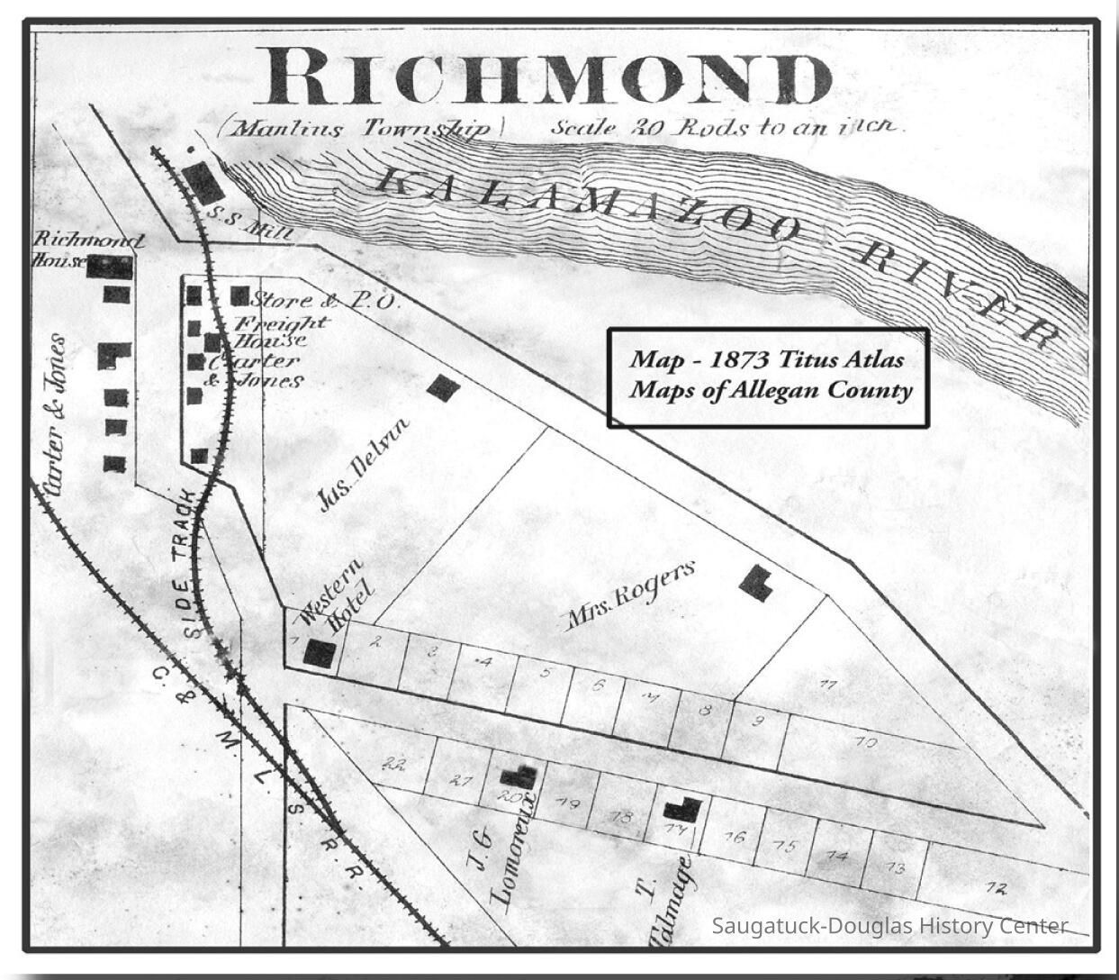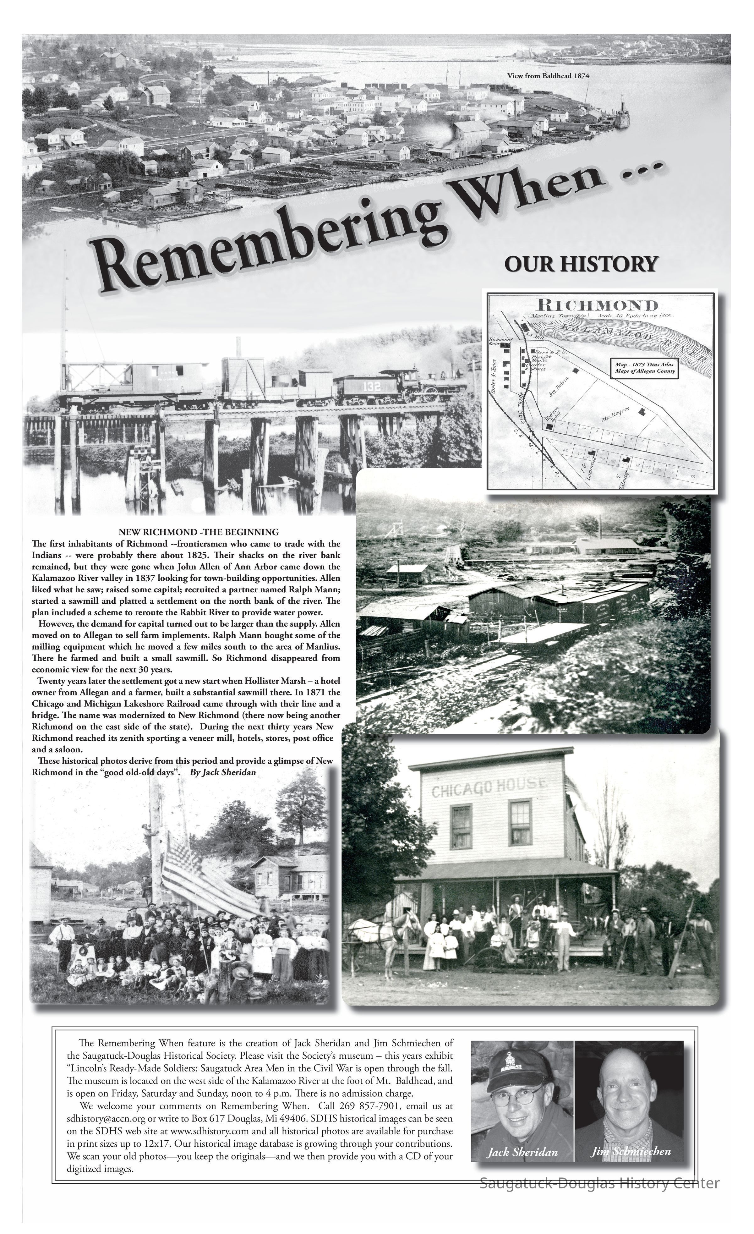 Twenty years later the settlement got a new start when Hollister Marsh – a hotel owner from Allegan and a farmer, built a substantial sawmill there. In 1871 the Chicago and Michigan Lakeshore Railroad came through with their line and a bridge. The name was modernized to New Richmond (there now being another Richmond on the east side of the state). During the next thirty years New Richmond reached its zenith sporting a veneer mill, hotels, stores, post office and a saloon.