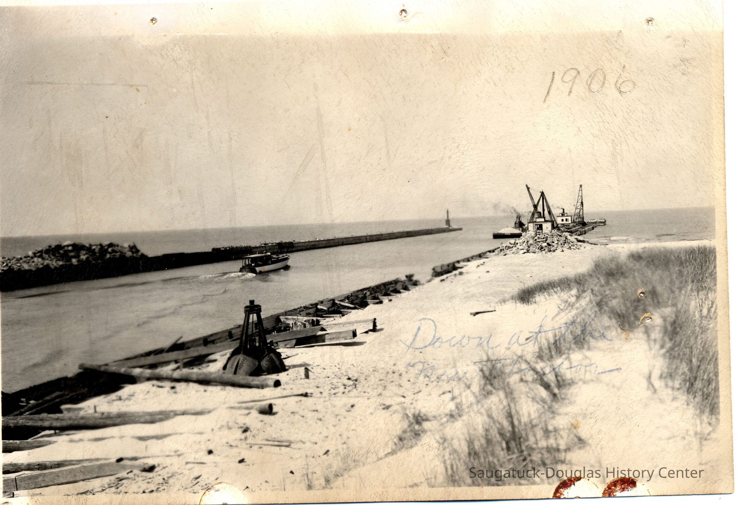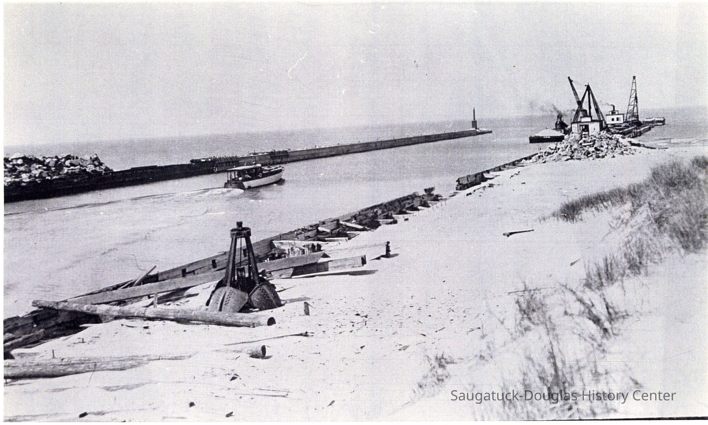 A motor boat cruises toward Lake Michigan, passing between the Saugatuck harbor piers. At the north side pier a dredging team is at work, smoke rising from their chimneys. A digging/excavation grab from a dredging rig is resting on the sand closer to the camera.